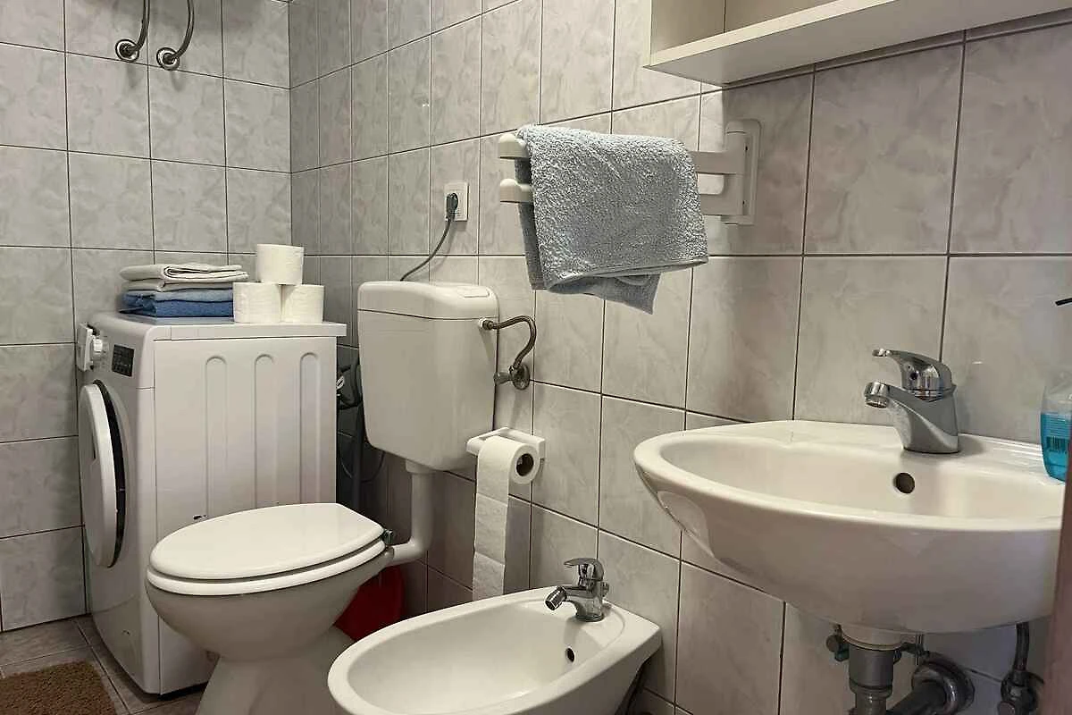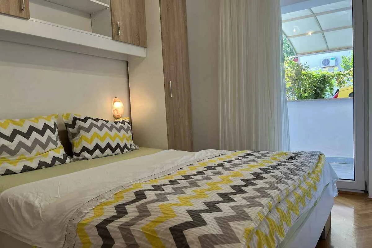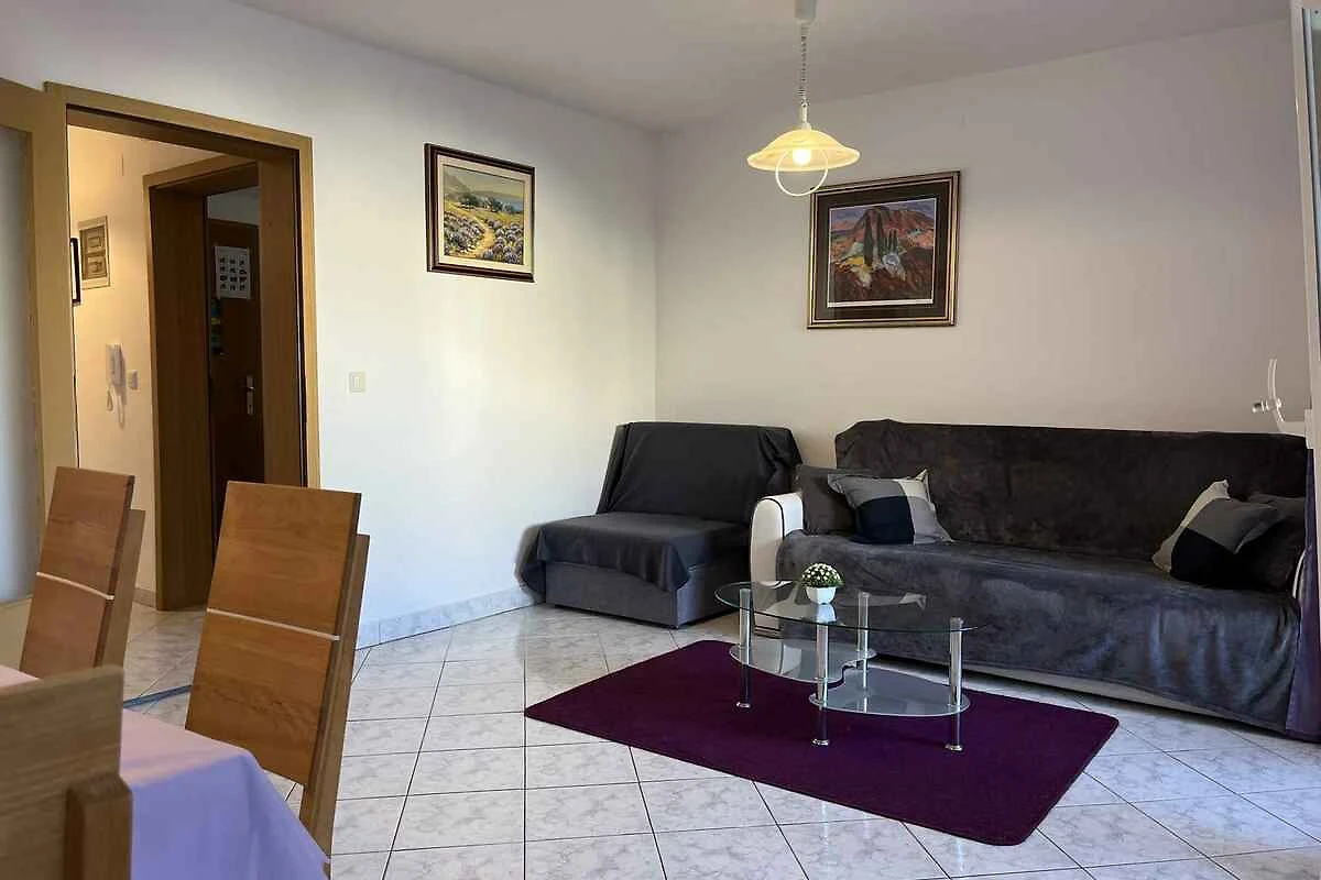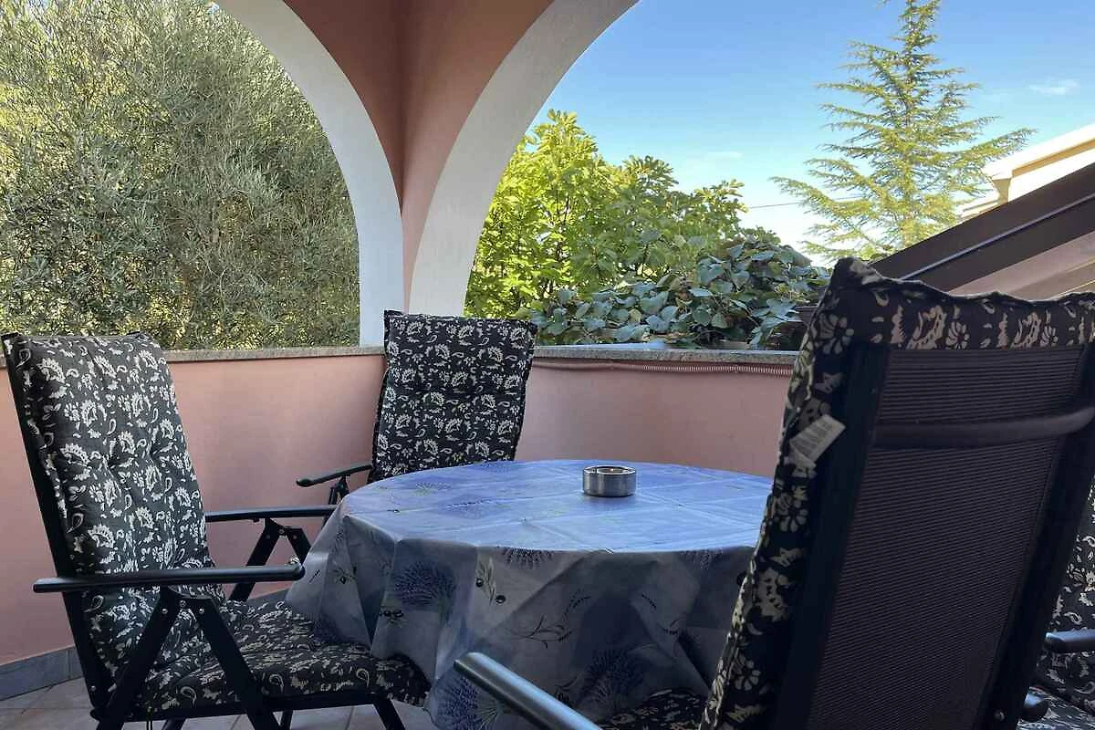 Malinska. L' appartamento vacanze si trova in una proprietá aperta, grande 50 mq con fiori e arbusti. Il padrone di casa vive stabilmente nella casa, ma usa un ingresso separato. L'accesso avviene vicino a una strada secondaria (asfaltata). Parcheggio (per 1 auto) in posto auto coperto.