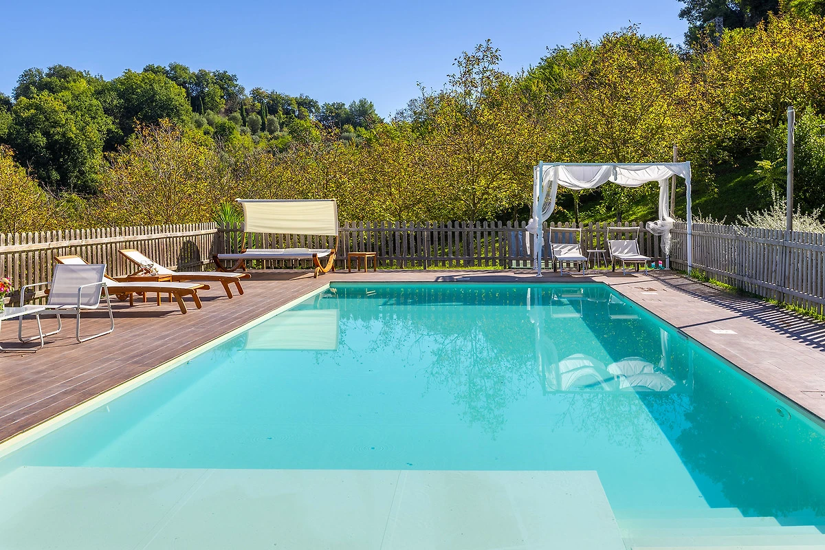Accanto alla villa si trova un ampio giardino con piscina recintata. Accedendo all’area piscina tramite la sua “beach entry” si può fare un tuffo con vista e godersi il sole sui lettini che la circondano. Sotto uno dei due portici che corrono lungo i due lati principali dell’edificio, si trova la zona pranzo – perfetta per i vostri pranzi e cene all’aperto – e comodi divani dove rilassarsi e godersi le lunghe giornate estive in compagnia di famiglia e amici.