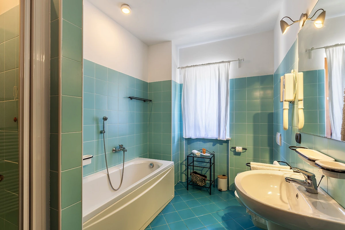 - una camera matrimoniale con un divano letto singolo per bambini e bagno privato con doccia e vasca;