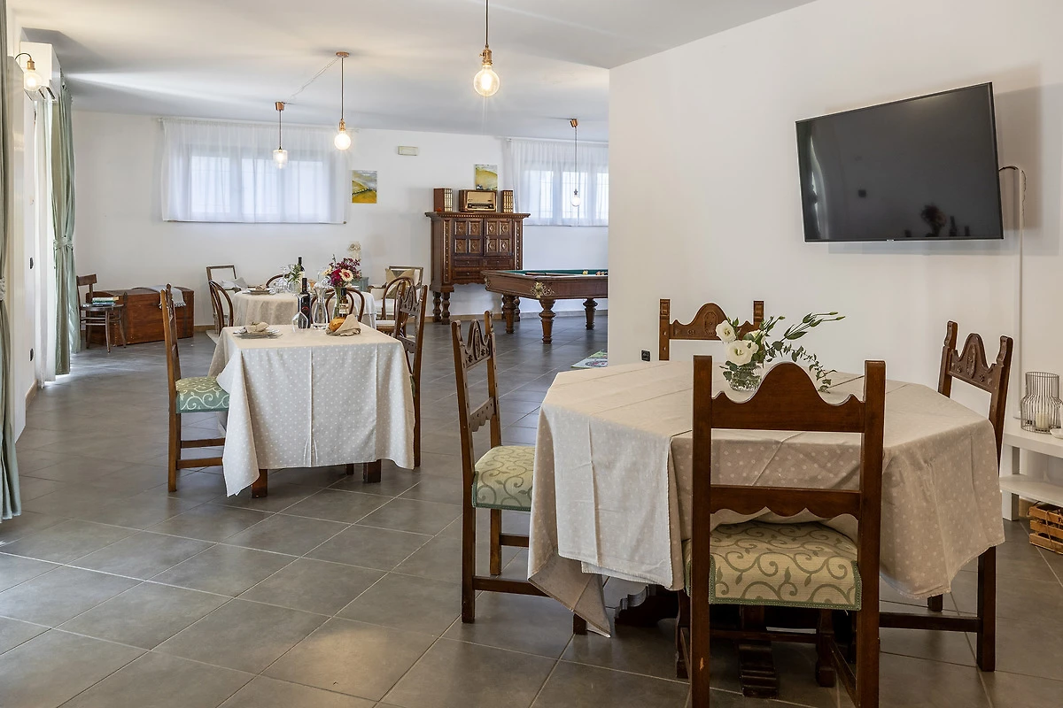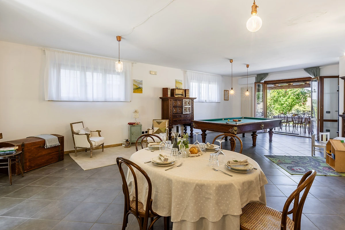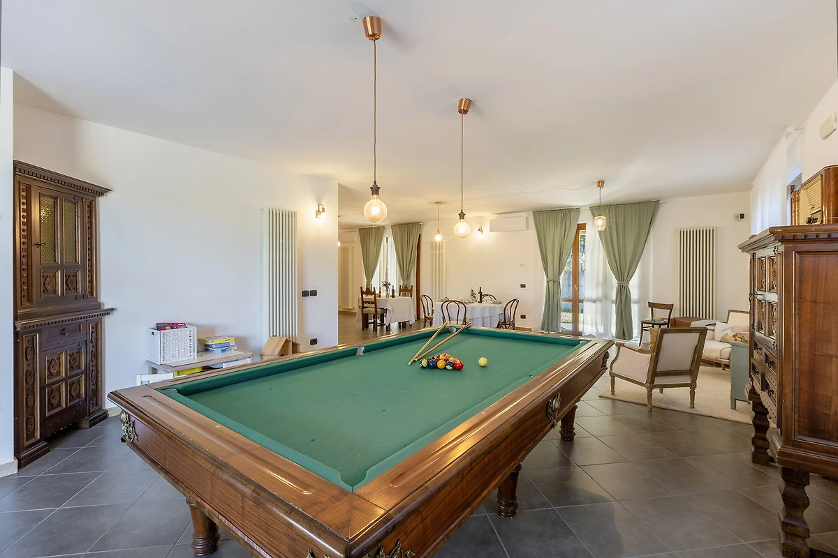 - una grande sala da pranzo con TV, tavolo da biliardo e accesso diretto alla zona pranzo esterna sotto il portico;