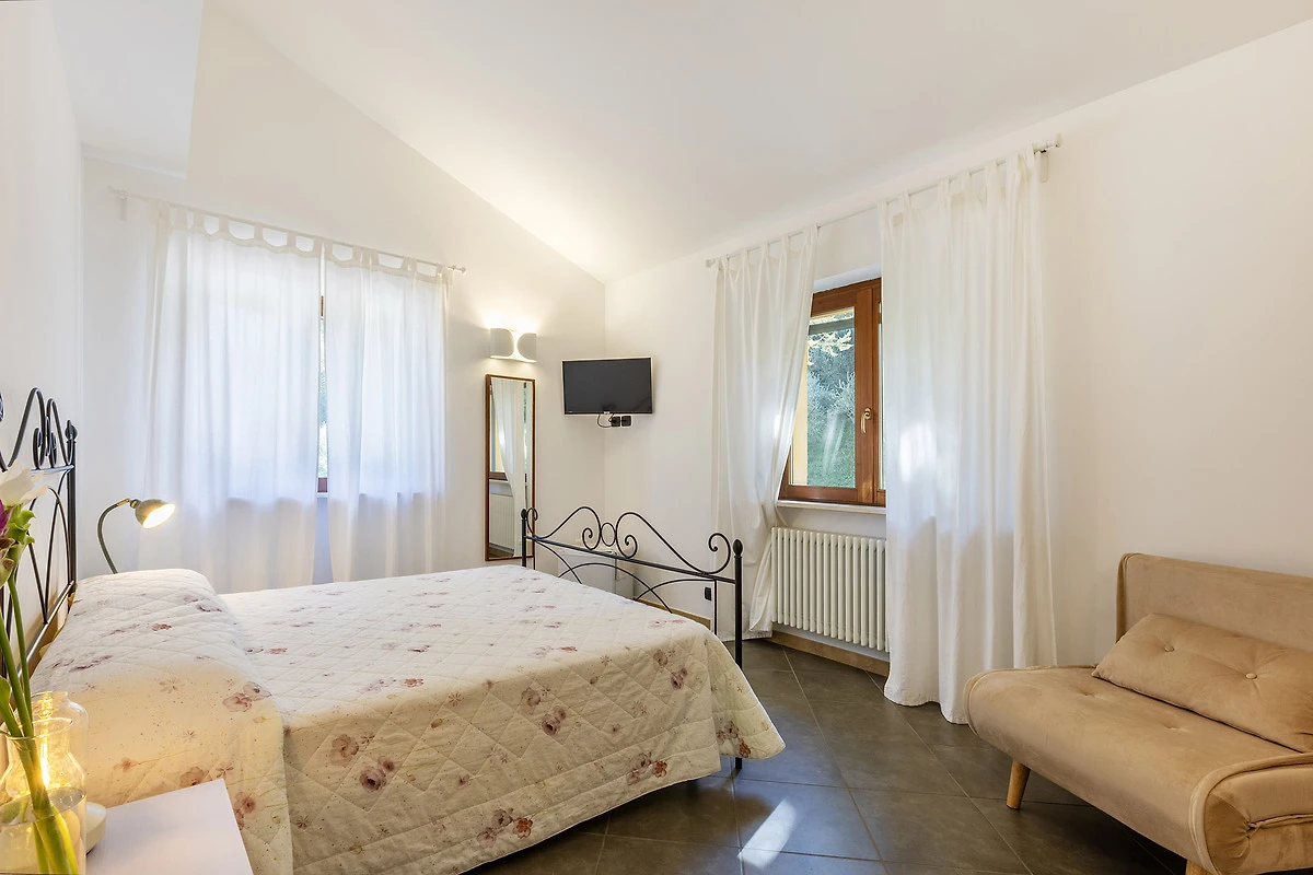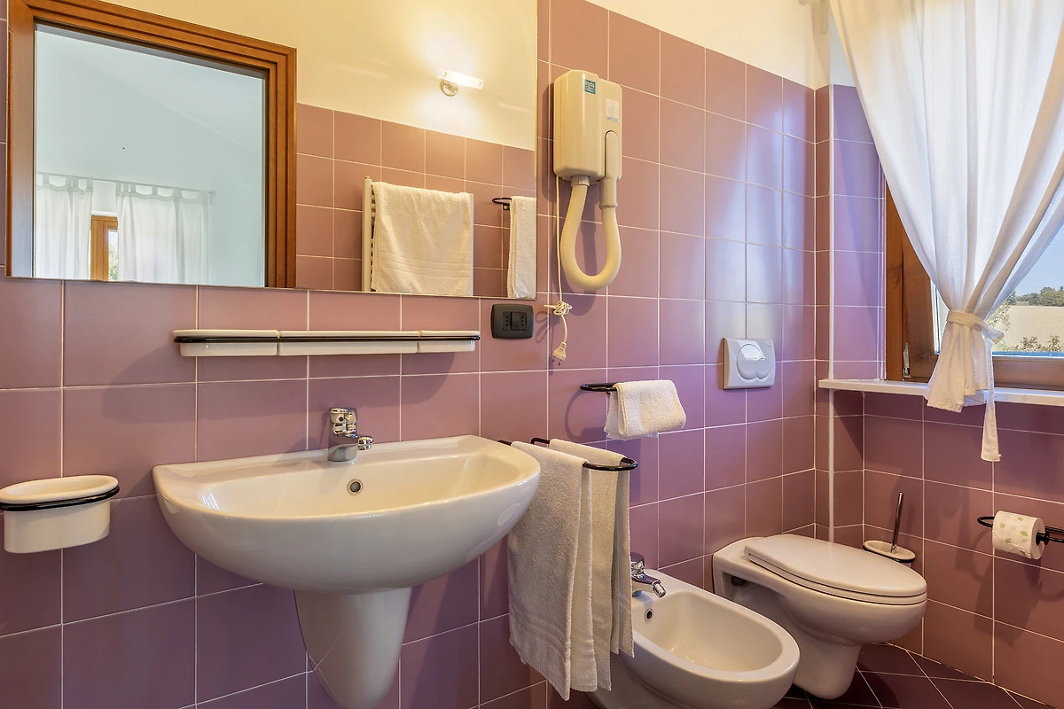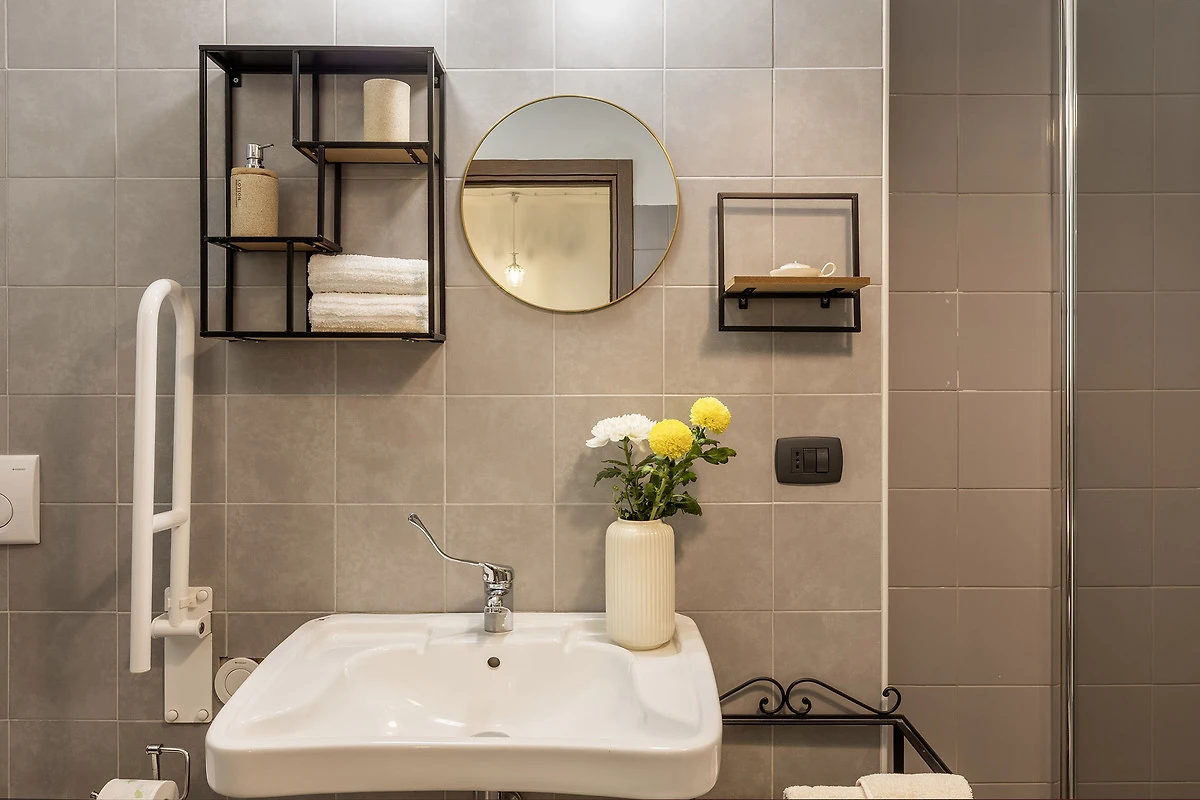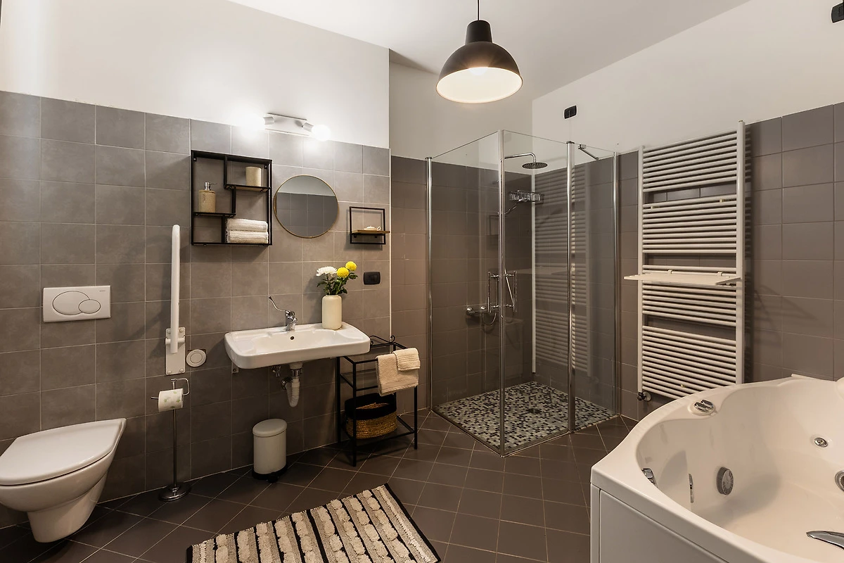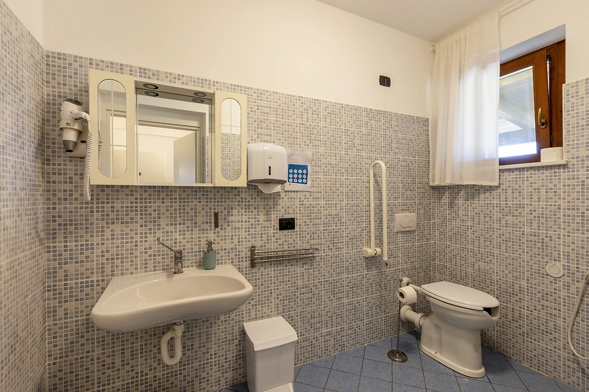 - una camera matrimoniale con bagno privato dotato di vasca idromassaggio e doccia accessibile a persone con disabilità;