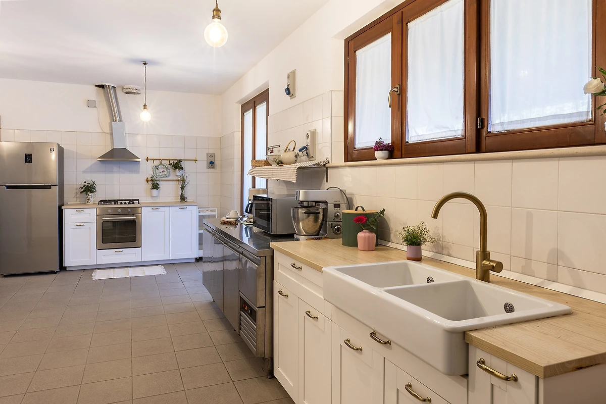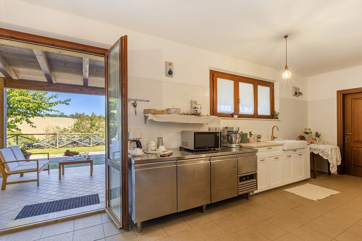 - una cucina con lavastoviglie industriale, forno, frigorifero, microonde e accesso diretto al portico e al giardino;
