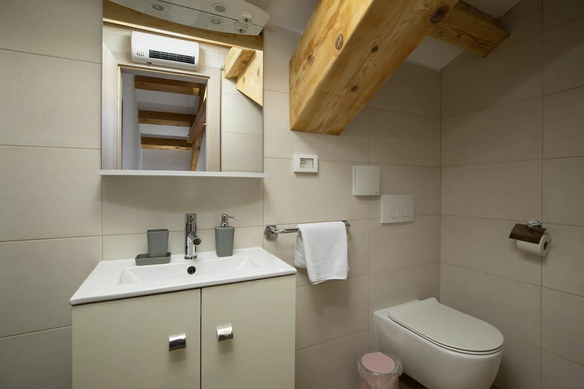 Il primo piano è suddiviso in due aree separate, ciascuna accessibile tramite una propria scala. Una zona dispone di una camera da letto con un letto matrimoniale e un letto singolo, mentre l’altra zona comprende due camere da letto ciascuna con un letto matrimoniale e un letto singolo, che condividono un bagno con doccia.