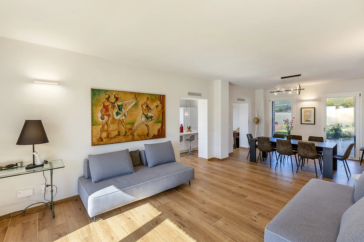 - un soggiorno con divani e tavolo da pranzo e accesso diretto al giardino;