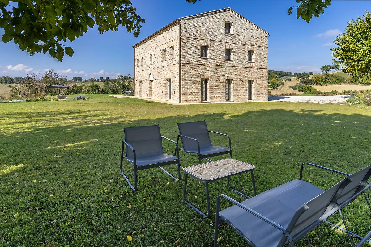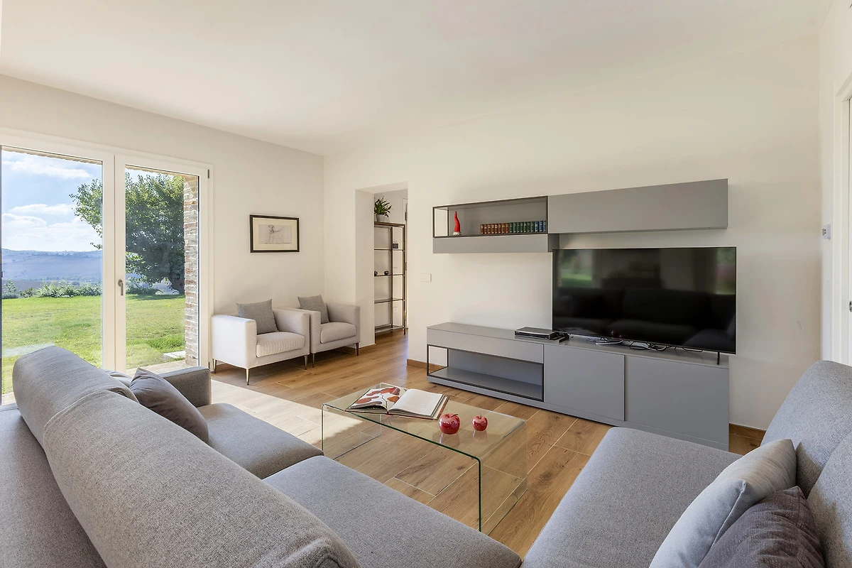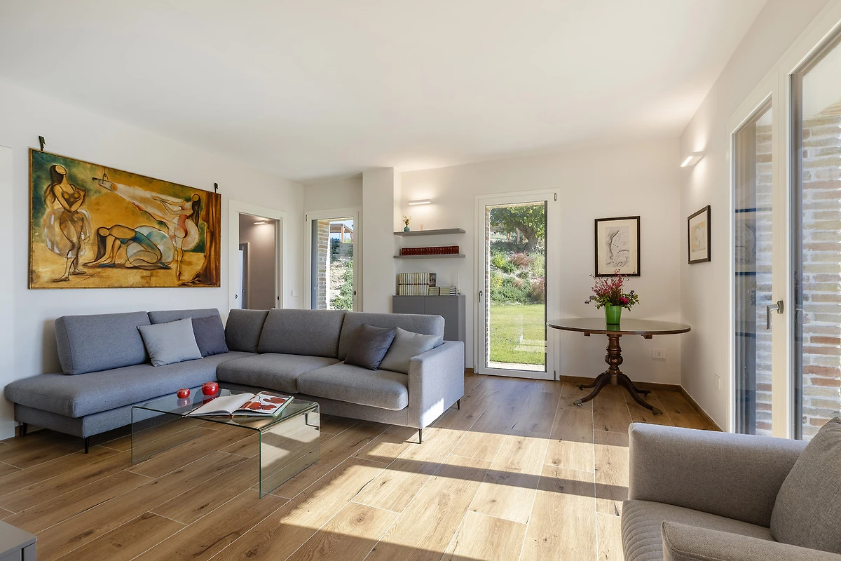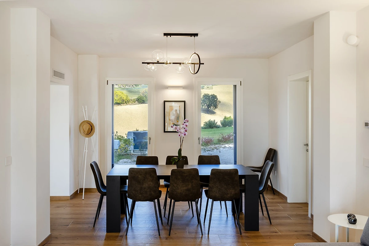 Nel cuore delle colline delle Marche, Villa Essenza si distingue per il suo stile moderno ed elegante. Grazie ai suoi ampi spazi, la villa è adatta a gruppi di amici o famiglie che desiderano trascorrere insieme momenti piacevoli, senza rinunciare a privacy e tranquillità. Disposta su 3 livelli collegati da una scala interna, la villa può ospitare fino a 12 persone. Il piano terra è composto da:
