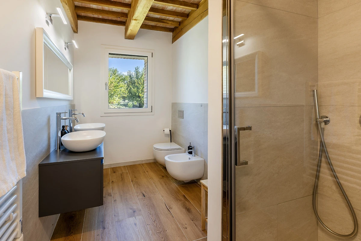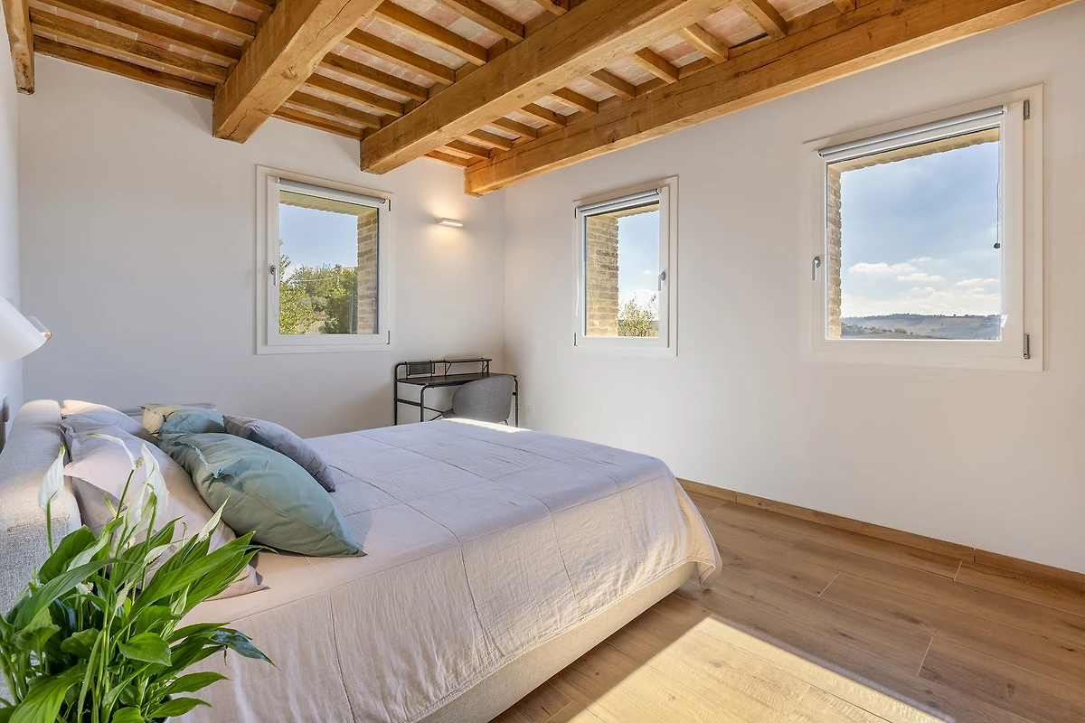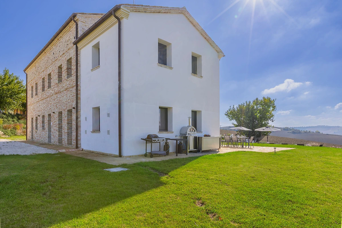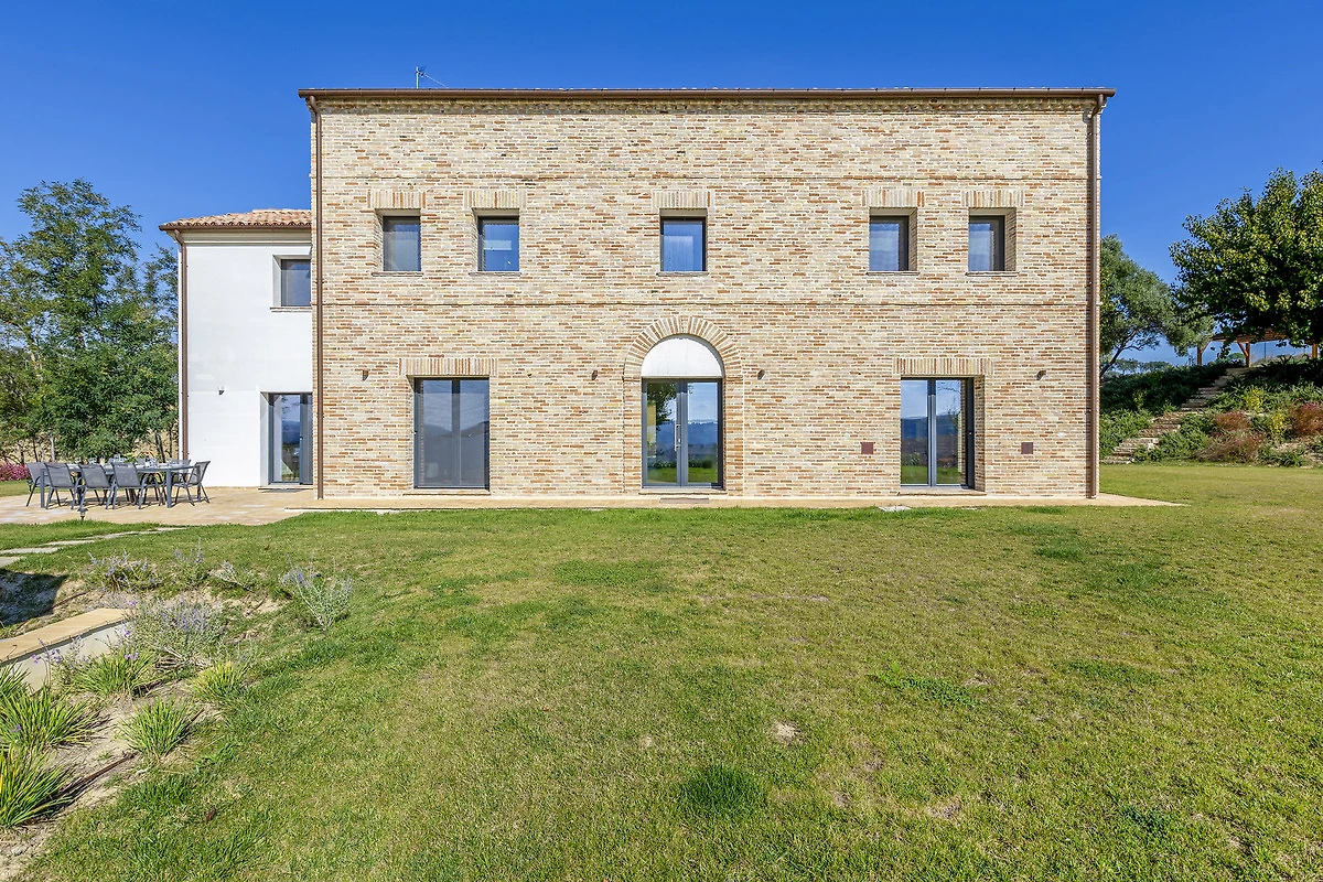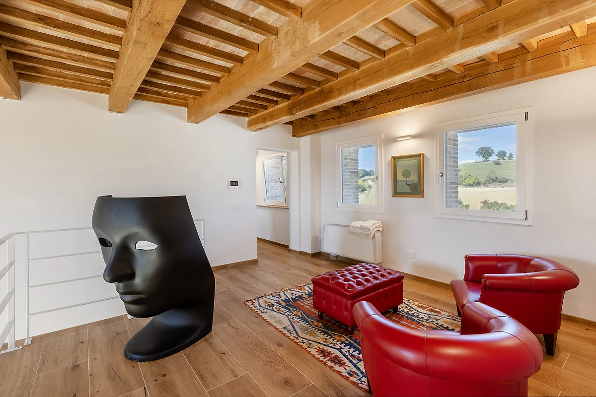 Nel cuore delle colline delle Marche, Villa Essenza si distingue per il suo stile moderno ed elegante. Grazie ai suoi ampi spazi, la villa è adatta a gruppi di amici o famiglie che desiderano trascorrere insieme momenti piacevoli, senza rinunciare a privacy e tranquillità. Disposta su 3 livelli collegati da una scala interna, la villa può ospitare fino a 12 persone. Il piano terra è composto da: