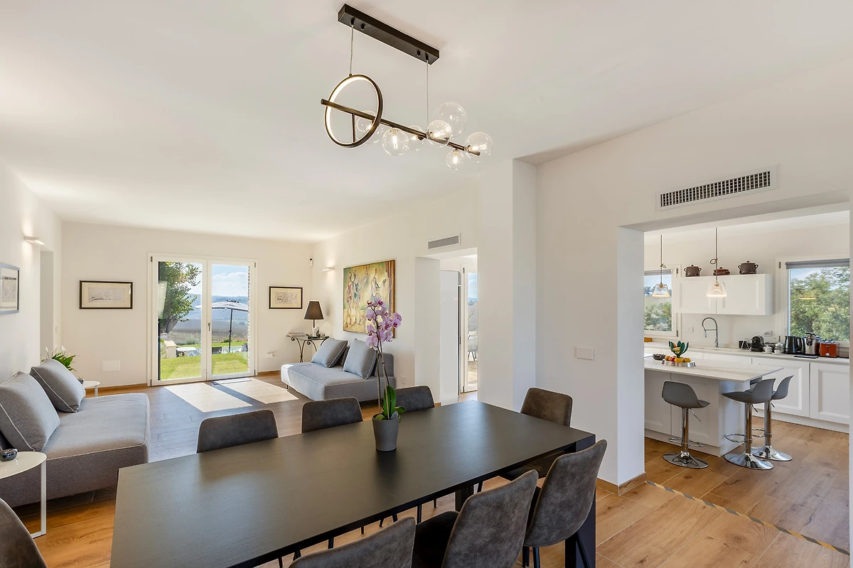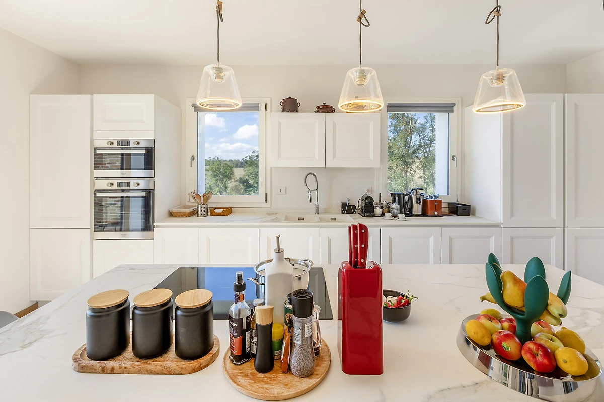 - una cucina con vista panoramica, ben illuminata con una grande isola cottura con piano a induzione, forno, frigorifero, lavastoviglie e accesso diretto al giardino e alla zona pranzo esterna;