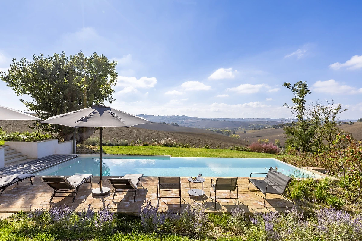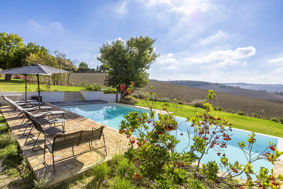 Davanti alla villa, circondata da un grande giardino e alberi da frutto, si trova la piscina a sfioro depurata a sale con una zona bassa, ideale per bambini o per momenti di relax. La piscina ist mit Sonnenschirmen und -liegen ausgestattet. Tauchen Sie ins Wasser ein, um die atemberaubende Aussicht auf die umliegenden Hügel zu genießen. Nicht weit vom Pool befindet sich ein Maulbeerbaum. Darunter gibt es eine schattige Zone, wo Sie sich entspannen können.