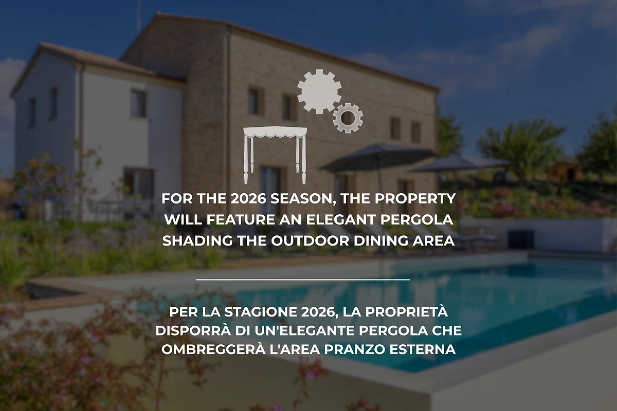 Per la stagione 2026, la proprietà disporrà di un'elegante pergola che ombreggerà l'area pranzo esterna.