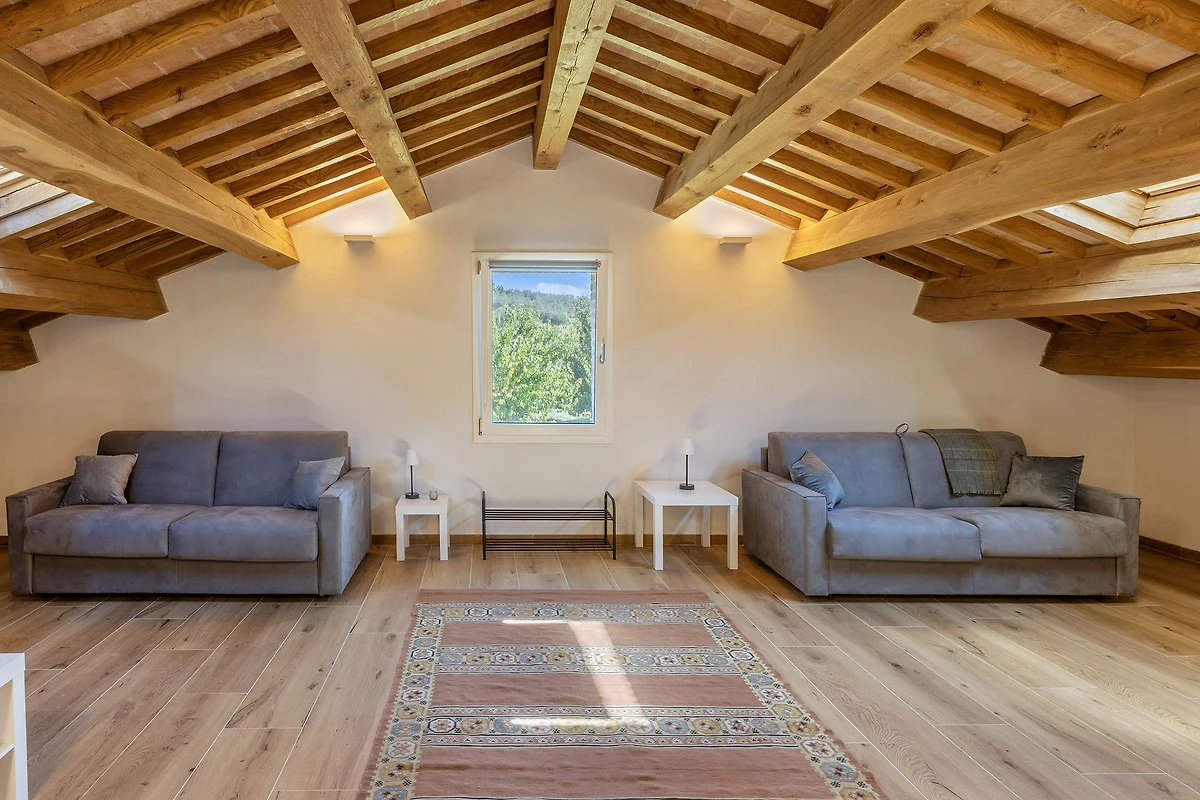- un disimpegno che si affaccia sulla sala biliardo al piano terra, con poltrone e scala interna che conduce alla mansarda.