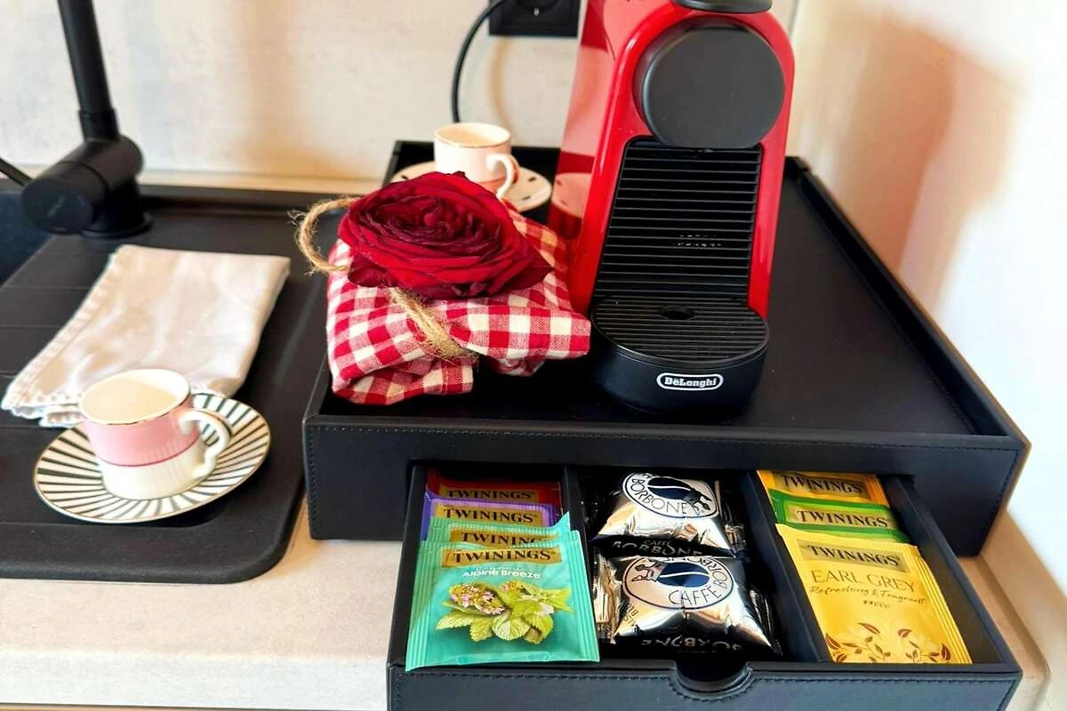 Cucina separata(tavolo da pranzo, bollitore, tostapane, mobile cucina(2 fuochi, ceramica), caffettiera(a capsule), forno a microonde, lavastoviglie, frigorifero(+ congelatore)), Soggiorno/camera da letto(letto matrimoniale, TV, salottino), Bagno(doccia, lavandino, WC, asciugacapelli), asciugabiancheria(in comune con altri ospiti), lavatrice(in comune con altri ospiti), giardino(in comune con altri ospiti), mobili da giardino, barbecue(in comune con altri ospiti), parcheggio, tappeto elastico, giochi per bambini, Altalena