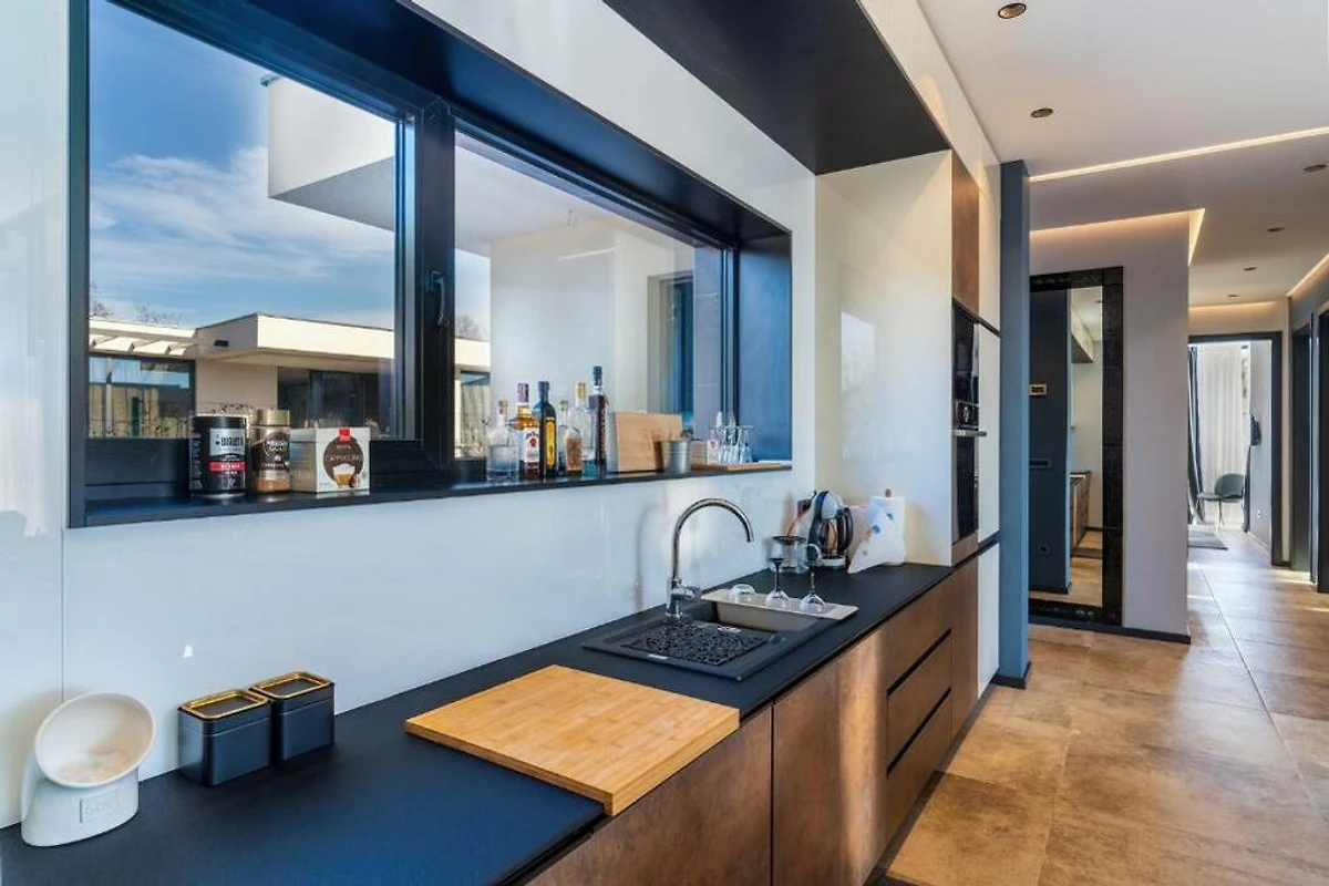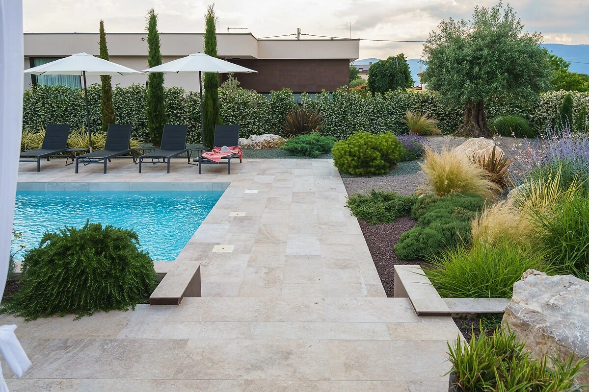 Nel tranquillo luogo Brzac, sulla pittoresca isola di Krk, vi attende la lussuosa Villa Blumarine, una moderna casa vacanze su un unico livello, che con la sua architettura contemporanea, il piano aperto e la raffinata estetica offre una perfetta combinazione di eleganza, comfort e relax. Circondata da rigoglioso verde mediterraneo e dal profumo dei pini, la villa è un rifugio ideale per famiglie o gruppi di amici che cercano tranquillità e privacy. L’area esterna entusiasma con una spaziosa terrazza e una splendida piscina privata, che invita a rinfrescarsi e rilassarsi nelle giornate di sole. Intorno alla piscina si trovano comodi lettini e piccoli tavoli – perfetti per il caffè del mattino o un bicchiere di vino alla sera. La terrazza è parzialmente coperta e arredata con mobili da giardino moderni e una poltrona sospesa – un luogo ideale per leggere o rilassarsi con una leggera brezza marina. Al tramonto, l’area esterna si trasforma in uno scenario incantevole – un’illuminazione suggestiva intorno alla piscina e al verde crea un’atmosfera romantica.