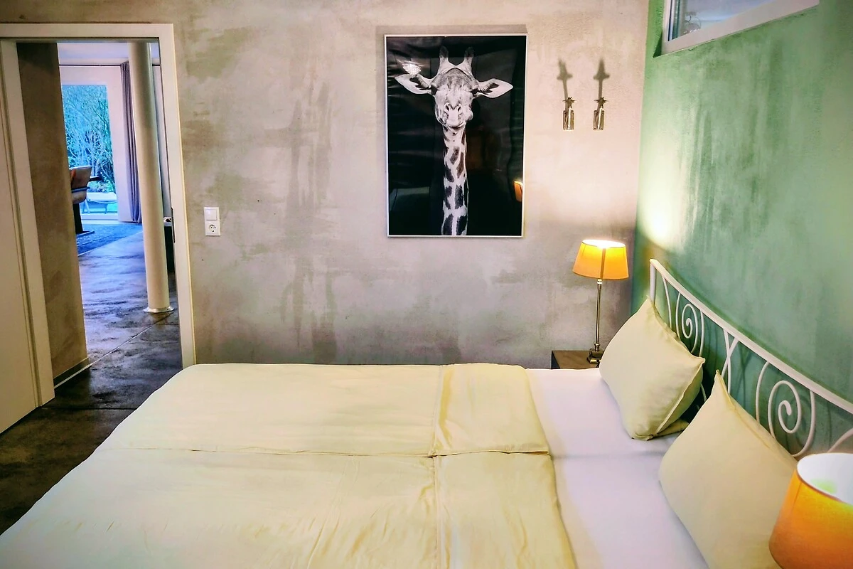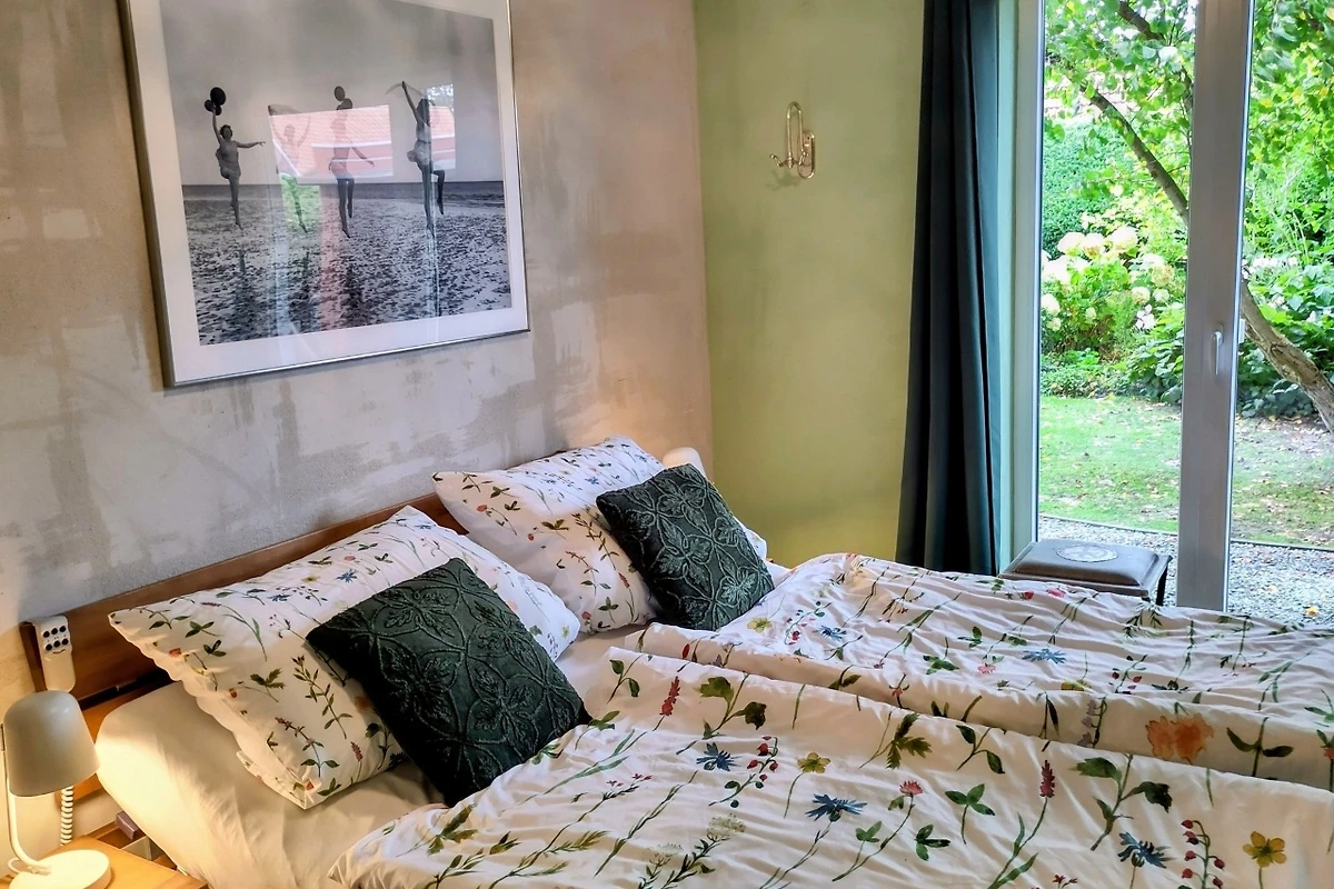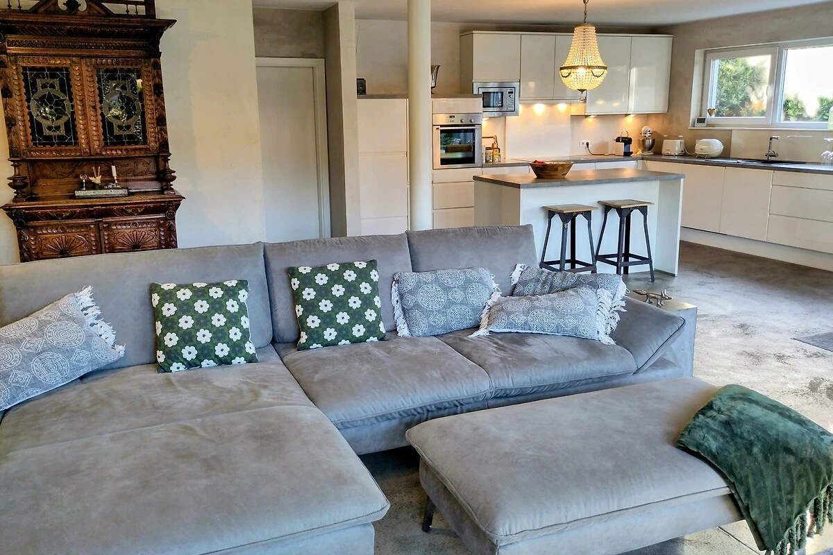 L'appartamento al piano terra dispone di 120 mq di superficie abitabile e offre fino a 4 persone molte possibilità di rilassarsi in splendidi angoli o di dedicarsi ad attività creative nell'ampia zona cucina-pranzo-soggiorno. Le enormi vetrate danno l'impressione di vivere nel verde, anche quando il tempo non è dei migliori. In inverno ci si accomoda davanti alla stufa a legna e nella sauna da giardino, in estate sulle ampie terrazze del giardino fiorito di piante perenni. Ci sono due camere da letto con letti comfort di alta qualità. Ognuna dispone di un proprio bagno. Mobili di gusto, moderni, combinati con antiquariato e colori delicati dell’arredamento conferiscono all’appartamento un’atmosfera elegante. La cucina moderna e spaziosa è ottimamente attrezzata. Gli appassionati di cucina possono qui sbizzarrirsi a piacere. Di certo vi sentirete a vostro agio...