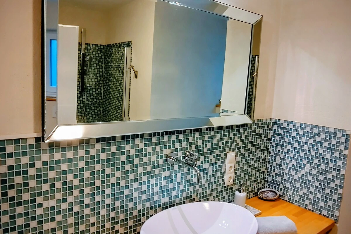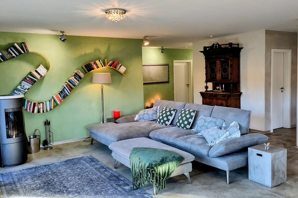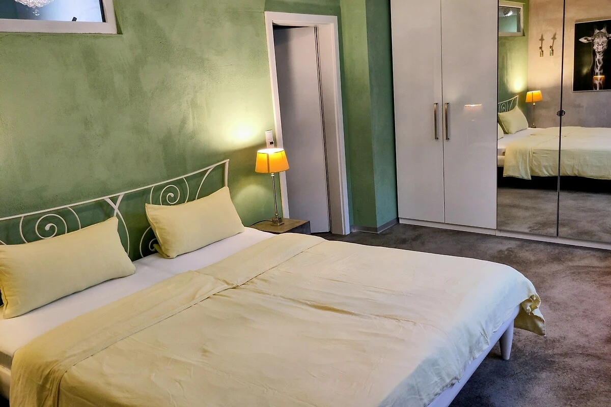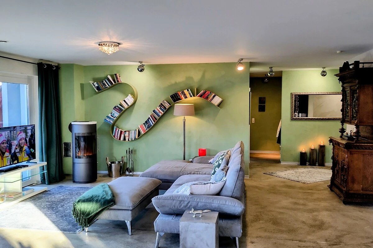 L'appartamento al piano terra dispone di 120 mq di superficie abitabile e offre fino a 4 persone molte possibilità di rilassarsi in splendidi angoli o di dedicarsi ad attività creative nell'ampia zona cucina-pranzo-soggiorno. Le enormi vetrate danno l'impressione di vivere nel verde, anche quando il tempo non è dei migliori. In inverno ci si accomoda davanti alla stufa a legna e nella sauna da giardino, in estate sulle ampie terrazze del giardino fiorito di piante perenni. Ci sono due camere da letto con letti comfort di alta qualità. Ognuna dispone di un proprio bagno. Mobili di gusto, moderni, combinati con antiquariato e colori delicati dell’arredamento conferiscono all’appartamento un’atmosfera elegante. La cucina moderna e spaziosa è ottimamente attrezzata. Gli appassionati di cucina possono qui sbizzarrirsi a piacere. Di certo vi sentirete a vostro agio...