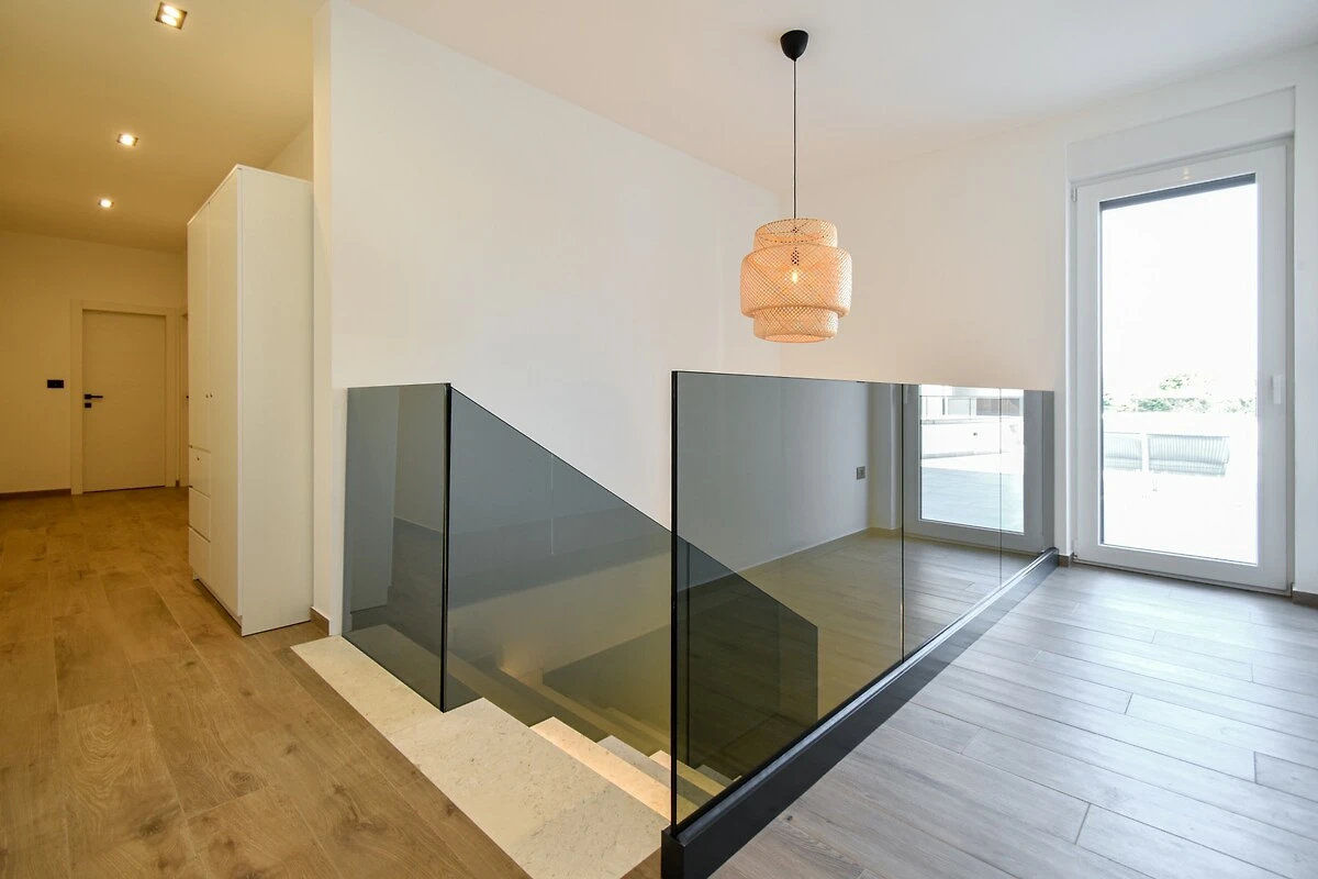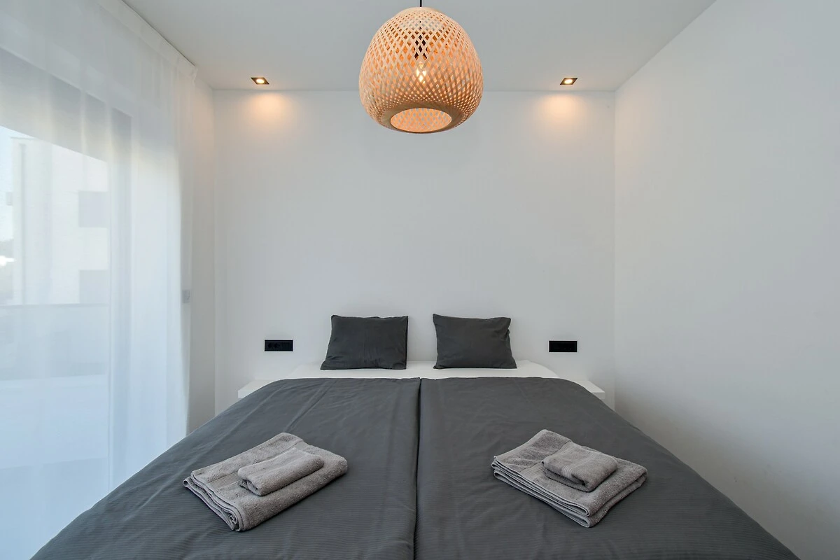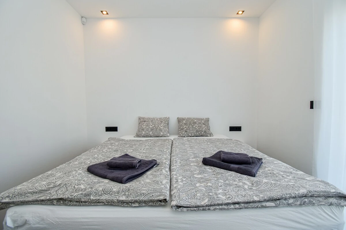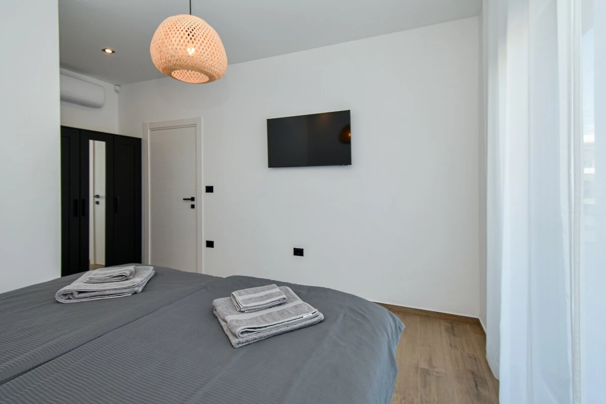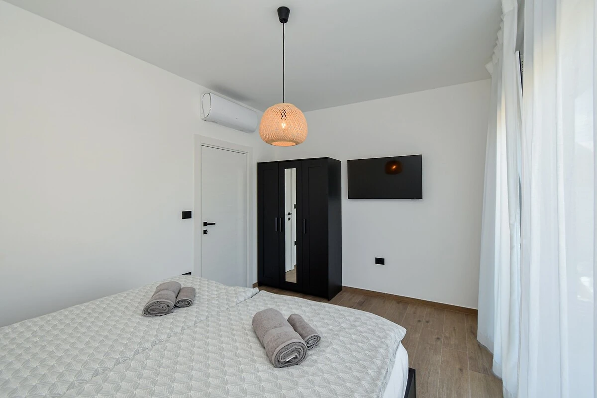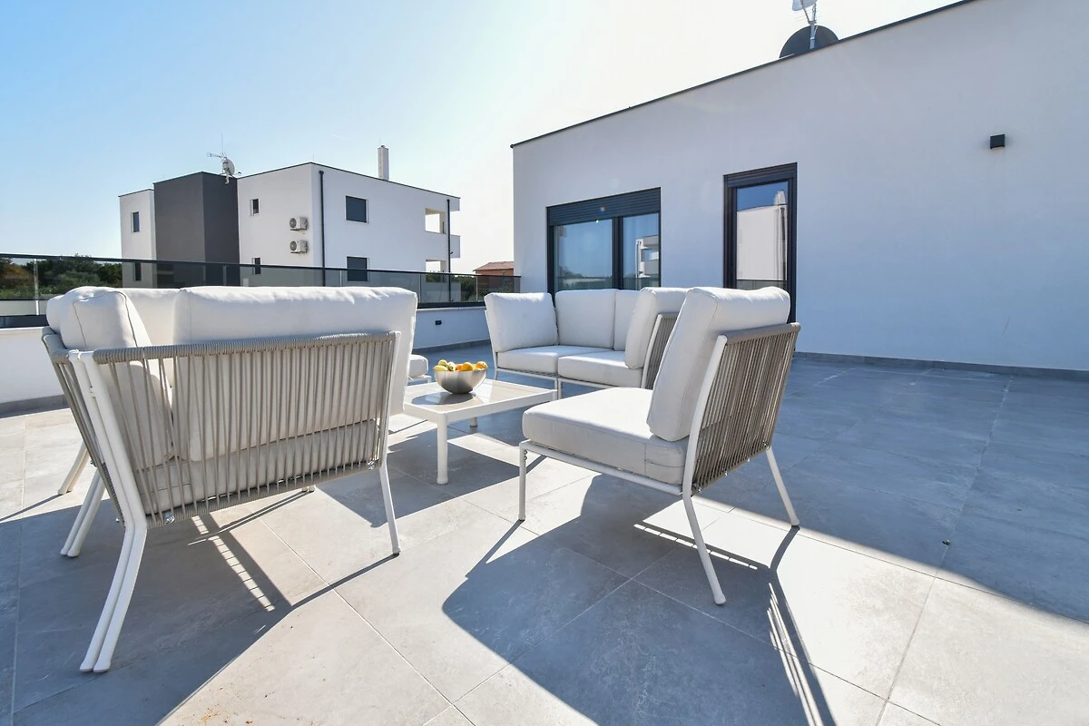 Al primo piano si trovano altre tre eleganti camere da letto climatizzate, di cui una con bagno privato, mentre il secondo bagno si trova nel corridoio. Tutte le camere da letto sono dotate di letti matrimoniali, aria condizionata e televisori. Al piano si trova inoltre una grande terrazza sul tetto con comodi mobili – ideale per il caffè del mattino o per rilassarsi al tramonto. In totale, la villa dispone di tre bagni.