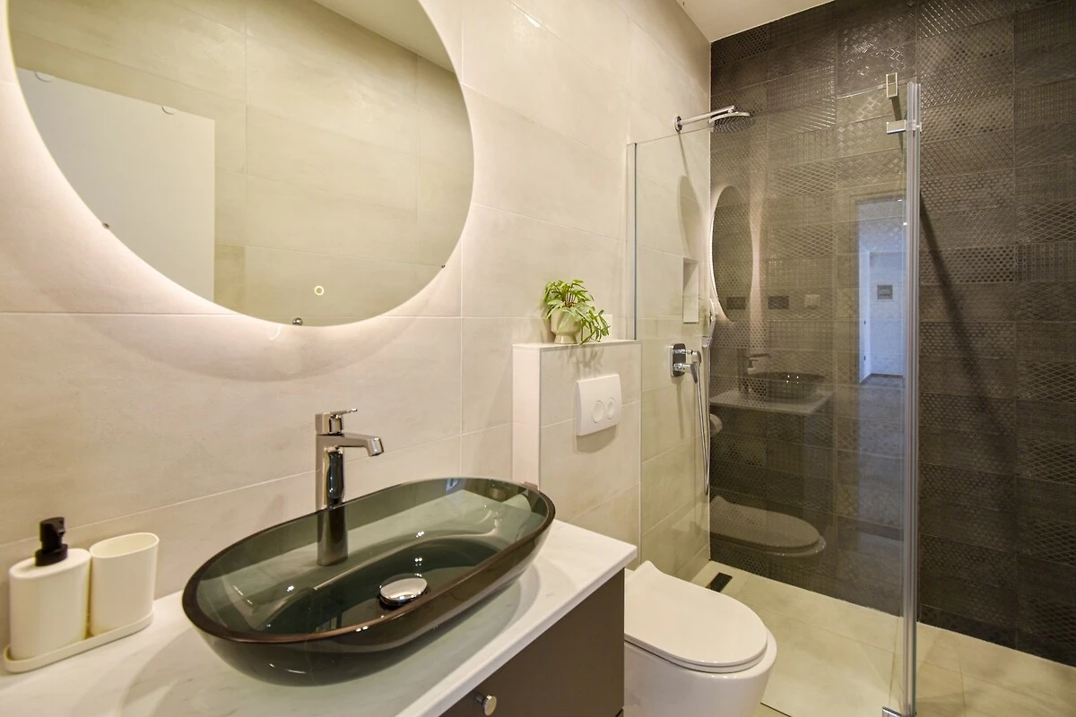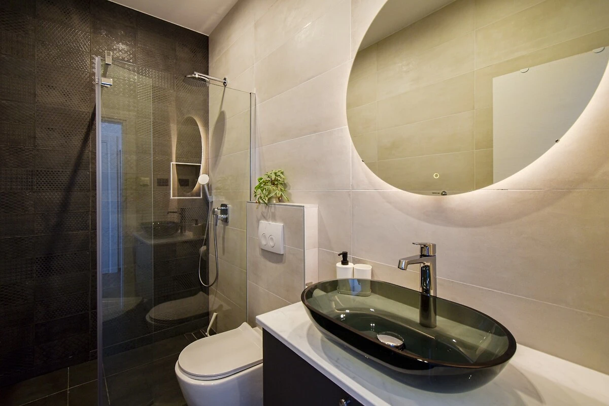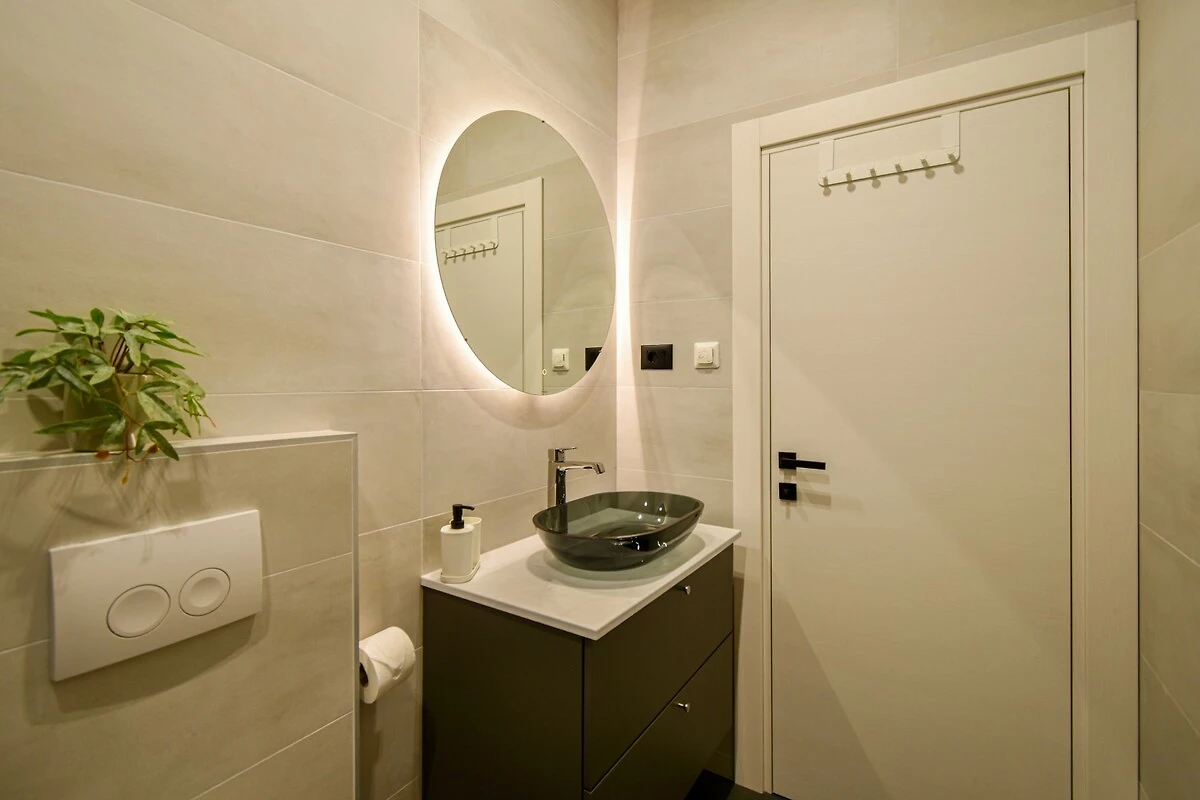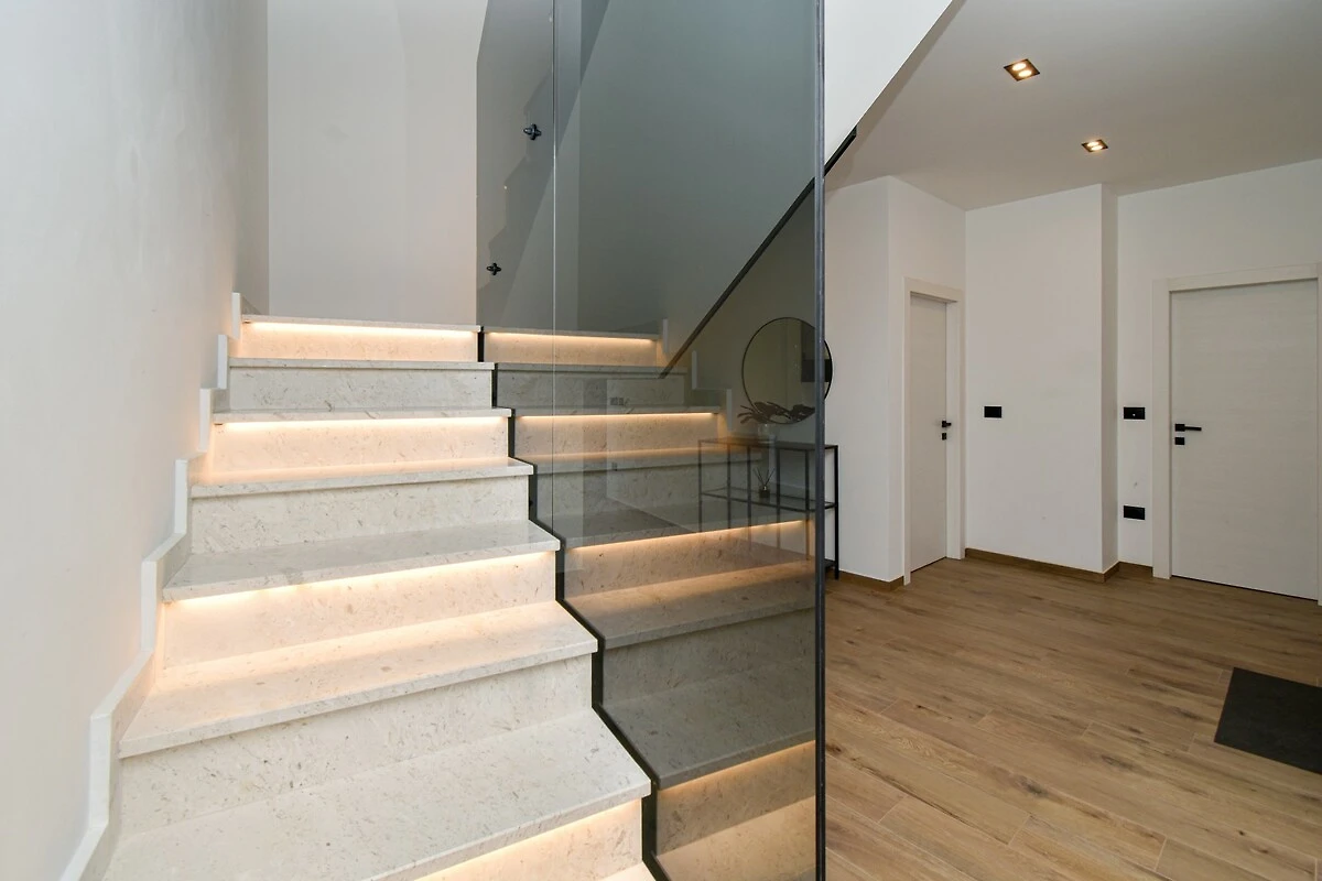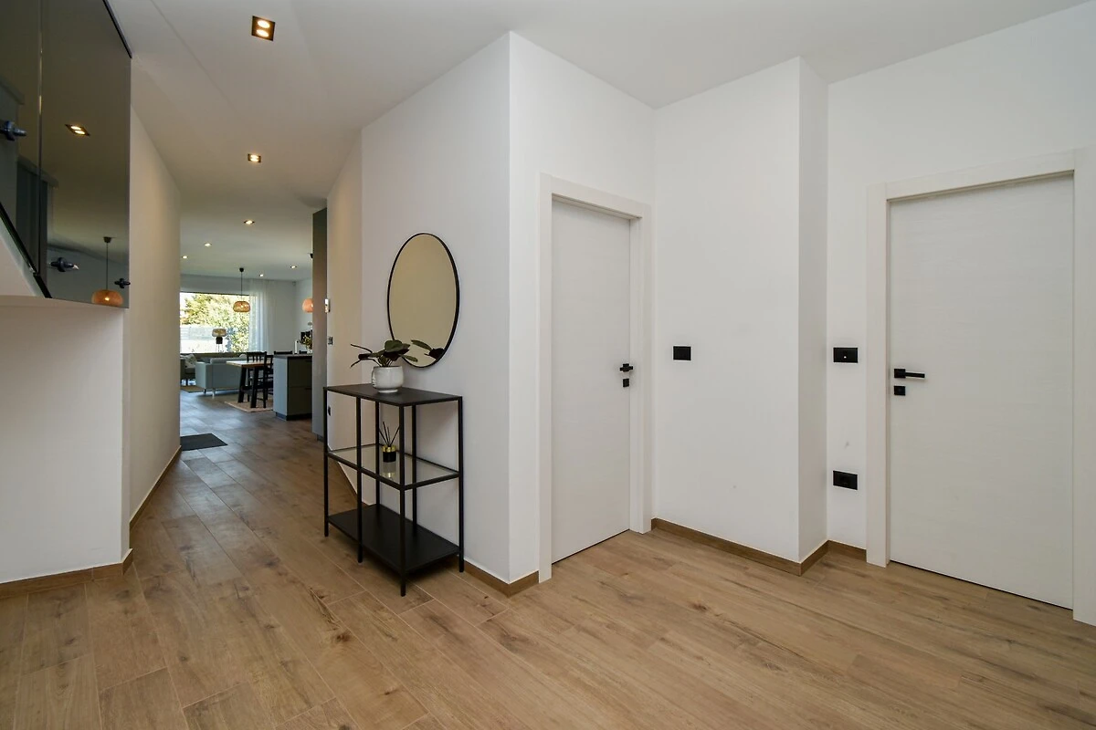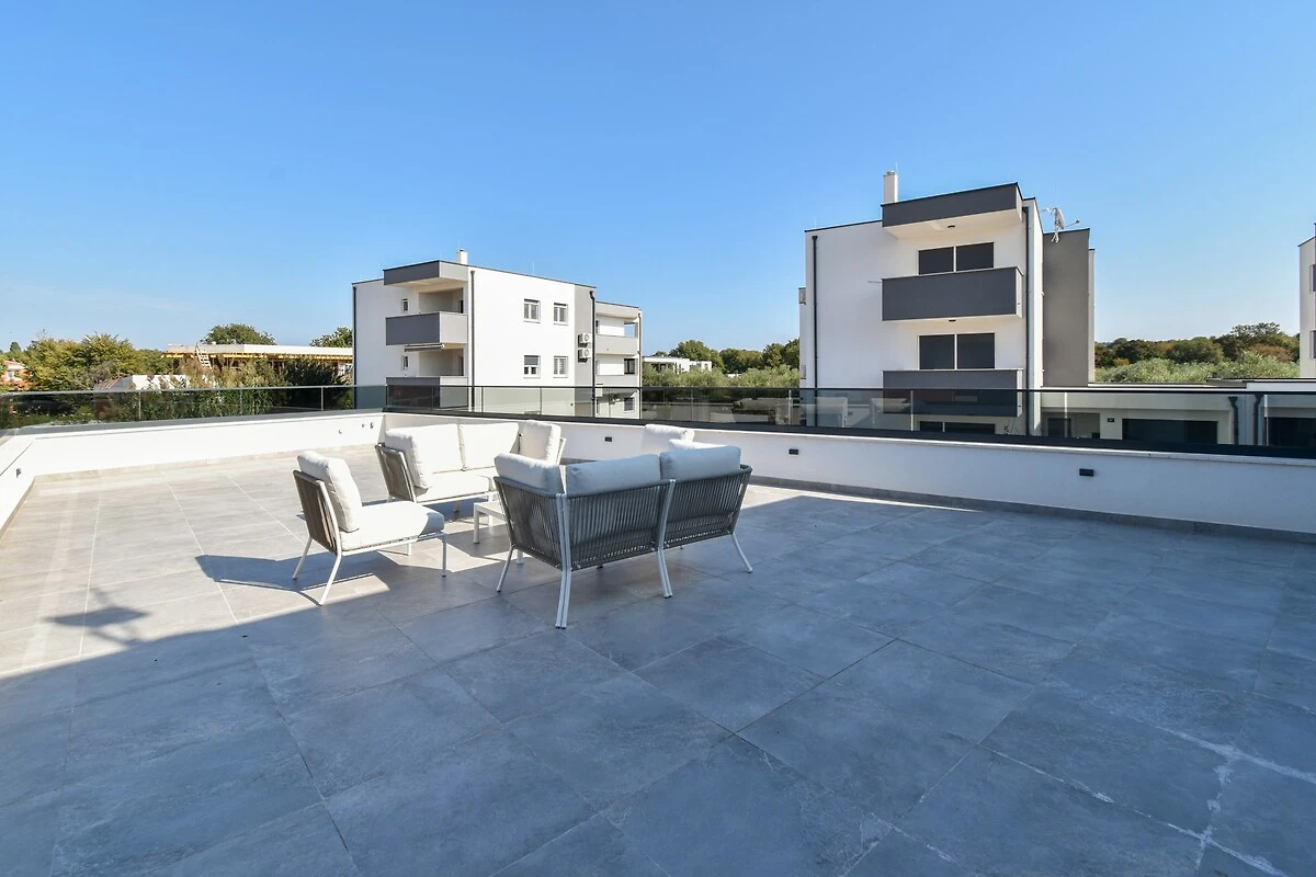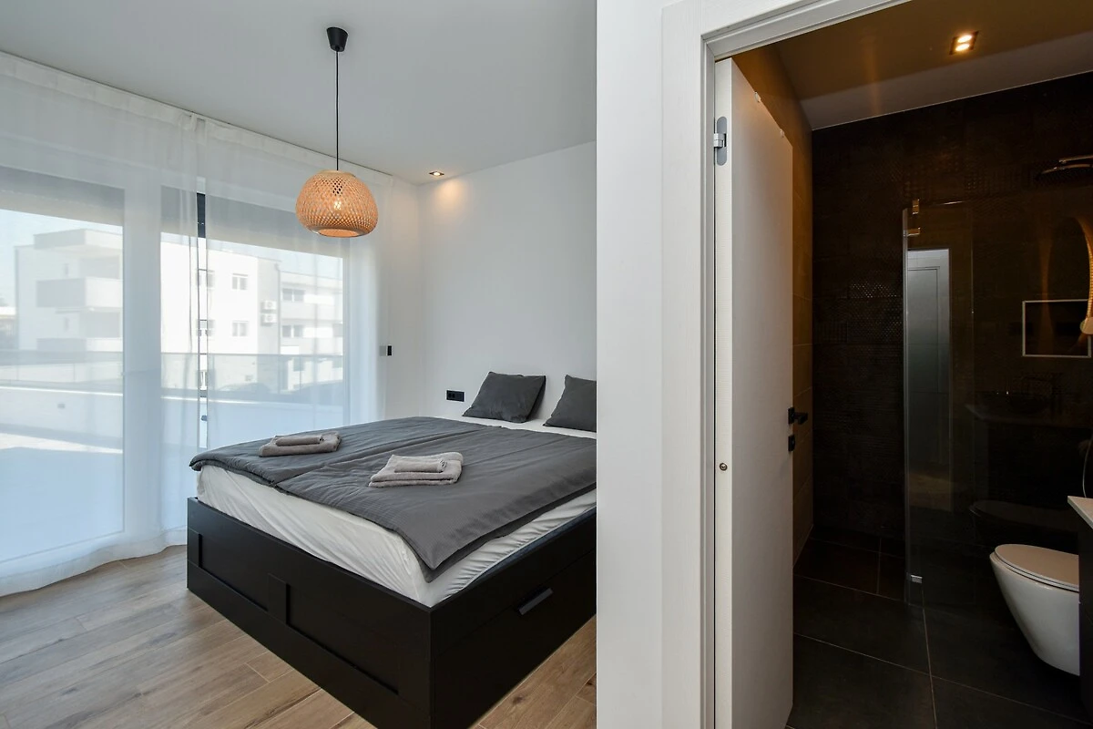 Al primo piano si trovano altre tre eleganti camere da letto climatizzate, di cui una con bagno privato, mentre il secondo bagno si trova nel corridoio. Tutte le camere da letto sono dotate di letti matrimoniali, aria condizionata e televisori. Al piano si trova inoltre una grande terrazza sul tetto con comodi mobili – ideale per il caffè del mattino o per rilassarsi al tramonto. In totale, la villa dispone di tre bagni.