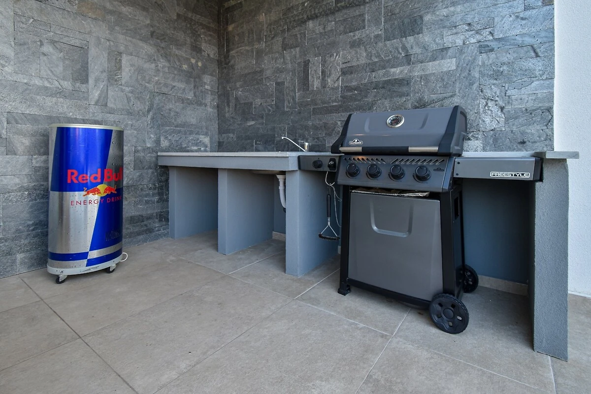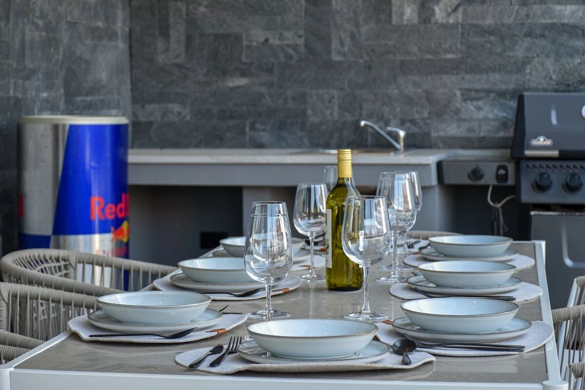 Neben dem Pool befindet sich eine überdachte Terrasse mit einem Essbereich im Freien, einem eingebauten Grill und einem praktischen Kühlschrank. La villa è completamente attrezzata e bietet alles, was Sie für einen angenehmen Aufenthalt benötigen, einschließlich kostenlosem WLAN, Waschmaschine und Trockner sowie einem privaten Parkplatz und einer Garage für mehrere Fahrzeuge.