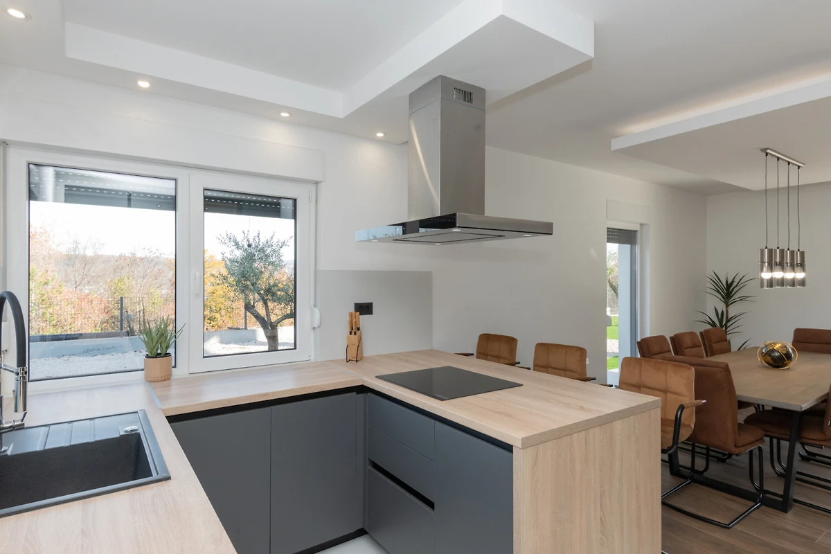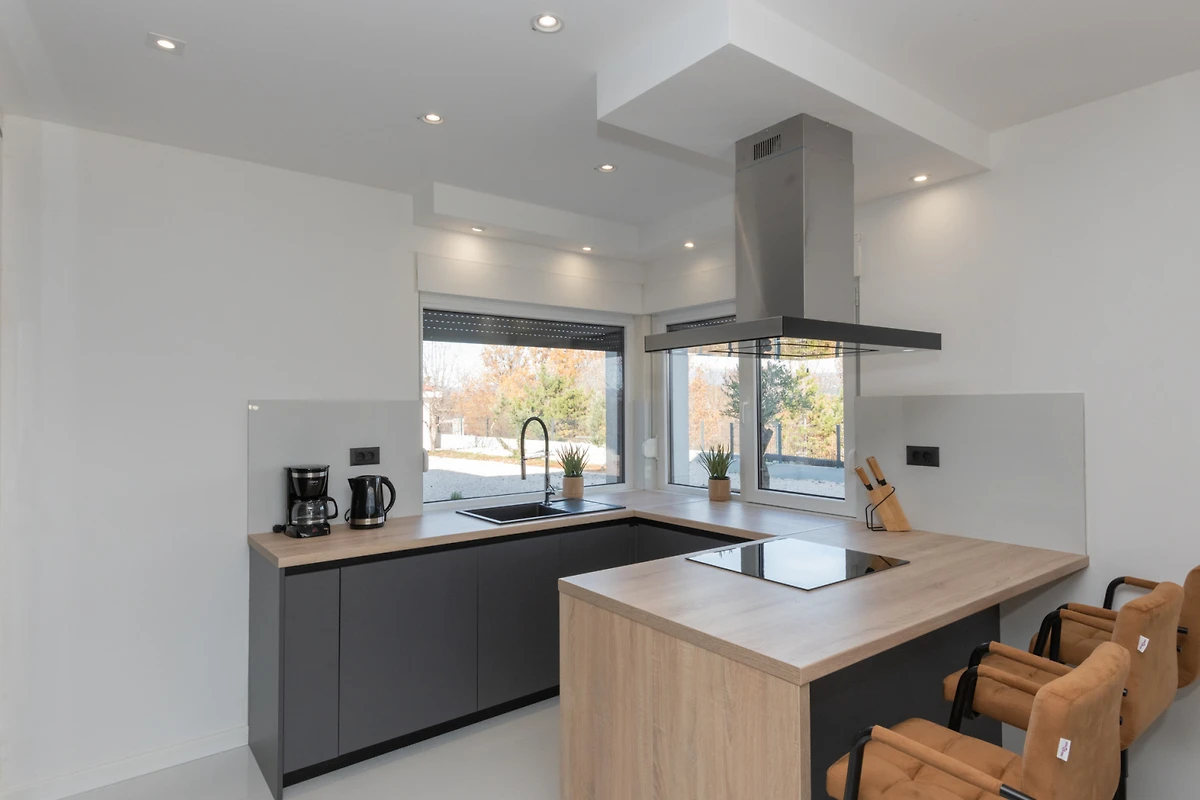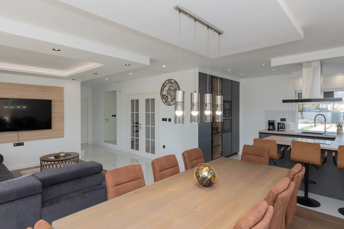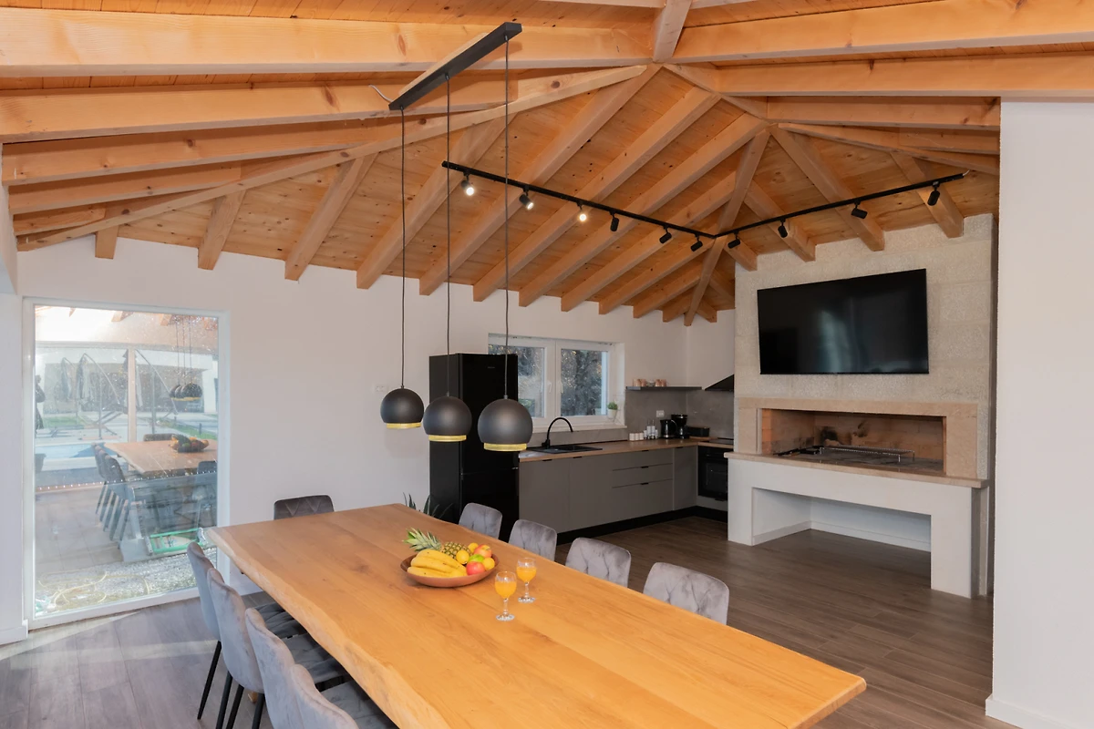 La villa vanta impressionanti 6 bagni, tra cui 3 con doccia, 1 con vasca da bagno e 2 servizi igienici aggiuntivi, garantendo ampi spazi e comodità per tutti gli ospiti. La cucina in stile americano moderno è completamente attrezzata con elettrodomestici di prim'ordine, tra cui piano a induzione, frigorifero, congelatore, forno, microonde, lavastoviglie, macchina da caffè e un'ampia dotazione di stoviglie.