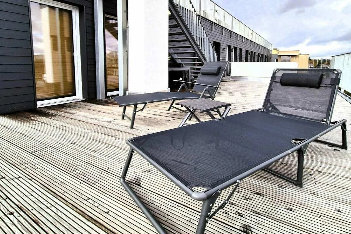 La superficie abitabile di circa 54 m² è distribuita su un corridoio, un piccolo soggiorno con TV e un divano letto largo 1,60 m per la terza e la quarta persona, una cucina integrata a pianta aperta completamente attrezzata e una camera da letto arredata con gusto con un letto matrimoniale (letto a molle) e una seconda TV. L'appartamento dispone inoltre di un ampio bagno con sauna a infrarossi per due persone e lavatrice. La terrazza panoramica di 123 m², con vista mozzafiato, è accessibile sia dal soggiorno che dalla camera da letto. La terrazza è arredata con mobili da giardino.
