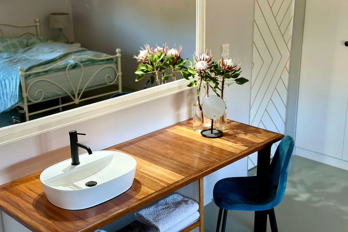 I nostri appartamenti per le vacanze sono qualcosa di davvero speciale: si trovano direttamente sopra la nostra esclusiva scuderia espositiva, allestita dalla rinomata azienda Röwer & Rüb. Dal bagno si può ammirare le eleganti stalle e osservare i nostri cavalli mentre si rilassano. Un'esperienza straordinaria che unisce vicinanza e comfort – perfetta per chi ama ciò che è speciale. Dal soggiorno si gode di una splendida vista verso Città del Capo e sui vigneti di Stellenbosch. Così potrete godere della posizione speciale dei nostri appartments per le vacanze con vista sulla fattoria e sui suoi recinti. Davanti all’edificio c’è un angolo salotto da cui potete osservare la vita della fattoria.