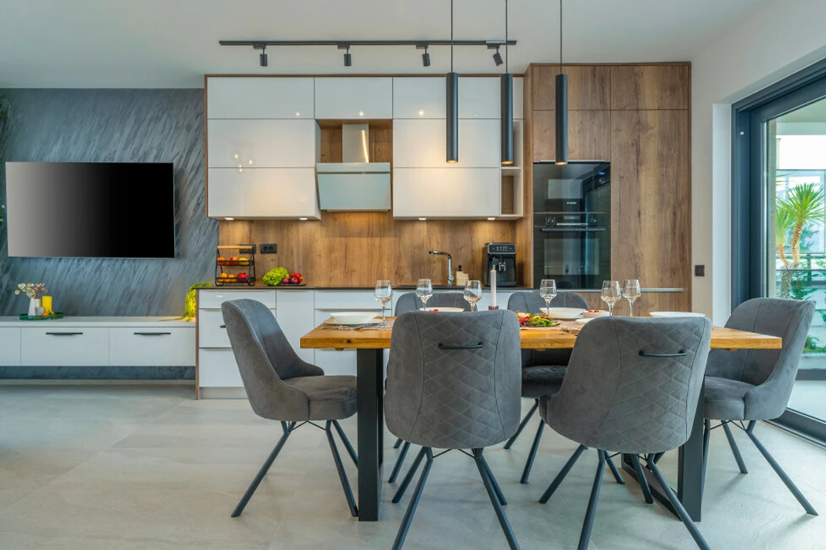 Il cuore della casa è la cucina completamente attrezzata in stile americano, con elettrodomestici di prim'ordine tra cui un piano cottura a induzione, frigorifero, congelatore, forno, lavastoviglie, macchina da caffè e un set completo di stoviglie. Pratici accessori come lavatrice e asciugatrice completano la funzionalità della cucina.