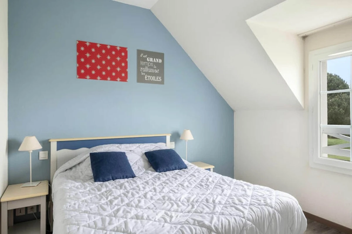 Affacciata sul pittoresco porto turistico di Crouesty, questa incantevole casa per sei persone offre un rifugio sereno nel cuore del Golfo del Morbihan, in Bretagna. Con i suoi dintorni lussureggianti, il clima costiero mite e la vicinanza alla spiaggia, a soli 600 metri di distanza, questa proprietà è perfetta per una rilassante vacanza al mare. Immagina di svegliarti con il dolce suono del porto e di gustare il caffè mattutino sulla terrazza privata, immergendoti nella tranquilla atmosfera di questo luogo idilliaco. Con una superficie di 50 m², la casa è progettata con cura per ospitare famiglie o gruppi di amici. Dispone di tre accoglienti camere da letto, una cucina americana ben attrezzata con elettrodomestici moderni e due bagni per una maggiore comodità. I luminosi spazi abitativi si aprono su una terrazza di 10 m² con mobili da giardino, ideale per cenare all'aperto o rilassarsi dopo una giornata di esplorazione. Gli ospiti possono inoltre usufruire della piscina in comune, disponibile dal 15 giugno al 15 settembre, perfetta per rinfrescarsi nelle calde giornate estive. Tra i servizi aggiuntivi figurano due televisori, un asciugacapelli e un parcheggio esterno per due veicoli. La posizione è imbattibile per chi cerca relax e avventura. A pochi passi troverete deliziosi ristoranti, come