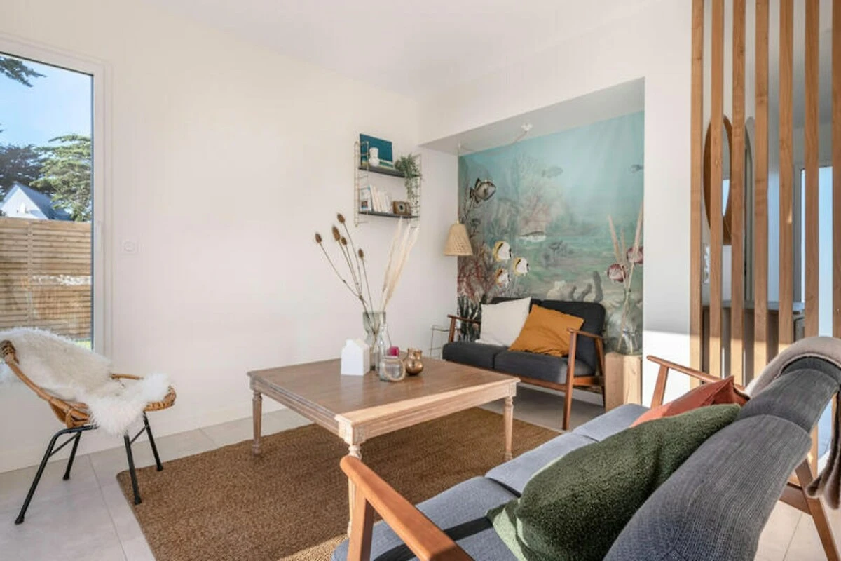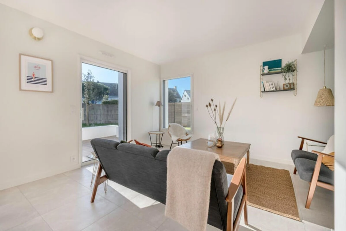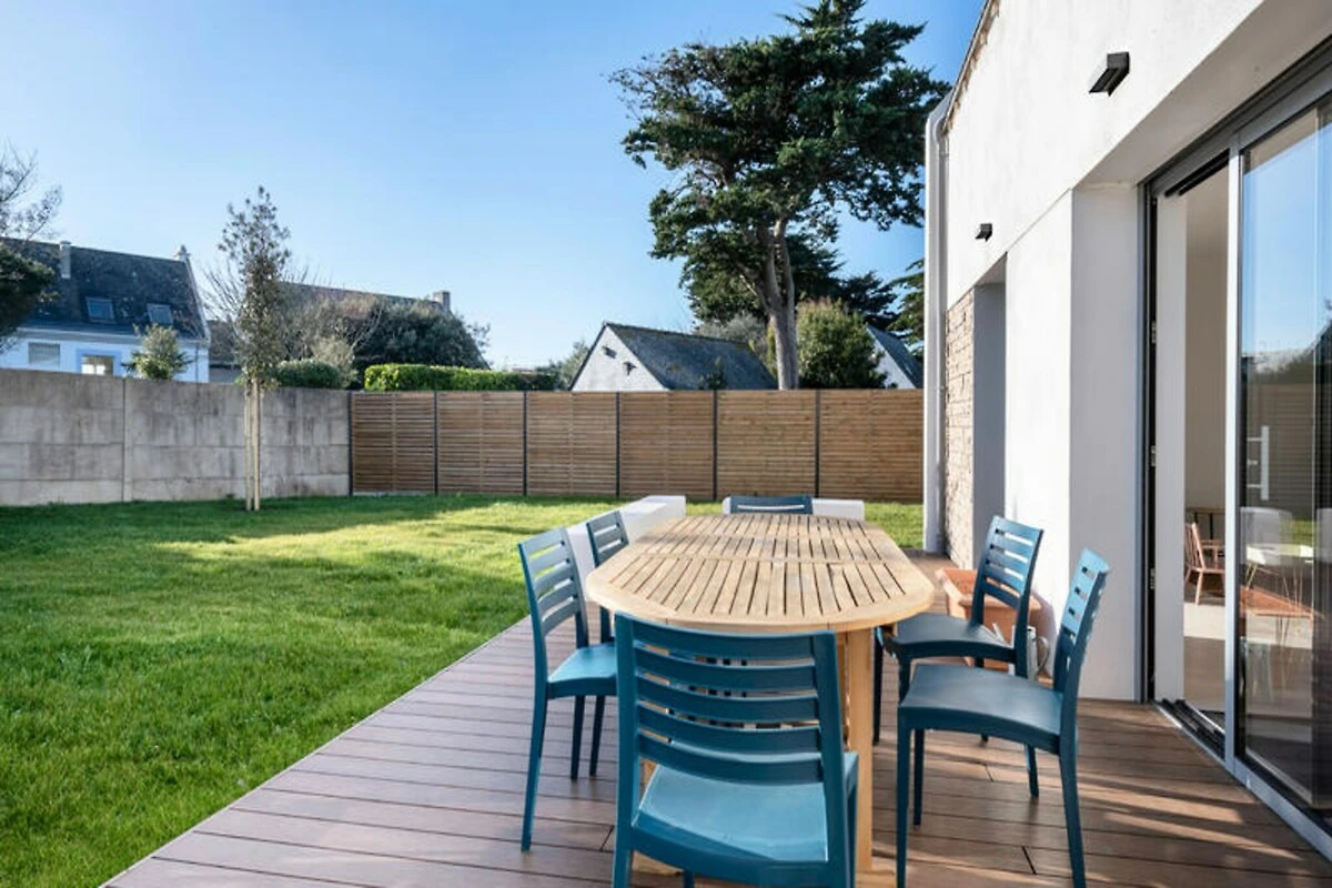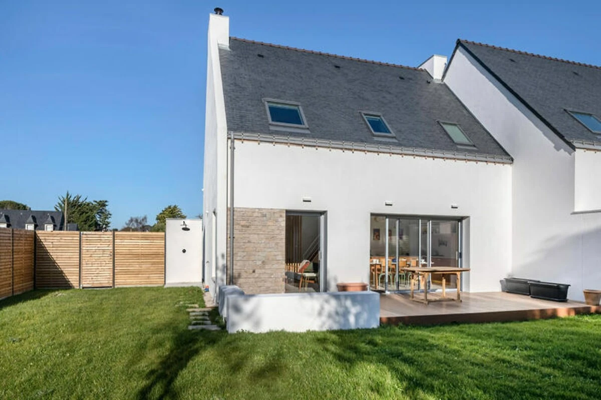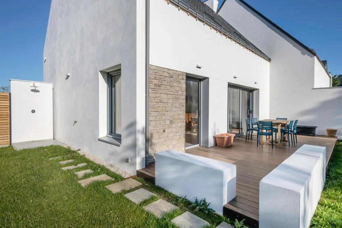 Una leggera brezza trasporta il profumo del mare mentre varcate la soglia di questa affascinante casa moderna nel sud della Bretagna. Situata a pochi metri dal porto peschereccio di Saint-Jacques e circondata dalla bellezza naturale della costa atlantica e del Golfo del Morbihan, questa casa è un paradiso per chi cerca tranquillità e fascino costiero. Che siate qui per una vacanza in famiglia o per un ritiro con gli amici, questa casa vi invita a rallentare e ad assaporare i semplici piaceri della vita. Con una superficie di 120 m², la casa può ospitare comodamente fino a otto persone in quattro camere da letto, tra cui una suite padronale al piano terra. Il giardino recintato e la terrazza di 20 m² sono perfetti per cenare all'aperto o rilassarsi al sole, mentre il barbecue e la doccia esterna aggiungono un tocco di praticità e divertimento. All'interno, la cucina abitabile completamente attrezzata vanta elettrodomestici moderni come piani cottura a induzione, frigorifero, forno, microonde, congelatore, lavastoviglie e macchina da caffè Nespresso. Una lavanderia con lavatrice e asciugatrice garantisce la massima comodità durante il vostro soggiorno e, su richiesta, sono disponibili attrezzature per bambini. \n\nLa posizione è ideale per le famiglie, con la spiaggia di Saint-Jacques a soli 400 metri e il supermercato Carrefour Express raggiungibile a piedi. Esplorate i sentieri costieri nelle vicinanze, incluso il sentiero escursionistico GR32, e scoprite calette appartate, piccoli porti e panorami mozzafiato. Per gli amanti del golf, il Golf Bluegreen Rhuys Kerver è a soli 8 km di distanza, mentre le gite di un giorno alle isole di Houat, Hoëdic, Belle-Île e al Golfo del Morbihan offrono avventure indimenticabili. \n\nCon un servizio di portineria a disposizione per assistervi durante il vostro soggiorno, questa casa è più di un semplice affitto: è un invito a vivere il ritmo unico della vita bretone. Dalla raccolta di frutti di mare ai mercati locali, ogni momento qui è un'opportunità per creare ricordi indelebili. Lasciate che le maree e il microclima della Bretagna meridionale vi sorprendano e vi deliziano.