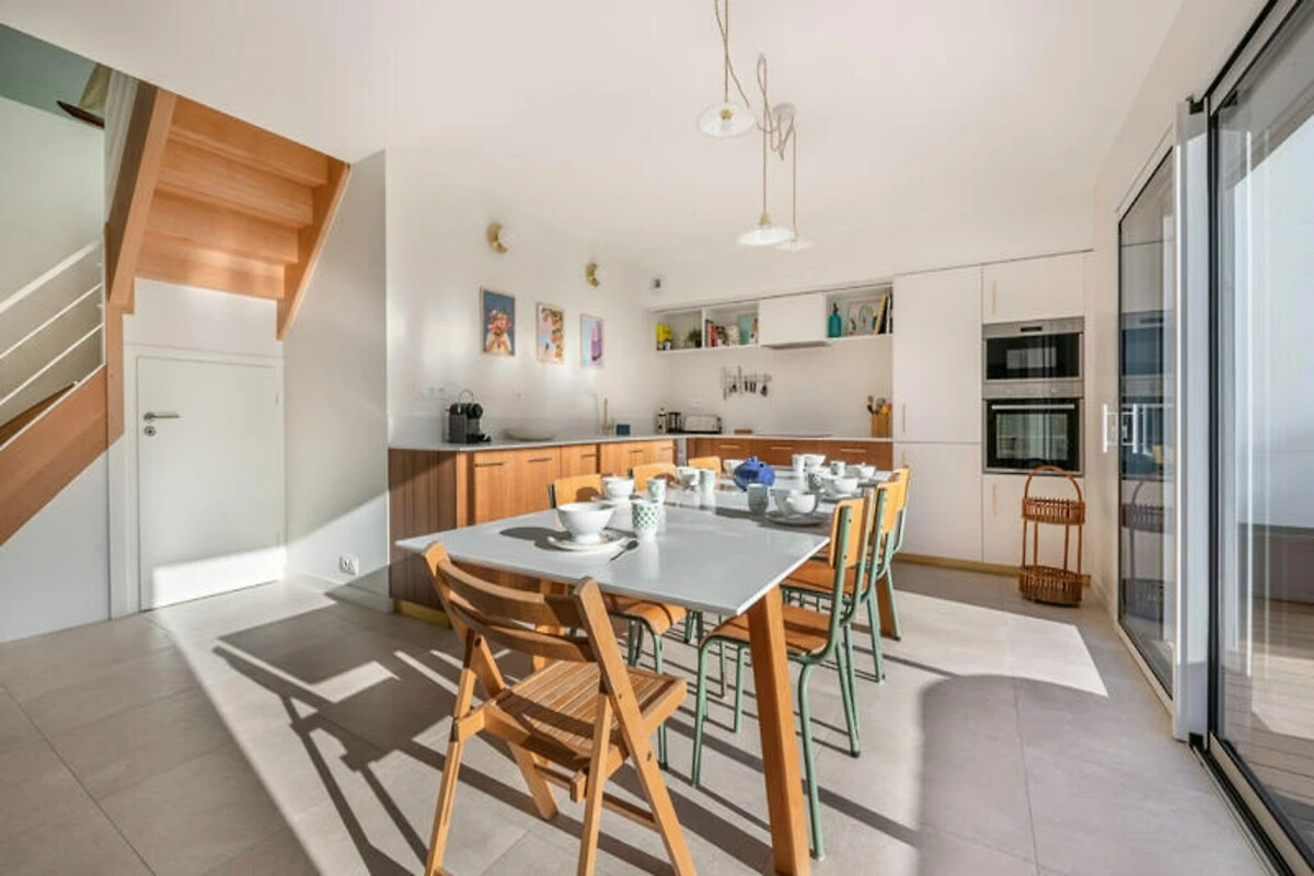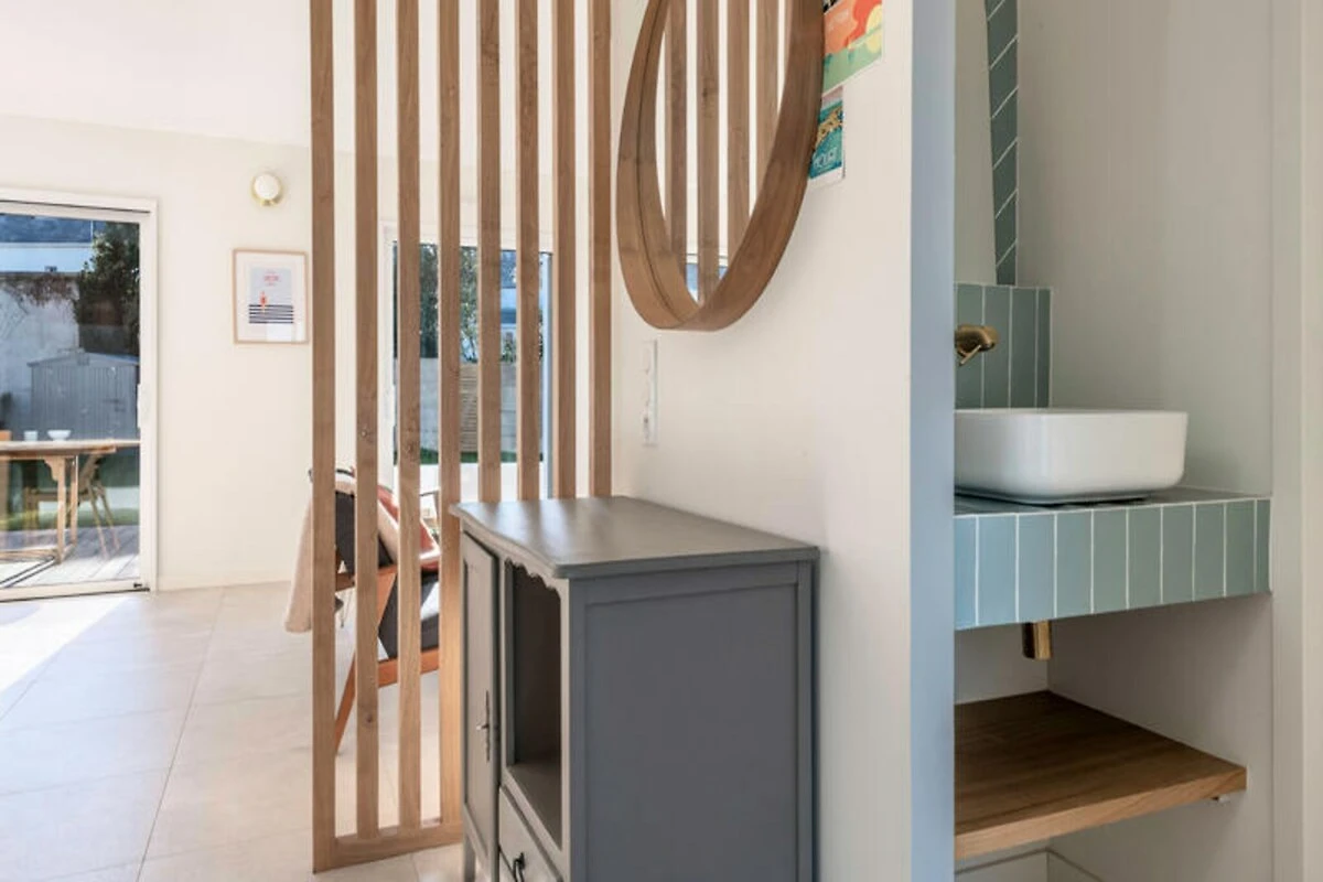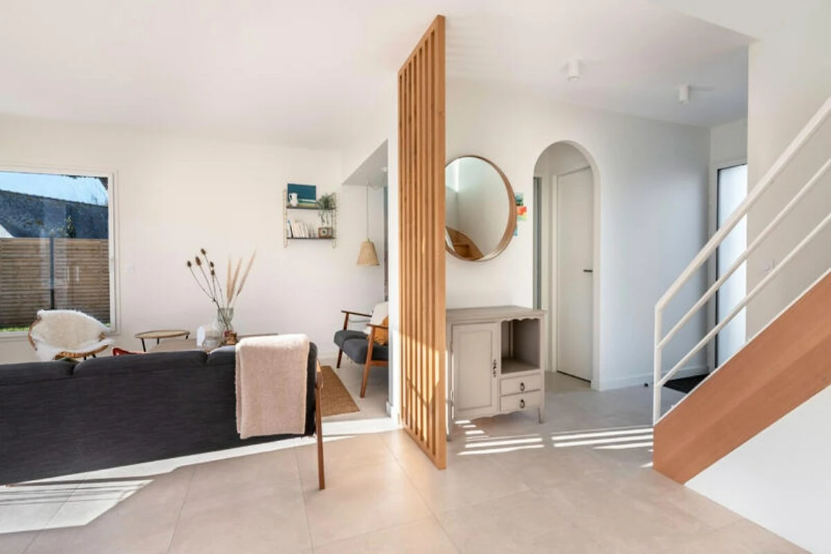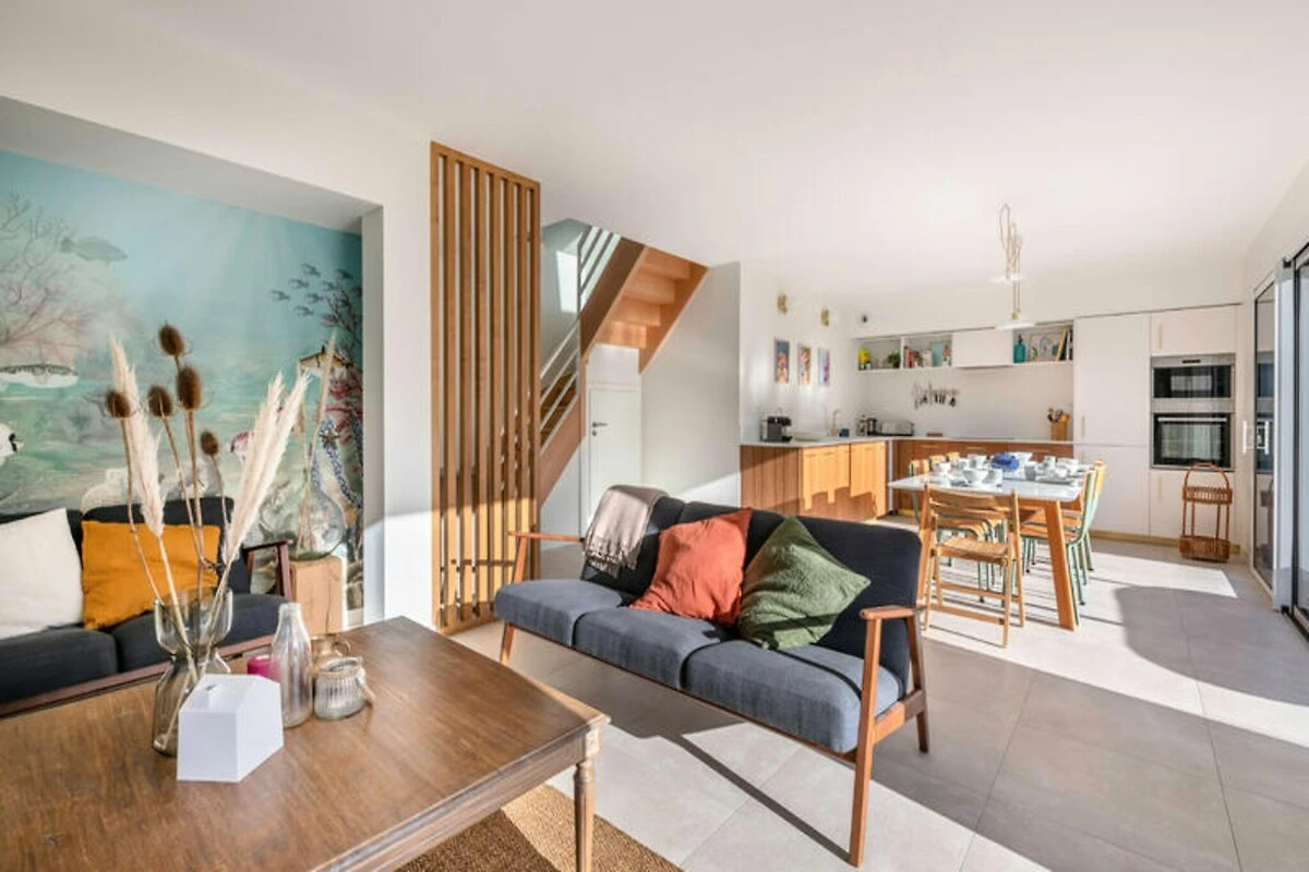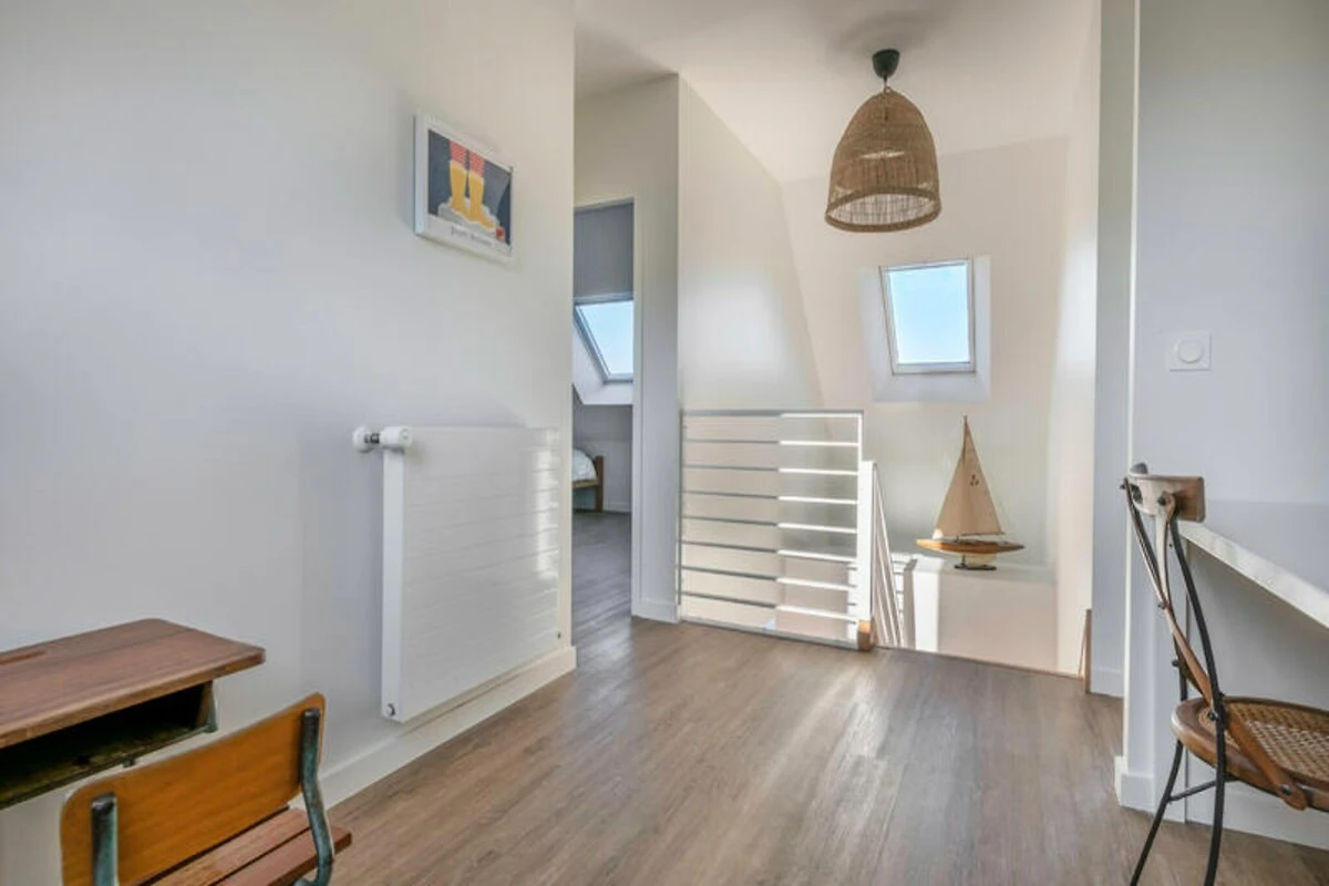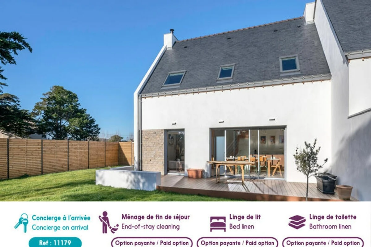 Una leggera brezza trasporta il profumo del mare mentre varcate la soglia di questa affascinante casa moderna nel sud della Bretagna. Situata a pochi metri dal porto peschereccio di Saint-Jacques e circondata dalla bellezza naturale della costa atlantica e del Golfo del Morbihan, questa casa è un paradiso per chi cerca tranquillità e fascino costiero. Che siate qui per una vacanza in famiglia o per un ritiro con gli amici, questa casa vi invita a rallentare e ad assaporare i semplici piaceri della vita. Con una superficie di 120 m², la casa può ospitare comodamente fino a otto persone in quattro camere da letto, tra cui una suite padronale al piano terra. Il giardino recintato e la terrazza di 20 m² sono perfetti per cenare all'aperto o rilassarsi al sole, mentre il barbecue e la doccia esterna aggiungono un tocco di praticità e divertimento. All'interno, la cucina abitabile completamente attrezzata vanta elettrodomestici moderni come piani cottura a induzione, frigorifero, forno, microonde, congelatore, lavastoviglie e macchina da caffè Nespresso. Una lavanderia con lavatrice e asciugatrice garantisce la massima comodità durante il vostro soggiorno e, su richiesta, sono disponibili attrezzature per bambini. \n\nLa posizione è ideale per le famiglie, con la spiaggia di Saint-Jacques a soli 400 metri e il supermercato Carrefour Express raggiungibile a piedi. Esplorate i sentieri costieri nelle vicinanze, incluso il sentiero escursionistico GR32, e scoprite calette appartate, piccoli porti e panorami mozzafiato. Per gli amanti del golf, il Golf Bluegreen Rhuys Kerver è a soli 8 km di distanza, mentre le gite di un giorno alle isole di Houat, Hoëdic, Belle-Île e al Golfo del Morbihan offrono avventure indimenticabili. \n\nCon un servizio di portineria a disposizione per assistervi durante il vostro soggiorno, questa casa è più di un semplice affitto: è un invito a vivere il ritmo unico della vita bretone. Dalla raccolta di frutti di mare ai mercati locali, ogni momento qui è un'opportunità per creare ricordi indelebili. Lasciate che le maree e il microclima della Bretagna meridionale vi sorprendano e vi deliziano.