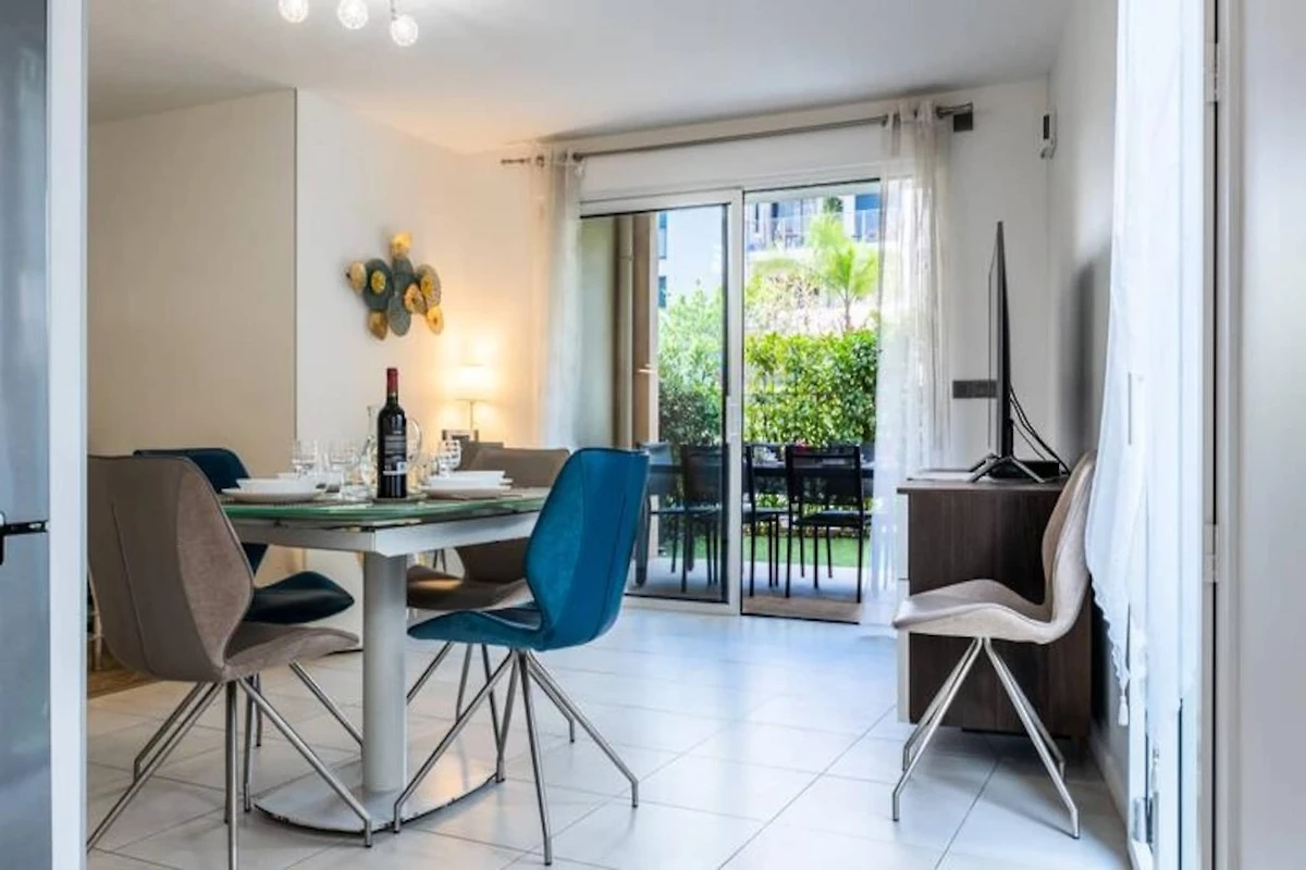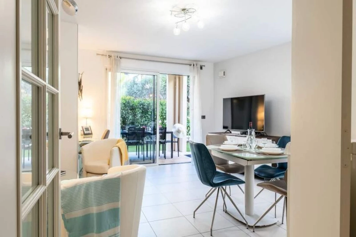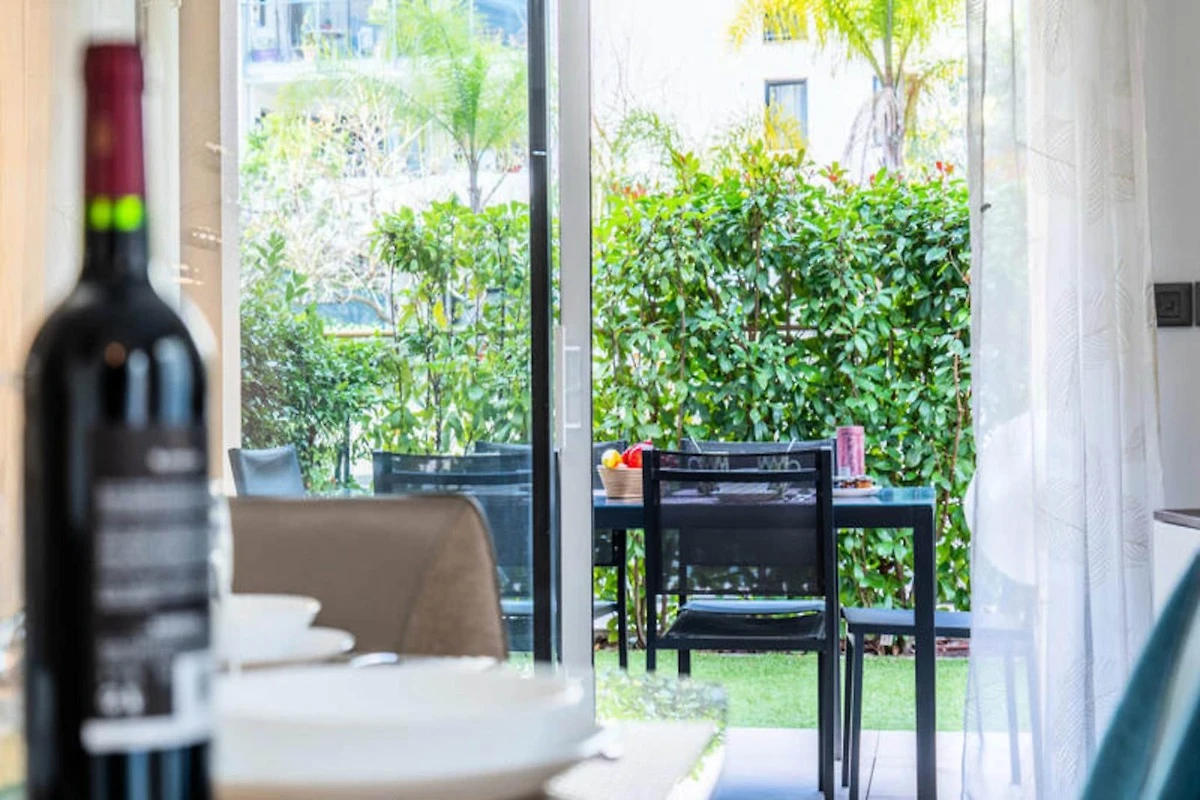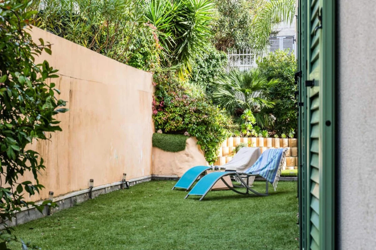 Entrate in questo luminoso e spazioso appartamento di 71 m², dove ogni dettaglio è stato attentamente progettato per il vostro comfort. La zona giorno open space, con la sua ampia vetrata, si collega perfettamente a un rigoglioso giardino privato, creando un armonioso flusso tra interno ed esterno. La cucina completamente attrezzata è ideale per preparare pasti da gustare al tavolo da pranzo o all'aperto in giardino. Le due camere da letto offrono flessibilità: una dispone di due letti singoli unibili, mentre la camera da letto principale con bagno privato si apre su un tranquillo giardino sul retro. Servizi di lusso come l'aria condizionata a tre zone, il Wi-Fi ad alta velocità e l'accesso sicuro tramite portachiavi garantiscono un soggiorno senza pensieri.