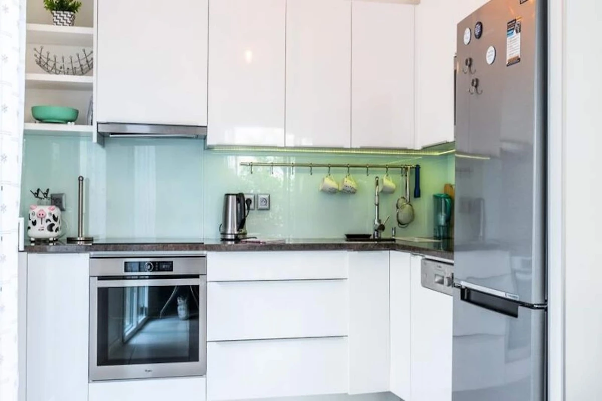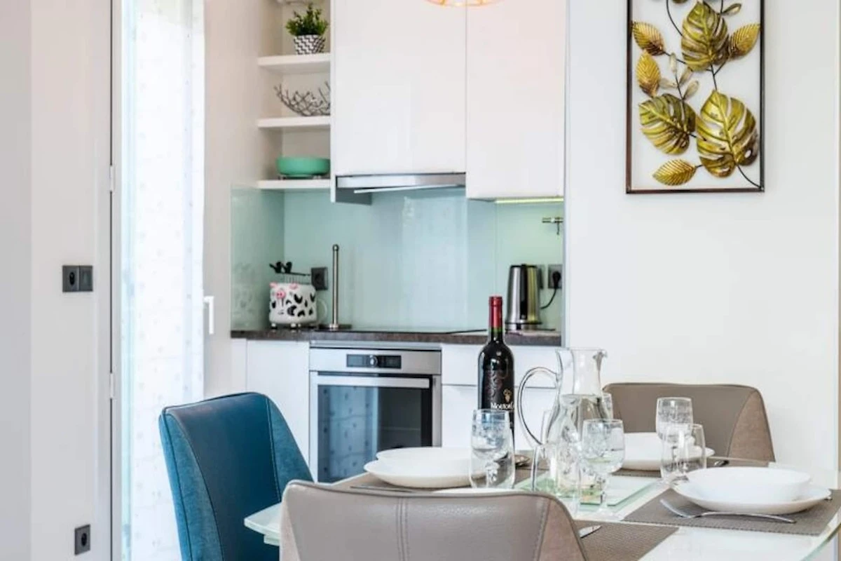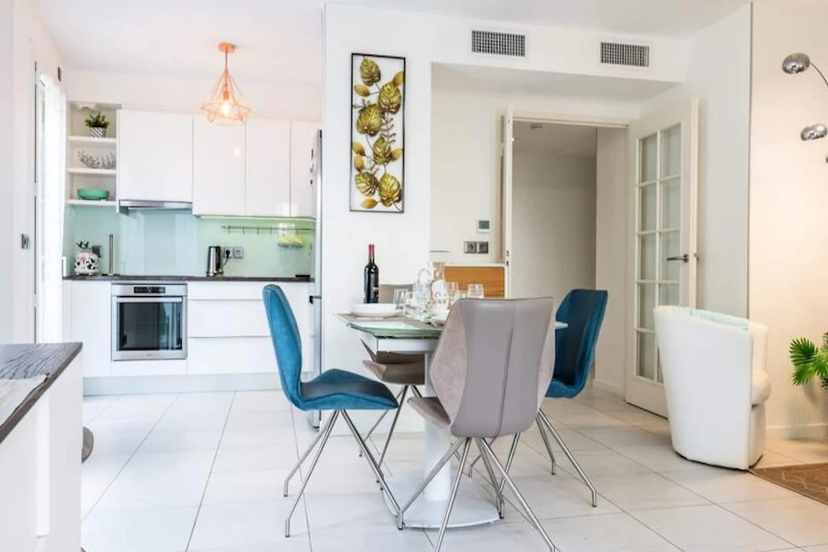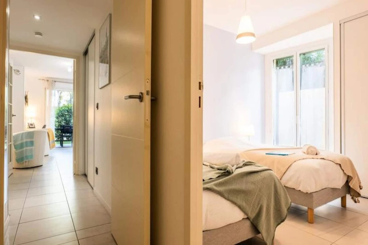 Entrate in questo luminoso e spazioso appartamento di 71 m², dove ogni dettaglio è stato attentamente progettato per il vostro comfort. La zona giorno open space, con la sua ampia vetrata, si collega perfettamente a un rigoglioso giardino privato, creando un armonioso flusso tra interno ed esterno. La cucina completamente attrezzata è ideale per preparare pasti da gustare al tavolo da pranzo o all'aperto in giardino. Le due camere da letto offrono flessibilità: una dispone di due letti singoli unibili, mentre la camera da letto principale con bagno privato si apre su un tranquillo giardino sul retro. Servizi di lusso come l'aria condizionata a tre zone, il Wi-Fi ad alta velocità e l'accesso sicuro tramite portachiavi garantiscono un soggiorno senza pensieri.