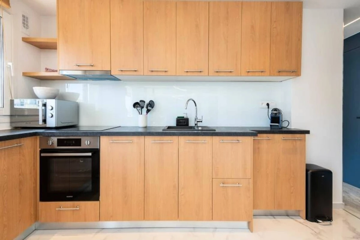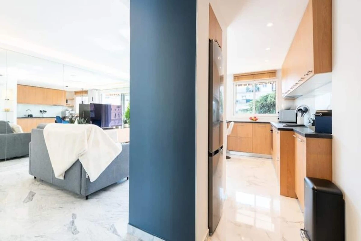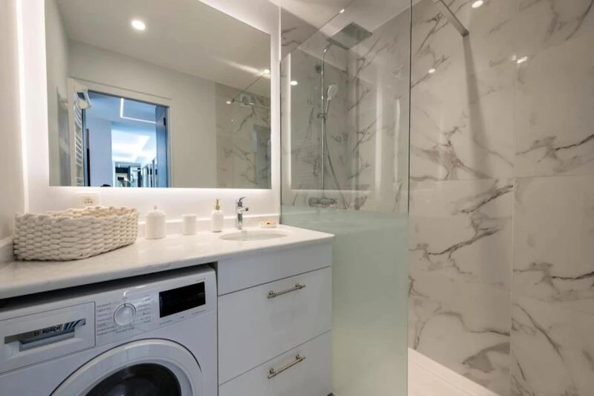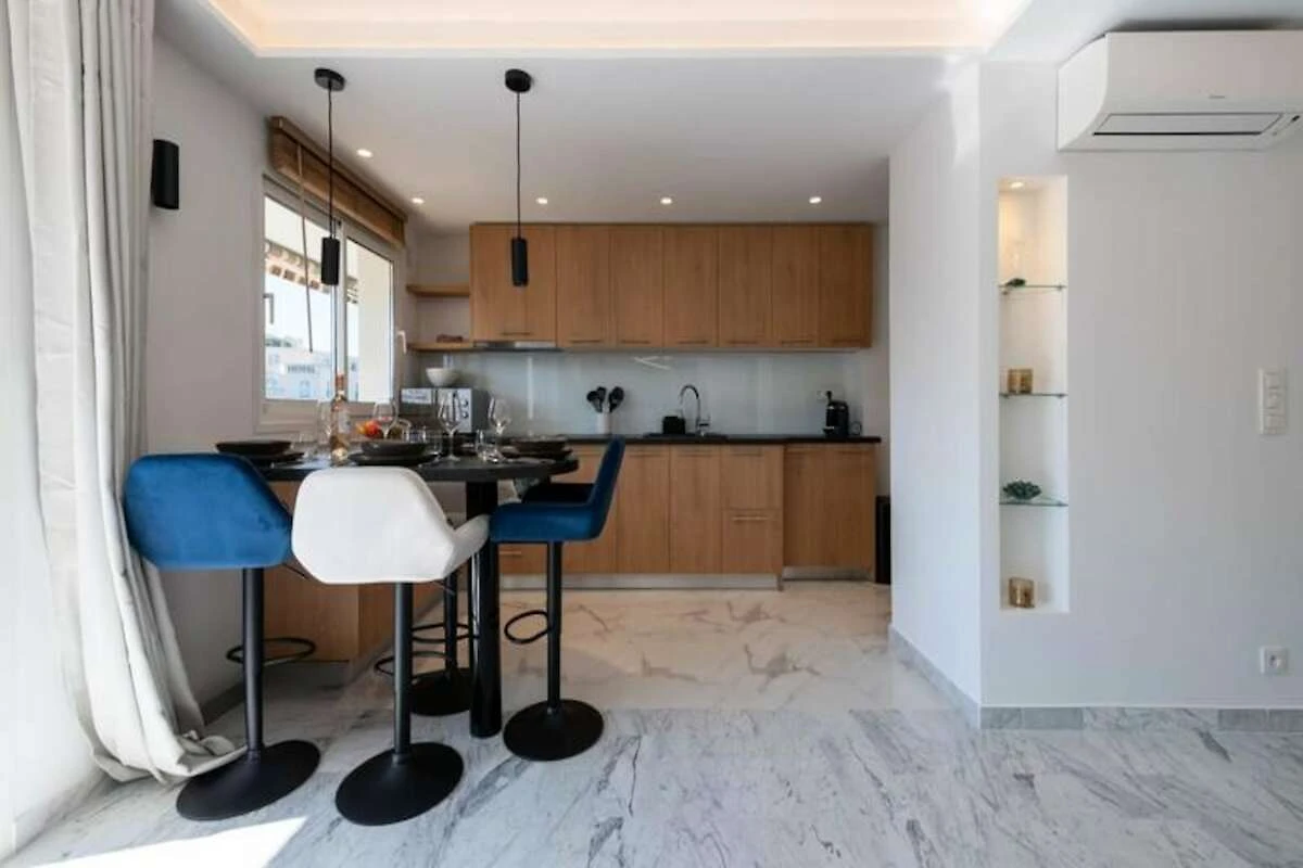 All'interno, l'appartamento è un santuario della vita moderna. Il soggiorno open space, inondato di luce naturale, dispone di un comodo divano letto, Smart TV e una zona pranzo per quattro persone, perfettamente collegata alla cucina completamente attrezzata. La camera da letto vanta un lussuoso letto king-size, un armadio a muro e l'accesso diretto alla terrazza, permettendovi di svegliarvi con il dolce calore del sole mediterraneo. L'elegante bagno, con la sua spaziosa doccia e i sanitari moderni, garantisce un inizio o una fine di giornata rilassanti. Ogni dettaglio è stato attentamente progettato per offrire comfort e stile, rendendo questo appartamento una vera casa lontano da casa.