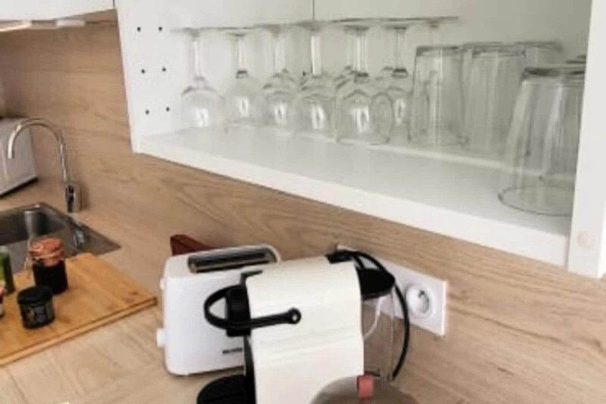 Internamente, l'appartamento, dotato di aria condizionata, è progettato con cura per il comfort e la praticità. Il soggiorno si apre sulla terrazza, creando un flusso continuo tra interno ed esterno, perfetto per cenare all'aperto o semplicemente per rilassarsi dopo una giornata di avventure. La cucina completamente attrezzata, con piano cottura a induzione, macchina Nespresso e lavastoviglie, rende la preparazione dei pasti un gioco da ragazzi, che si tratti di assaporare pesce fresco locale o di sorseggiare un bicchiere di Vin des Sables. L'accogliente camera da letto dispone di un comodo letto da 130 cm e morbide lenzuola, per notti di puro riposo in riva al mare.