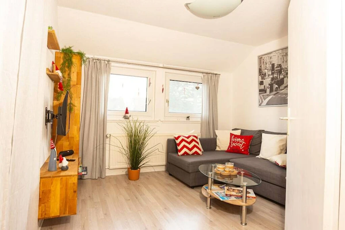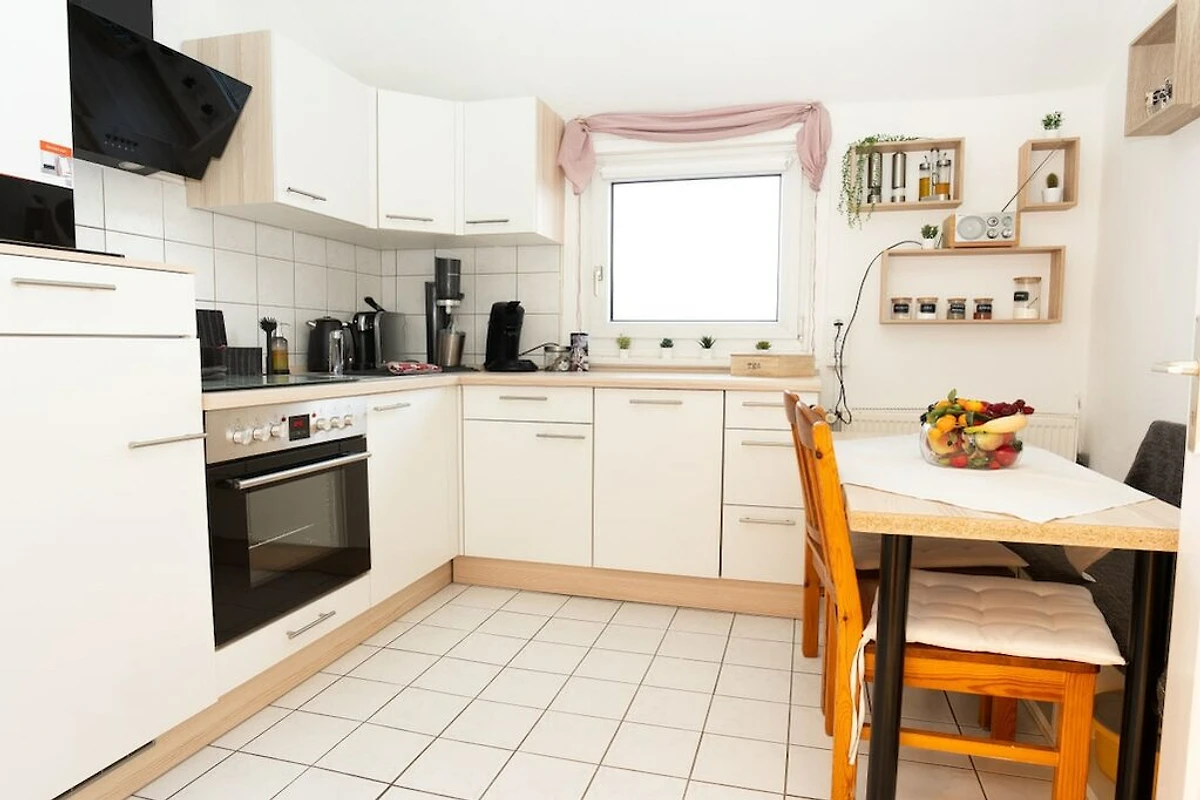 Al secondo piano, vi aspetta un appartamento di 50 mq con 3 locali, 2 camere da letto, un soggiorno e una cucina completamente attrezzata con zona pranzo. Un luminoso bagno con finestra e vasca da bagno con box doccia completa l'esperienza di vacanza.