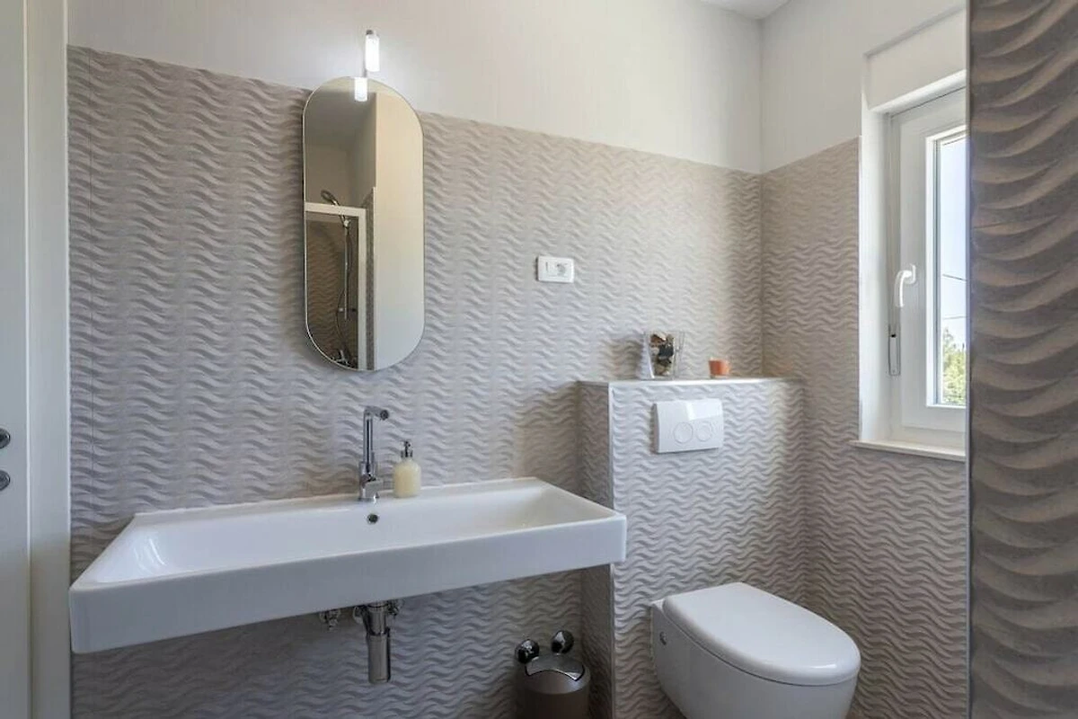 Pianterreno: (Soggiorno / Pranzo(, TV, TV, TV, tavolo da pranzo, stufa, aria condizionata), Camera da letto(, , letto matrimoniale, TV, TV, TV, riscaldamento, aria condizionata), Bagno(, Bagno di servizio, doccia, lavandino, riscaldamento), guest toilet(, Bagno di servizio, lavandino))