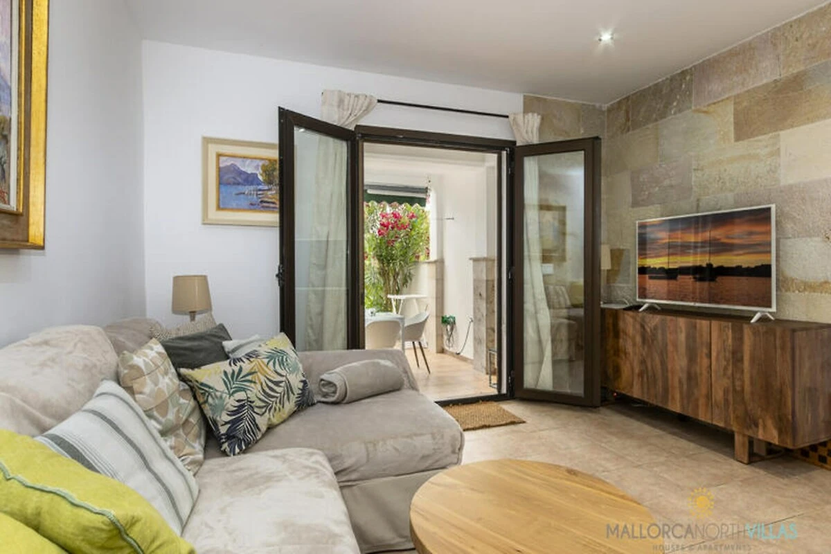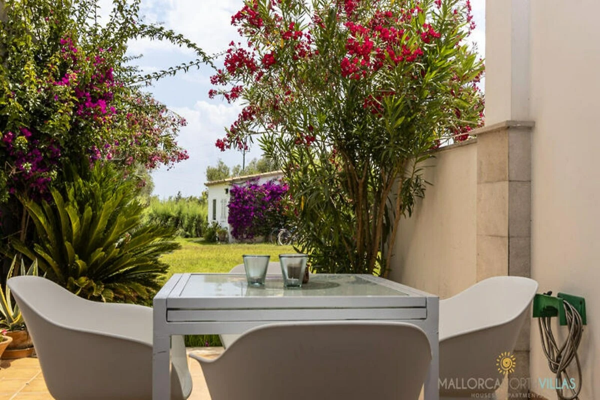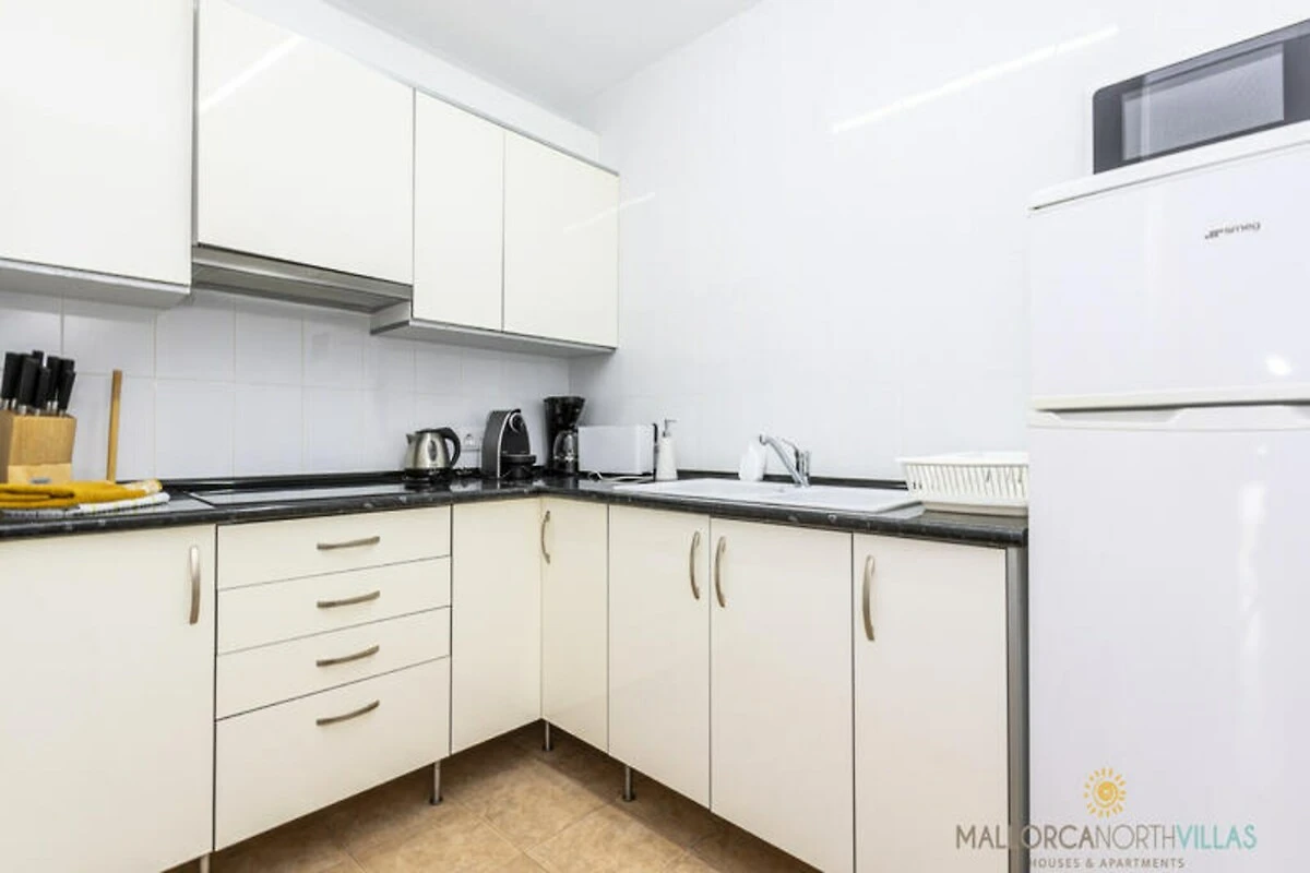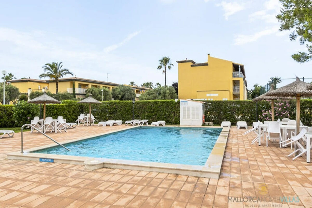 Immergetevi in un mondo di fascino mediterraneo con questo luminoso e accogliente appartamento al piano terra nell'esclusiva zona Club del Sol di Port de Pollensa, Maiorca. Circondata da rigogliosi giardini e a pochi passi dal mare scintillante, questa proprietà offre il perfetto mix di tranquillità e comodità per la vostra prossima vacanza. Immaginate di svegliarvi con la dolce brezza marina e di gustare il caffè del mattino sulla vostra terrazza privata mentre il sole sorge sul giardino. È qui che il relax incontra la spensieratezza della vita costiera. \n\nAll'interno, l'appartamento vanta due comode camere matrimoniali e un bagno moderno con un'elegante doccia. L'ampia zona giorno e pranzo è inondata di luce naturale, grazie alle ampie vetrate che si aprono sulla terrazza. Una cucina separata completamente attrezzata semplifica la preparazione dei pasti, sia che vogliate assaporare le prelibatezze locali di Maiorca o godervi una cena tranquilla a casa. Con aria condizionata in tutte le stanze, Wi-Fi gratuito e TV satellitare, ogni dettaglio è stato progettato per il vostro comfort e la vostra comodità. La piscina condominiale è un rifugio rinfrescante, perfetto per rilassarsi dopo una giornata di esplorazione. Situato in una tranquilla zona residenziale, questo appartamento è ideale sia per il relax che per l'avventura. La fermata dell'autobus è a soli 100 metri e il vivace centro di Puerto de Pollensa è a solo 1 km dalla porta di casa. Per gli amanti della spiaggia, le distese sabbiose più lunghe della zona distano solo 2 km, offrendo infinite opportunità per prendere il sole, nuotare e praticare sport acquatici. Con tutto così vicino, non avrai nemmeno bisogno dell'auto per vivere il meglio di questa incantevole destinazione. Che tu stia cercando una fuga romantica o una fuga in famiglia, questo appartamento è la tua porta d'accesso alla magia di Maiorca. Prenota ora e lascia che la bellezza di Puerto de Pollensa crei ricordi che dureranno una vita.