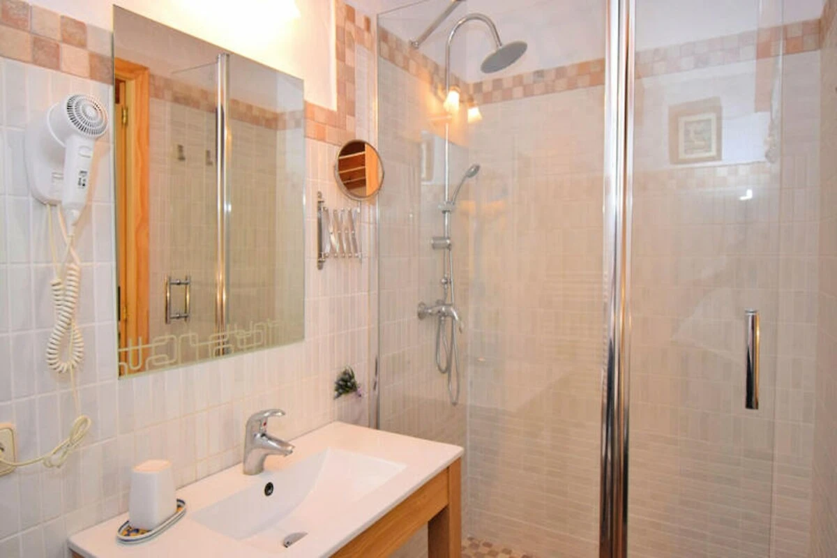 Con una superficie di 280 m², la villa può ospitare fino a 10 persone in cinque camere da letto progettate con cura, di cui tre matrimoniali e due doppie. Gli interni fondono l'eleganza rustica con i comfort moderni, con un'accogliente zona soggiorno-pranzo completa di TV satellitare, lettore DVD e WiFi. La cucina completamente attrezzata è perfetta per preparare deliziosi piatti mediterranei, mentre il camino offre un'atmosfera calda per serate rilassanti. L'aria condizionata garantisce il massimo comfort in tutta la casa e tre bagni, di cui uno con vasca angolare, soddisfano le vostre esigenze.