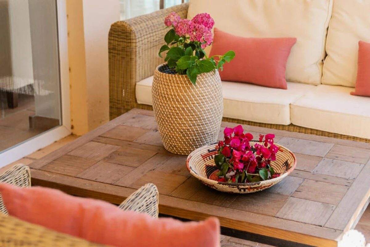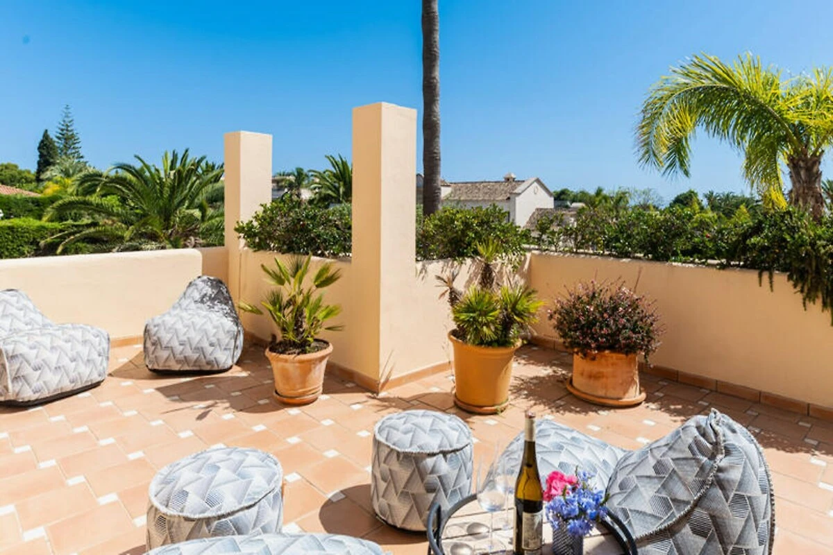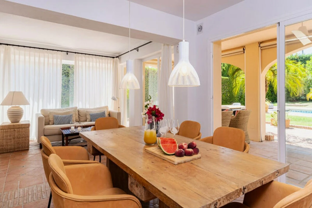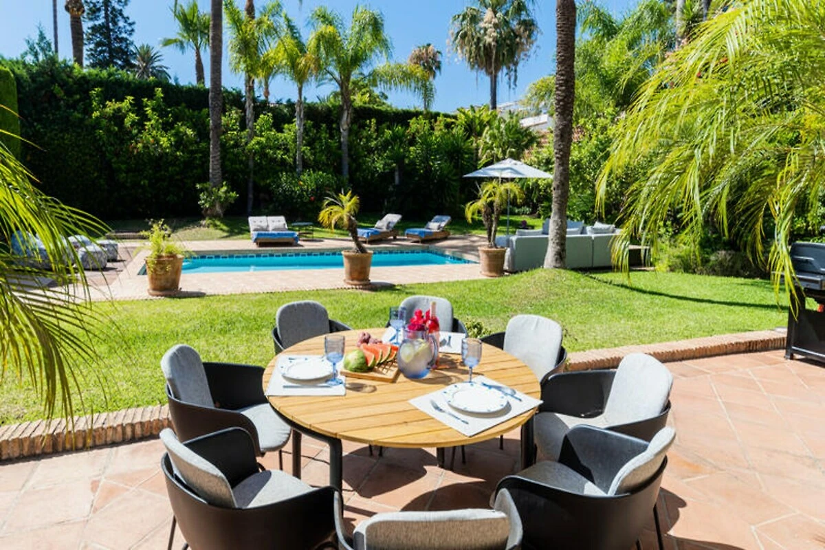 Gli spazi esterni della villa sono altrettanto accattivanti. Una grande piscina, circondata da lettini prendisole, un divano da esterno e pouf, offre l'ambiente ideale per rilassarsi sotto il sole andaluso. Il rigoglioso giardino offre privacy e tranquillità, rendendolo un rifugio per famiglie o gruppi di amici.