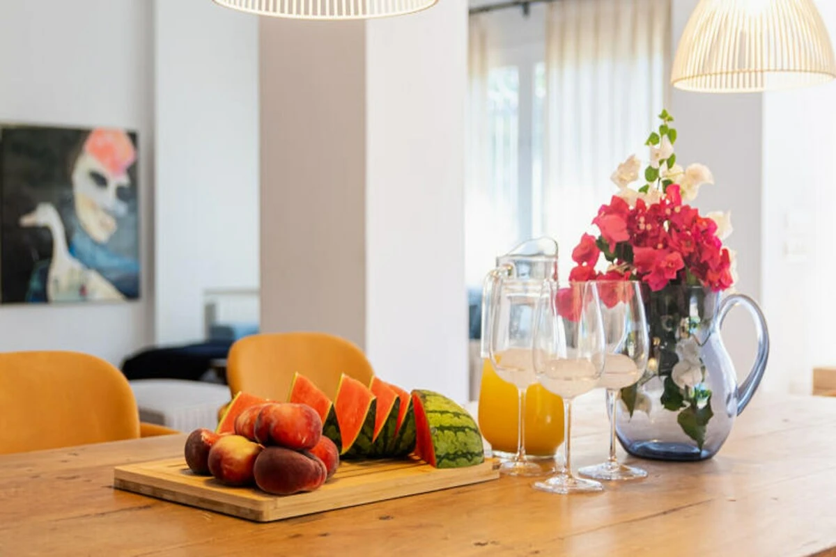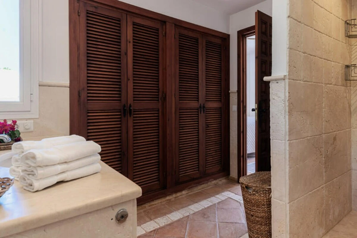 Varcate l'antica porta in legno ed entrate in un mondo di eleganza. La disposizione della villa è stata attentamente progettata, con quattro camere da letto splendidamente arredate al primo piano. La camera da letto principale vanta un bagno privato e un balcone privato con un'accogliente area salotto, ideale per godersi il panorama. Una camera da letto per bambini con due letti singoli e una camera singola condividono un bagno, mentre un'ulteriore camera matrimoniale dispone di un proprio bagno privato. Al piano terra, un'incantevole camera da letto con letto matrimoniale e bagno privato si apre direttamente sulla terrazza e sul giardino. L'ampio soggiorno, completo di morbidi divani e una grande TV a schermo piatto, si fonde armoniosamente con la zona pranzo e la cucina blu completamente attrezzata, perfetta per creare pasti memorabili. La terrazza coperta, con il suo invitante divano e il tavolo da pranzo, è il luogo perfetto per cenare all'aperto, completa di barbecue per le serate estive.