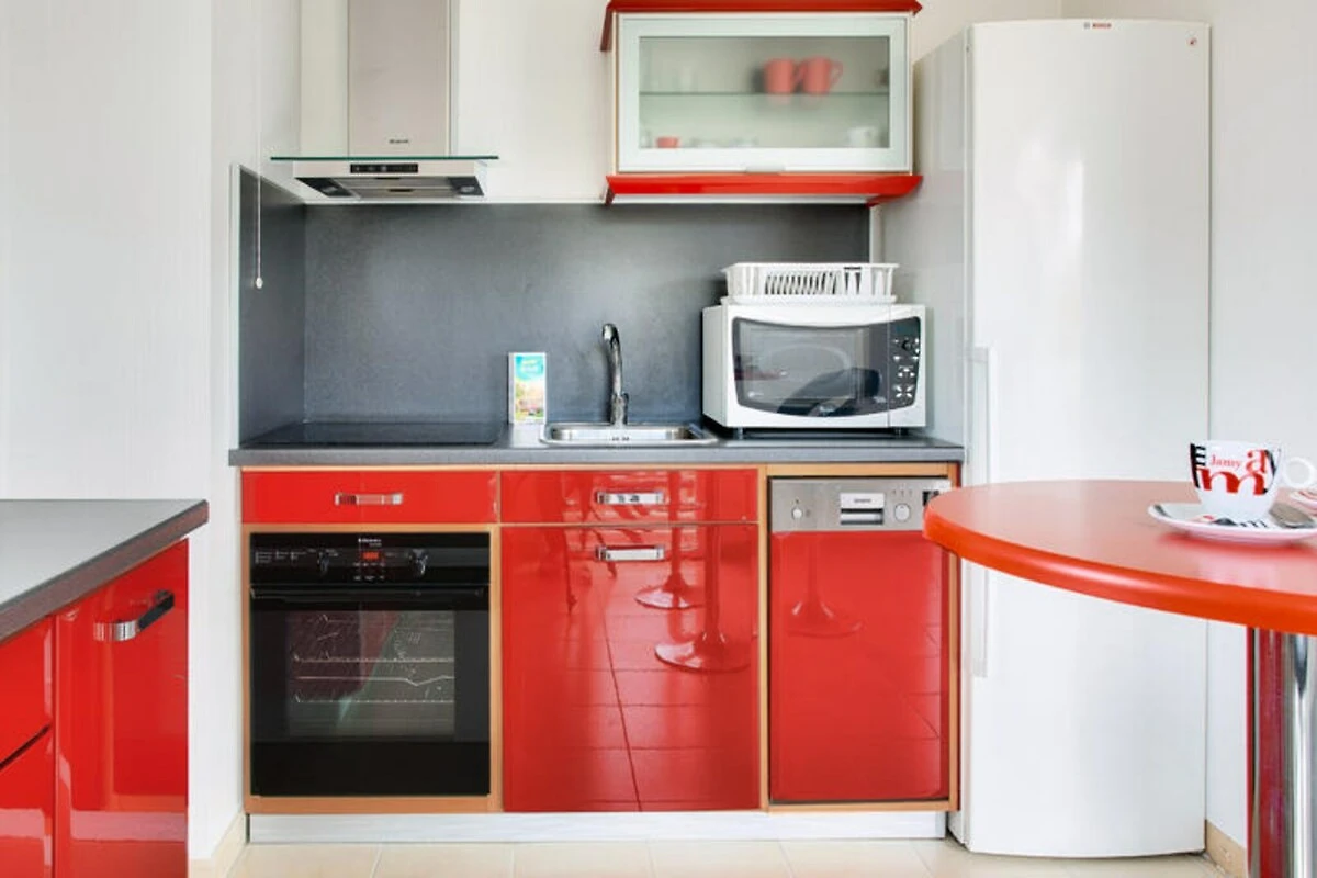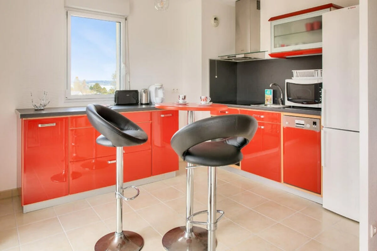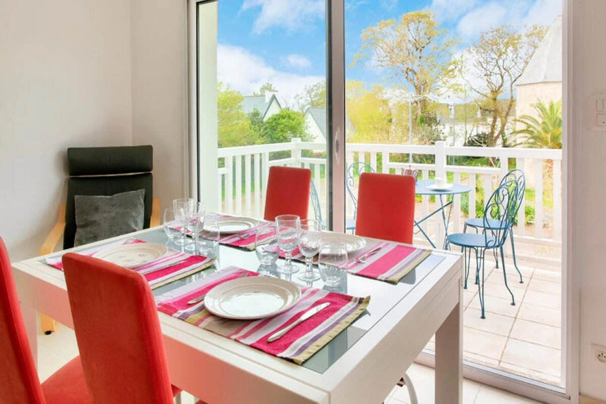 Nel cuore di Fouesnant, dove il fascino della Bretagna incontra il fascino del mare, questo delizioso appartamento offre una serena fuga sulla costa. Immagina di iniziare la giornata con una tazza di caffè sull'ampio balcone, con vista sulla tranquillità circostante, o di concludere la giornata con un delizioso barbecue al tramonto. Le ampie finestre dell'appartamento inondano la zona giorno di luce naturale, creando un'atmosfera calda e accogliente, perfetta per rilassarsi o riunirsi con i propri cari. La zona pranzo, situata di fronte alla vetrata, è il luogo ideale per condividere i pasti ammirando il panorama, e la vivace cucina in stile americano, di un rosso acceso, è completamente attrezzata con elettrodomestici moderni per rendere la cucina un piacere.