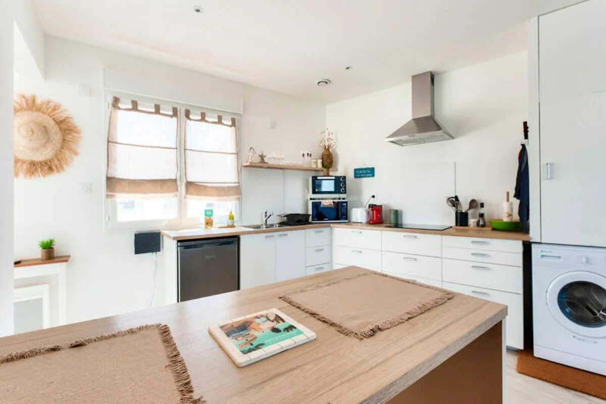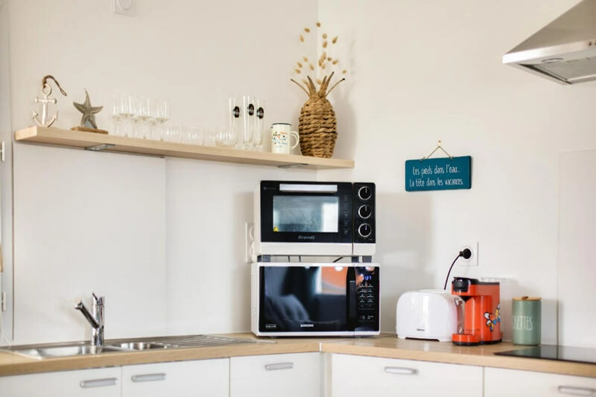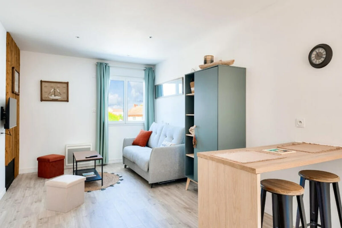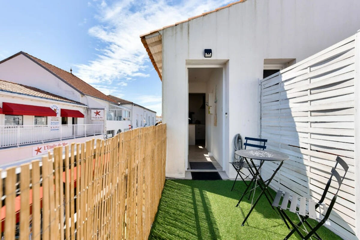 Entrate nel cuore di La Tranche-sur-Mer, dove il ritmo della vita di mare incontra il vibrante pulsare delle notti estive. Questo grazioso monolocale per due, situato sopra un vivace ristorante, offre il rifugio perfetto per chi cerca la vicinanza alla spiaggia, la vivace vita notturna e il fascino di un villaggio costiero. Fin dal vostro arrivo, la terrazza che si affaccia sulla strada e offre scorci dell'oceano vi invita a immergervi nell'atmosfera di questa destinazione dinamica. Che si tratti del suono delle onde o del brusio della vita locale, ogni momento qui sembra vivo. All'interno, il monolocale vi accoglie con una cucina a pianta aperta recentemente ristrutturata, dotata di elettrodomestici moderni, tra cui piano cottura a induzione, frigorifero, microonde, forno e altro ancora. La moderna zona pranzo, completa di tavolo alto e sgabelli da bar, è il luogo ideale per pasti intimi o conversazioni informali. Il soggiorno dispone di un comodo divano letto, perfetto per rilassarsi con un film o ricaricarsi dopo una giornata di esplorazione. Un elegante bagno con doccia, lavandino e WC aggiunge ulteriore comfort, mentre una lavatrice garantisce praticità per soggiorni più lunghi. \n\nOltre lo studio, la posizione è fantastica. A pochi passi da \