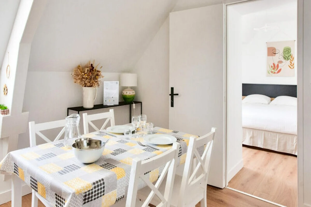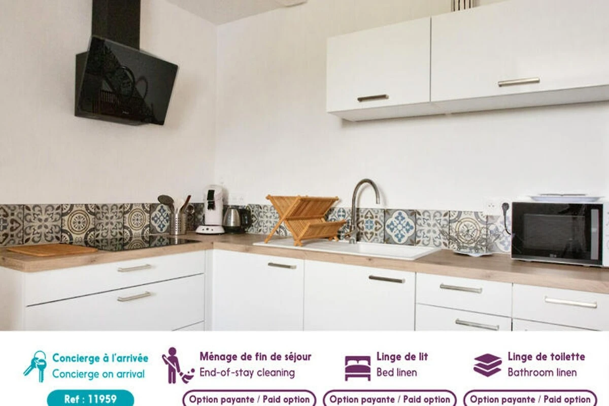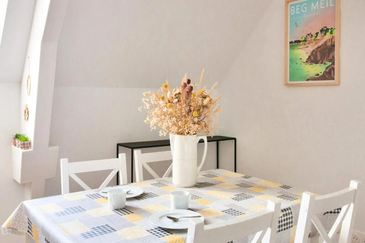 A due passi dalla scintillante costa di Fouesnant, questo grazioso appartamento vi invita a immergervi nella tranquilla bellezza della Bretagna. Grazie alla sua posizione privilegiata, vicino a spiagge sabbiose, ristoranti caratteristici e negozi locali, ogni momento qui è una celebrazione della vita costiera. Che stiate passeggiando fino allo scalo di alaggio di Beg Meil, a soli 230 metri di distanza, o che stiate imbarcandovi per una gita in barca alle splendide Isole Glénan, il fascino del mare è onnipresente. Dalle pittoresche calette alle lagune turchesi, Fouesnant è un paradiso per gli amanti della natura e del mare. \n\nEntrate in questo rifugio splendidamente decorato e sentitevi subito a casa. La zona giorno, con il suo accogliente salotto e l'invitante sala da pranzo, è perfetta per rilassarsi dopo una giornata di esplorazione. La moderna cucina, dotata di piano cottura a induzione, microonde, forno e macchina da caffè Senseo, rende la preparazione dei pasti un piacere, che si tratti di preparare un banchetto di pesce o di sorseggiare un caffè mattutino. Progettato per il comfort, l'appartamento può ospitare fino a quattro persone in una tranquilla camera da letto con letto matrimoniale e bagno privato, completata da un divano letto per ulteriori posti letto. Oltre agli interni eleganti, la proprietà offre servizi pratici come lavatrice-asciugatrice, asciugacapelli, deposito biciclette e parcheggio privato. Il vicino panificio, i ristoranti e i supermercati garantiscono la massima comodità, mentre le spiagge sabbiose di Beg Meil e Kermyl promettono giornate indimenticabili in riva al mare. Per chi cerca l'avventura, il centro città, la stazione ferroviaria di Quimper e la Baie de la Forêt sono tutti facilmente raggiungibili. Che siate attratti dalla promessa di pesce fresco, dal fascino dei paesaggi bretoni o dalla serenità della vita costiera, questo appartamento è la porta d'accesso a una fuga indimenticabile. Lasciate che il servizio concierge migliori il vostro soggiorno con un'assistenza personalizzata, assicurando che ogni dettaglio sia curato. Benvenuti nel vostro santuario sul mare a Fouesnant.