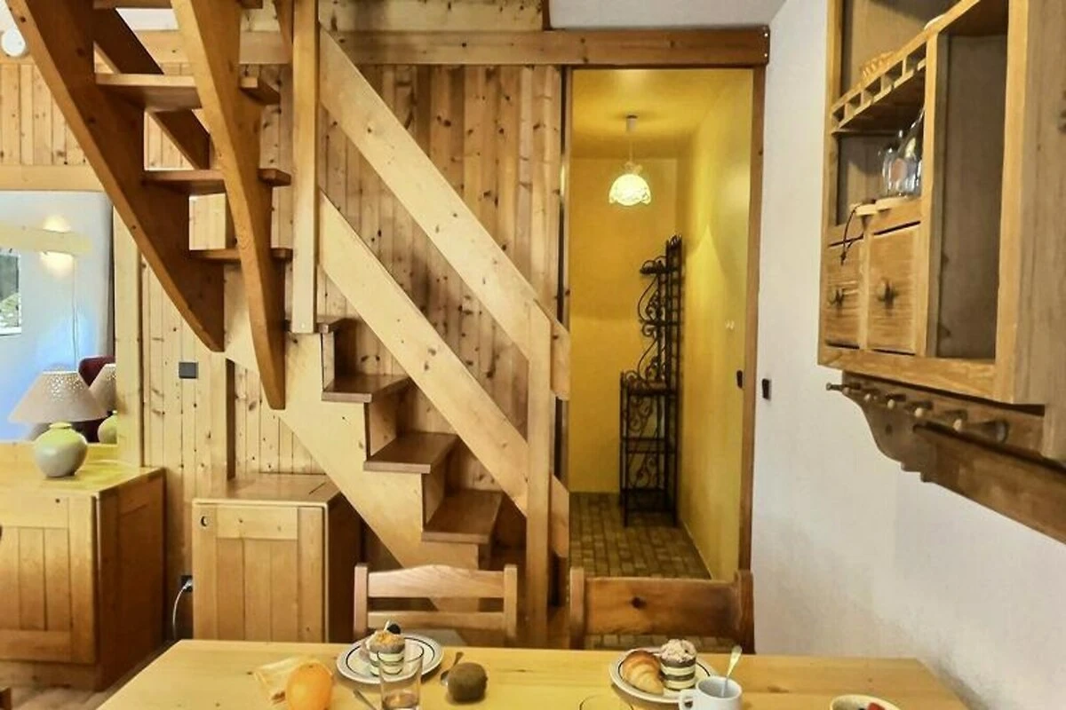 Internamente, il monolocale di 42 m² è progettato con cura per ospitare fino a sei persone. Il soggiorno vanta due letti estraibili, mentre il soppalco offre un comodo letto matrimoniale per notti di riposo. La cucina completamente attrezzata, completa di piano cottura a induzione, forno a microonde, lavastoviglie e frigorifero, vi invita a preparare pasti abbondanti per dare energia alle vostre avventure. Un bagno moderno con ampia doccia e WC separato aggiunge ulteriore comfort, mentre servizi come TV, armadietto per gli sci e parcheggio coperto garantiscono la massima comodità durante il soggiorno.