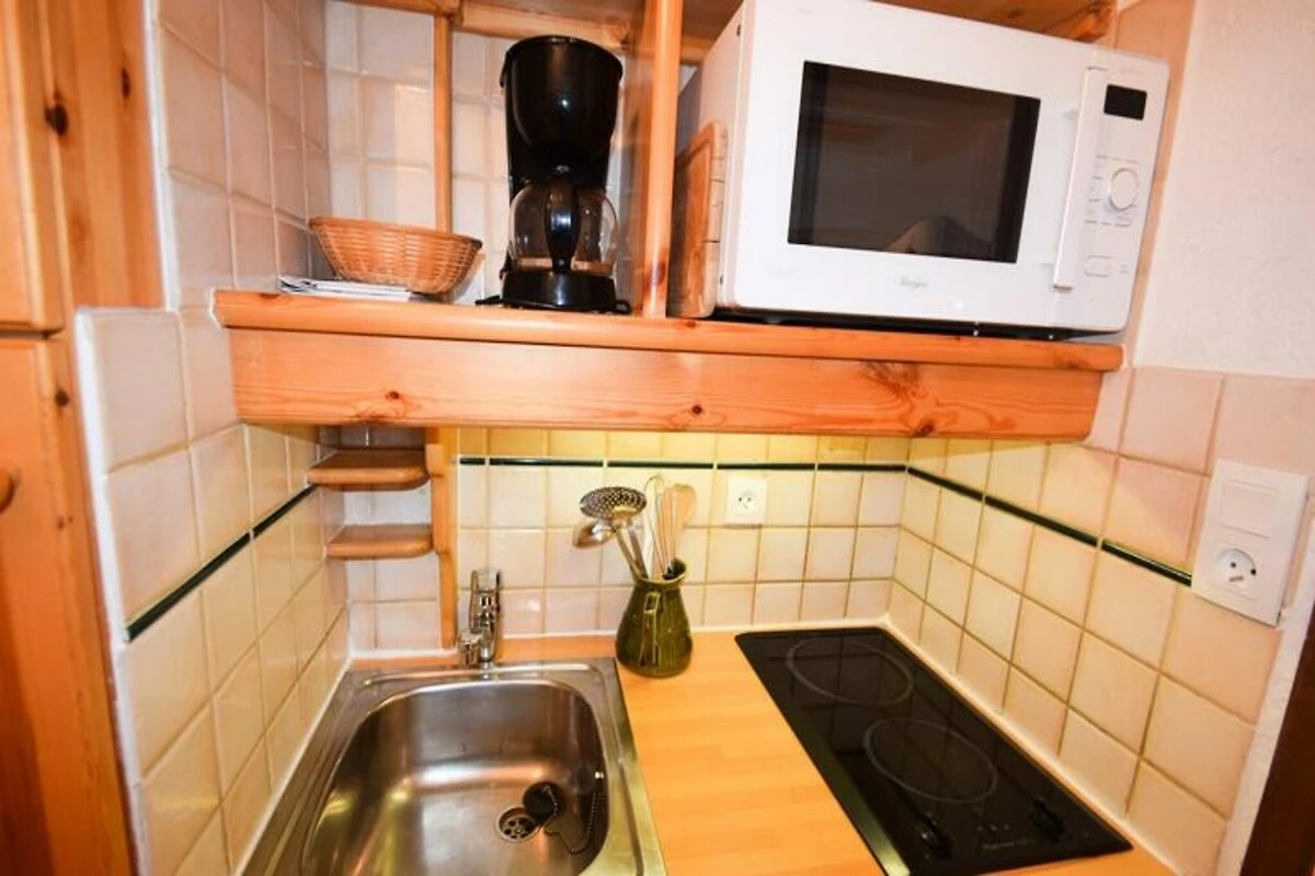 Immagina di svegliarti con la vista mozzafiato del Monte Bianco e l'ampia vista sulla valle dal tuo accogliente monolocale nel cuore di Plagne Centre. Questo affascinante rifugio, situato al primo piano del rinomato Residence LE FRANCE, offre la perfetta fuga alpina per coppie o piccoli gruppi in cerca di un mix di comfort e praticità. Con accesso diretto alle piste da sci, la tua avventura inizia non appena metti piede fuori, rendendolo una base ideale per esplorare le piste di livello mondiale di La Plagne. \n\nIl monolocale, progettato per 2 o 3 persone, presenta una disposizione compatta ma funzionale. La zona giorno include un comodo divano letto per due persone e un letto singolo aggiuntivo, garantendo una notte di riposo dopo una giornata sulle piste. La piccola cucina è dotata di utensili essenziali come piastre elettriche, forno a microonde e frigorifero, permettendoti di preparare pasti semplici con facilità. Il bagno, completo di vasca, offre uno spazio rilassante per il tuo relax. Dalla terrazza esposta a nord, immergetevi nella serena bellezza della valle, sebbene la rimozione della neve non sia garantita durante l'inverno. Comodamente collegato ai negozi tramite una galleria interna, il residence vi garantisce di avere tutto ciò di cui avete bisogno a portata di mano. Che si tratti di noleggiare l'attrezzatura da sci, mangiare un boccone veloce o dedicarvi alle attività après-ski, Plagne Centre ha tutto. Per una maggiore comodità, è disponibile un armadietto per gli sci, che facilita il deposito della vostra attrezzatura. Scegliete questo monolocale per la sua posizione imbattibile, la vista mozzafiato e l'accesso diretto alle piste. Che siate qui per sfrecciare su piste innevate o semplicemente per rilassarvi immersi nel fascino alpino, il Residence LE FRANCE promette una vacanza in montagna indimenticabile.