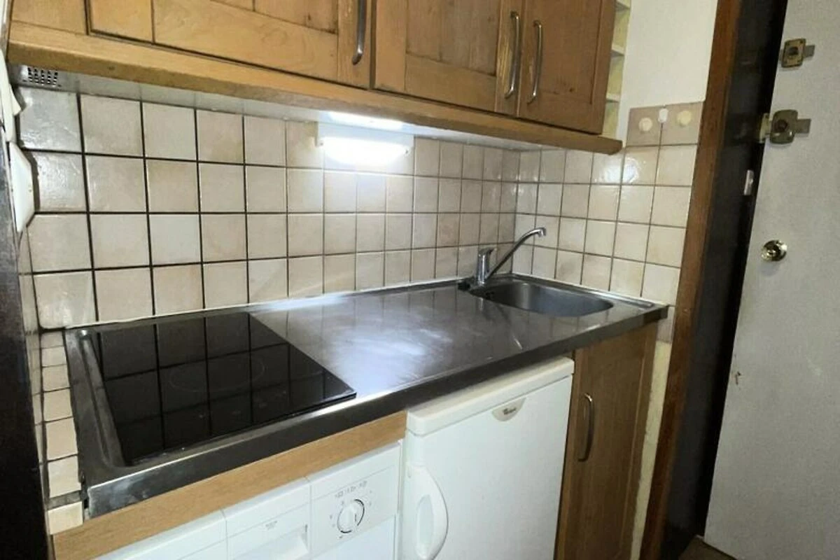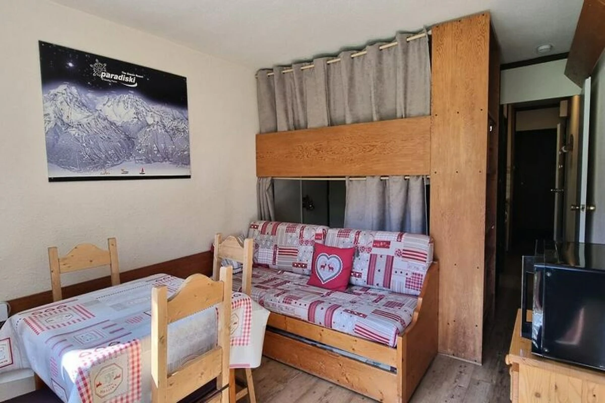 Internamente, il monolocale è progettato con cura per ospitare fino a quattro persone. La zona giorno dispone di un comodo divano letto e di un letto estraibile, mentre la zona notte include due comodi letti a castello, perfetti per famiglie o piccoli gruppi. L'angolo cottura è dotato di tutto il necessario per preparare pasti abbondanti dopo una giornata sulle piste, inclusi piani cottura in vetroceramica, forno a microonde, frigorifero e lavastoviglie. Dettagli moderni come una TV a schermo piatto e piumoni aggiungono comfort, garantendo un soggiorno rilassante. Il bagno, completo di doccia e WC, è compatto ma funzionale. Un armadietto privato per gli sci e l'accesso tramite ascensore aggiungono praticità alla vostra fuga alpina.