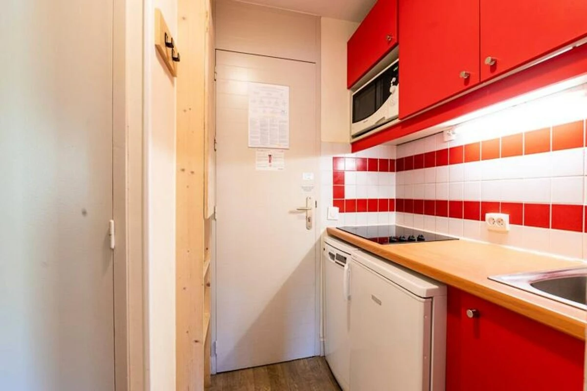Interni, l'appartamento è progettato con cura per offrire comfort e praticità. Il soggiorno, sapientemente diviso da una parete scorrevole, dispone di una zona salotto con un letto a rotelle e un divano letto, che può ospitare fino a quattro persone. Una cucina completamente attrezzata vi invita a preparare deliziosi pasti con i suoi comfort moderni, tra cui una macchina da caffè Nespresso, un piano cottura in vetroceramica e un forno a microonde. Il bagno vanta una rilassante vasca da bagno, mentre un WC separato aggiunge praticità. Ulteriori vantaggi includono un armadietto per gli sci all'ingresso del residence e un parcheggio coperto nelle vicinanze, per un soggiorno senza pensieri.