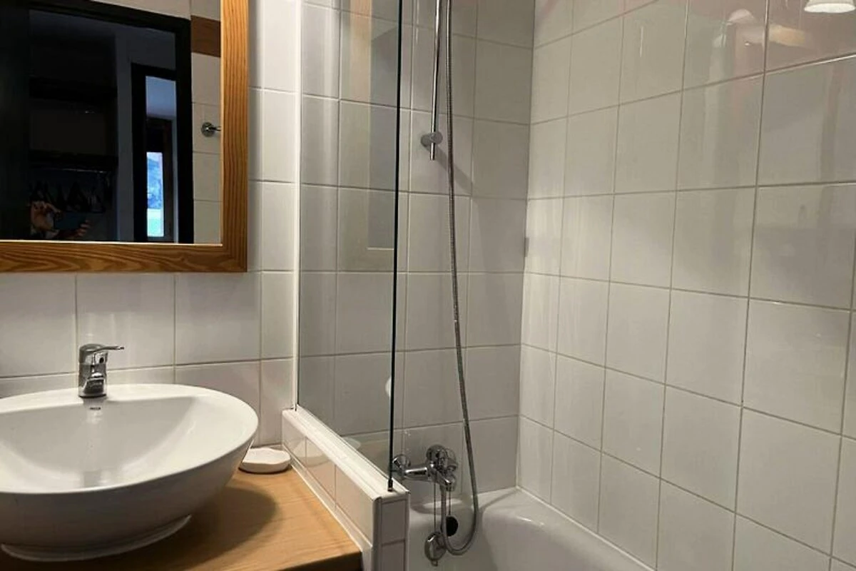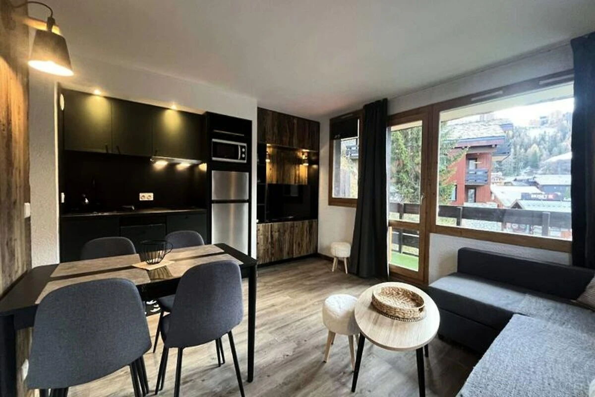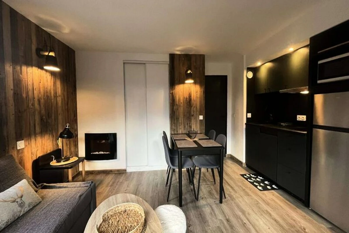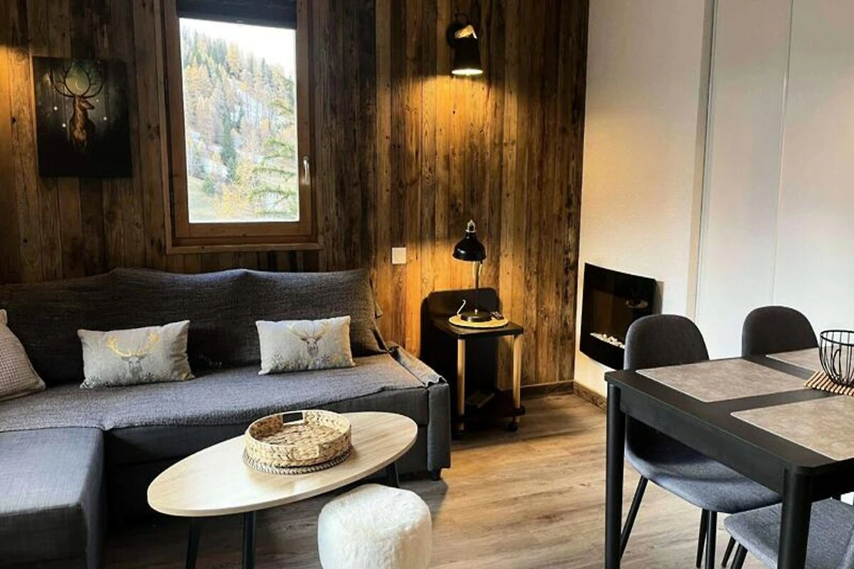 L'appartamento è stato ristrutturato con cura, fondendo il design contemporaneo con l'accogliente fascino alpino. Può ospitare comodamente fino a sei persone, ed è dotato di un soggiorno con divano letto e TV, e di una camera con letti a castello matrimoniali che offrono un rifugio accogliente. La cucina a vista è completamente attrezzata con elettrodomestici moderni, tra cui frigorifero, piano cottura in vetroceramica, forno a microonde e persino una griglia per raclette per assaporare il vero sapore delle Alpi. Ulteriori servizi, come un deposito sci e un parcheggio coperto, garantiscono un soggiorno senza pensieri.