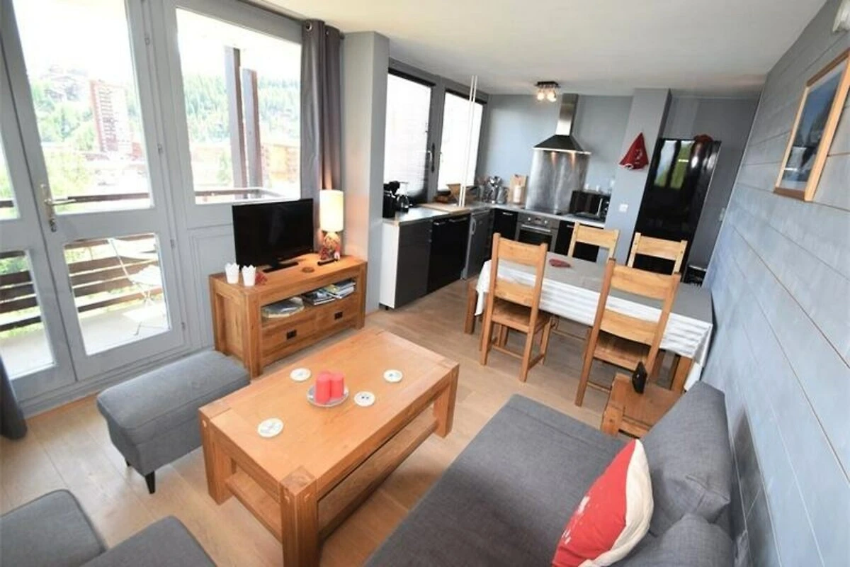In posizione dominante sulla splendida valle della Tarentaise, questo appartamento splendidamente ristrutturato offre un tranquillo rifugio alpino con vista panoramica sul Monte Bianco e sulle cime circostanti. Il residence è situato in posizione ideale, a soli 200 metri dalle piste, consentendovi di tornare sciando dopo una giornata sulle piste incontaminate di La Plagne. Che siate alla ricerca di avventura o relax, questa proprietà promette un soggiorno indimenticabile nel cuore delle Alpi francesi. \n\nEntrate in questo spazioso appartamento di 61 m², progettato con cura per ospitare fino a sette persone. La luminosa zona giorno dispone di un comodo divano letto, una zona pranzo e una cucina in stile americano completamente attrezzata con elettrodomestici moderni, tra cui piano cottura in vetroceramica, lavastoviglie, forno, microonde e due frigoriferi. La zona notte comprende un'accogliente camera matrimoniale e una seconda camera con due letti a castello, rendendolo ideale per famiglie o gruppi di amici. Due eleganti bagni con doccia, un WC separato e servizi pratici come lavatrice e Wi-Fi garantiscono un soggiorno confortevole ed elegante. L'ampio balcone vi invita a rilassarvi con un bicchiere di vino, ammirando la maestosa vista sul Monte Bianco e sulla valle sottostante. Il residence si trova a pochi passi dai negozi locali e da una vivace galleria commerciale, offrendovi un facile accesso a tutto ciò di cui avete bisogno durante il vostro soggiorno. Nelle vicinanze è disponibile un parcheggio esterno e la proprietà include due armadietti per gli sci per la vostra comodità. Oltre allo sci, la zona si trasforma in un paradiso estivo con sentieri escursionistici, percorsi per mountain bike e panorami mozzafiato che affascineranno gli amanti della natura e gli amanti dell'avventura. Che siate alla ricerca di neve fresca o di prati alpini, questo appartamento è la vostra porta d'accesso alle meraviglie di La Plagne. Prenotate subito il vostro soggiorno e create ricordi indelebili in una delle destinazioni montane più iconiche della Francia.