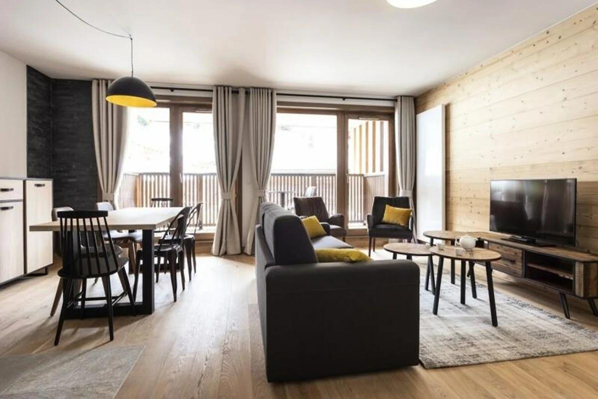 Il residence offre una serie di appartamenti progettati con cura, che fondono arredi di ispirazione montana con comfort moderni. Ogni unità emana calore e intimità, rendendola il luogo perfetto per rilassarsi dopo un'entusiasmante giornata sulle piste. L'appartamento trilocale per sei persone comprende un ampio soggiorno con divano letto, una cucina a vista completamente attrezzata, una camera matrimoniale, una camera doppia e due bagni. Servizi aggiuntivi come Wi-Fi, biancheria da letto inclusa e parcheggio coperto garantiscono un soggiorno senza pensieri. Per le famiglie, sono disponibili kit per neonati su richiesta, mentre i proprietari di animali domestici sono benvenuti previo accordo.