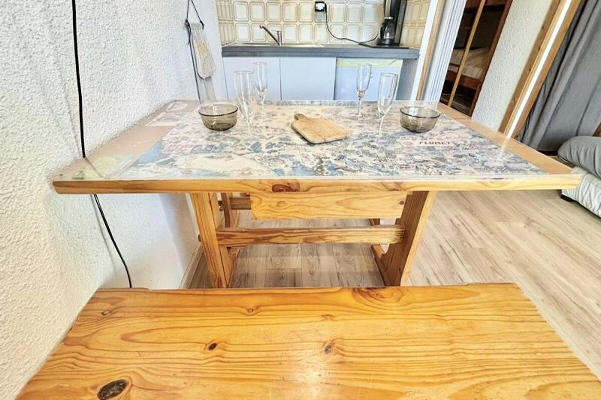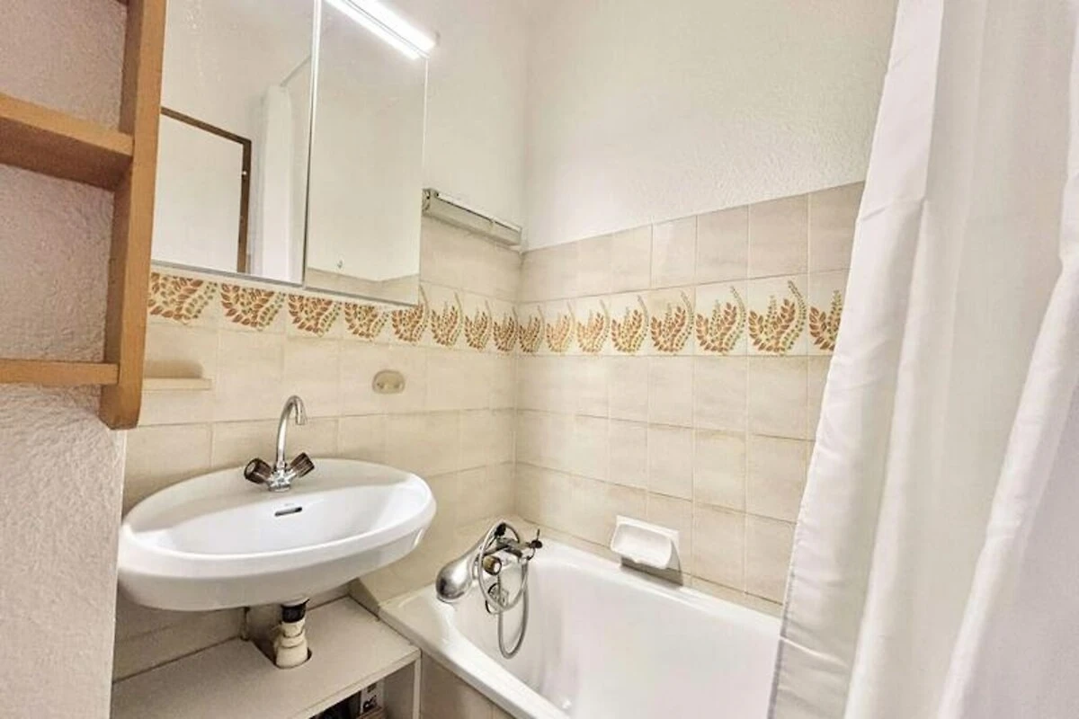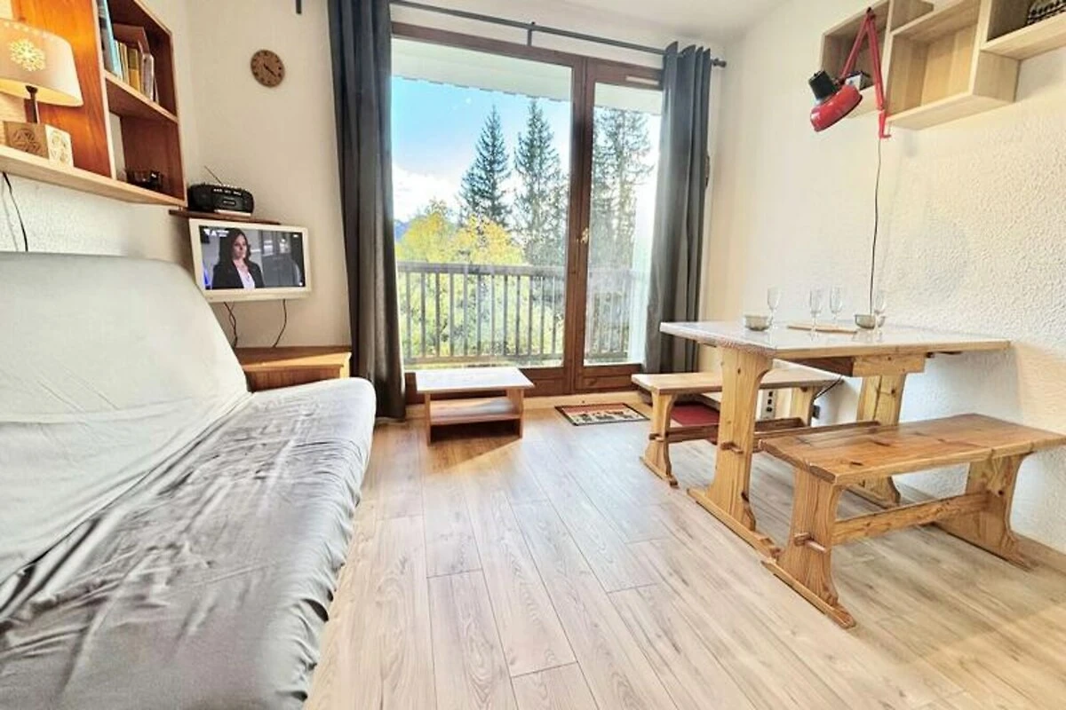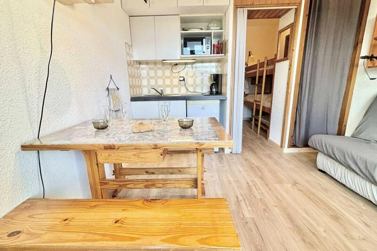 Compatto ma progettato con cura, il monolocale di 19 m² dispone di un accogliente soggiorno con un comodo divano letto, un pratico angolo cottura per preparare pasti abbondanti e un bagno con tutto il necessario. L'ingresso include due letti a castello, ideali per famiglie o piccoli gruppi, sebbene il letto superiore non sia adatto a bambini di età inferiore ai sei anni. Un armadietto per gli sci garantisce che la vostra attrezzatura sia sempre pronta, mentre il parcheggio esterno non riservato aggiunge praticità al vostro soggiorno.