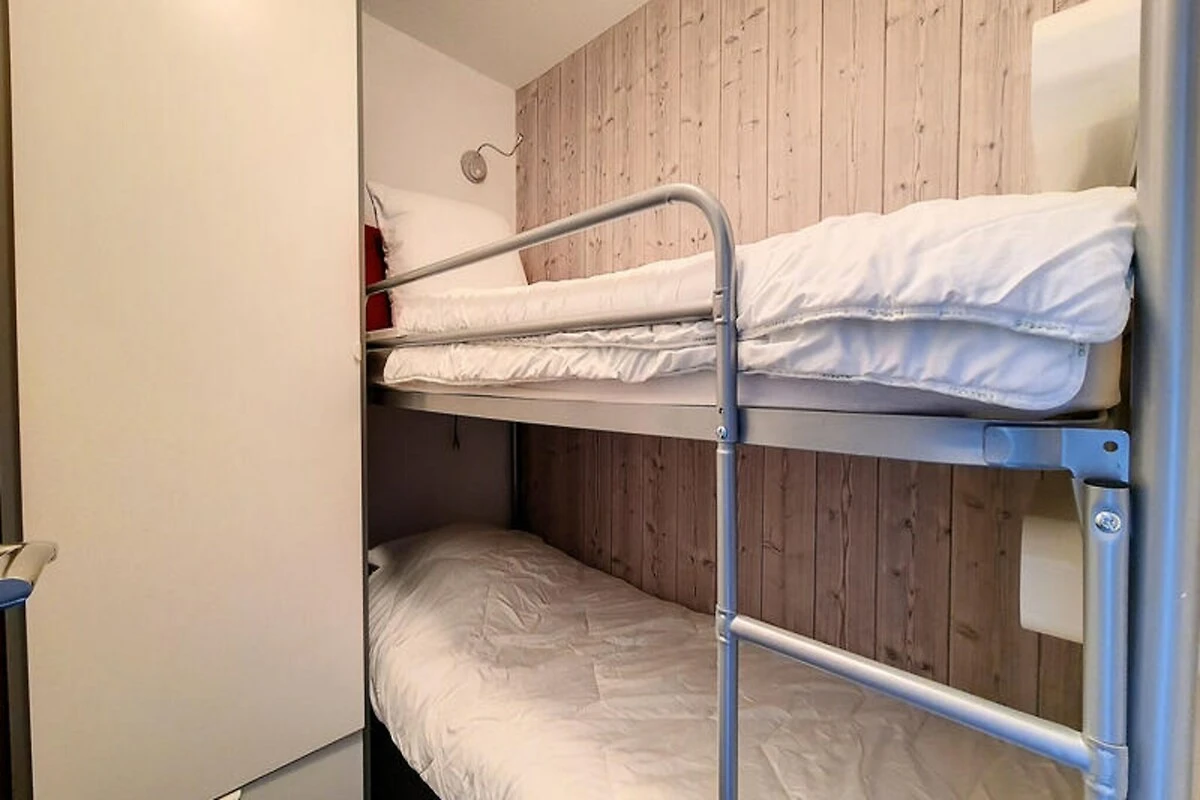 L'appartamento di 27 m² è stato progettato con cura per massimizzare il comfort e la funzionalità. Il soggiorno dispone di un divano letto per due, mentre la zona notte separata, chiusa da una porta scorrevole, offre un letto matrimoniale con luce naturale che filtra dalla finestra. Un'accogliente cabina con letti a castello è perfetta per i bambini o per gli ospiti aggiuntivi. La cucina completamente attrezzata include elettrodomestici moderni come lavastoviglie, forno a microonde e macchina per il caffè, garantendovi tutto il necessario per preparare i vostri pasti in casa. Il bagno vanta un'elegante doccia e il WC separato aggiunge praticità.